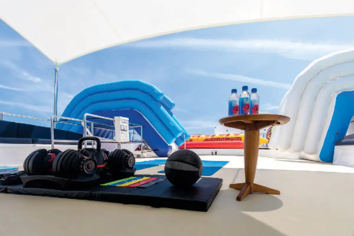 She carries a 20ft RIB for waterskiing, wakeboarding, inflatable tows and beach landings – how about a leisurely Champagne brunch on the white sand beach of an unspoiled cay? Her 34ft centre console powerboat is on hand for longer-range excursions, fishing trips and visits to remote restaurants and bars with private jetties. Back on board, you can tackle the climbing wall and then plunge back into the sea for a cooling dip via the giant water slide.