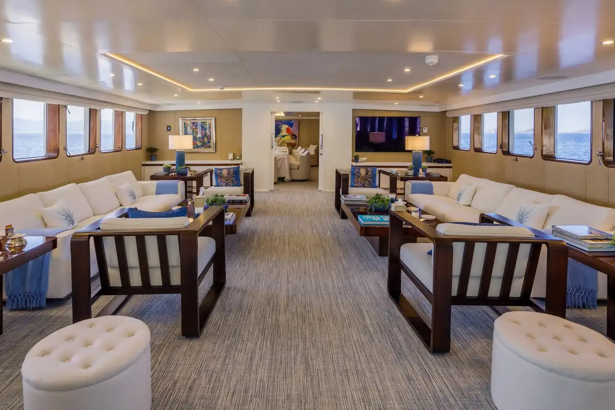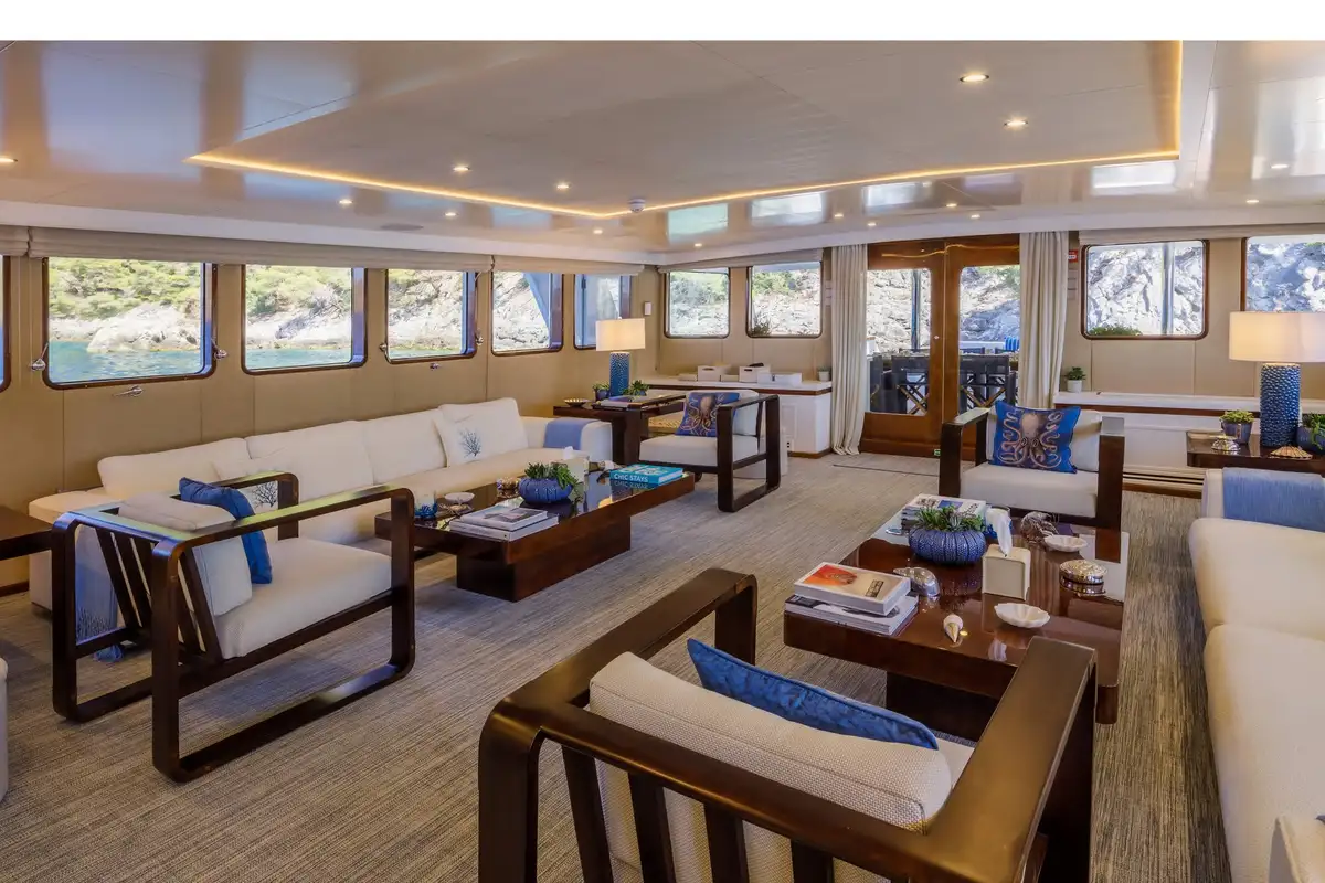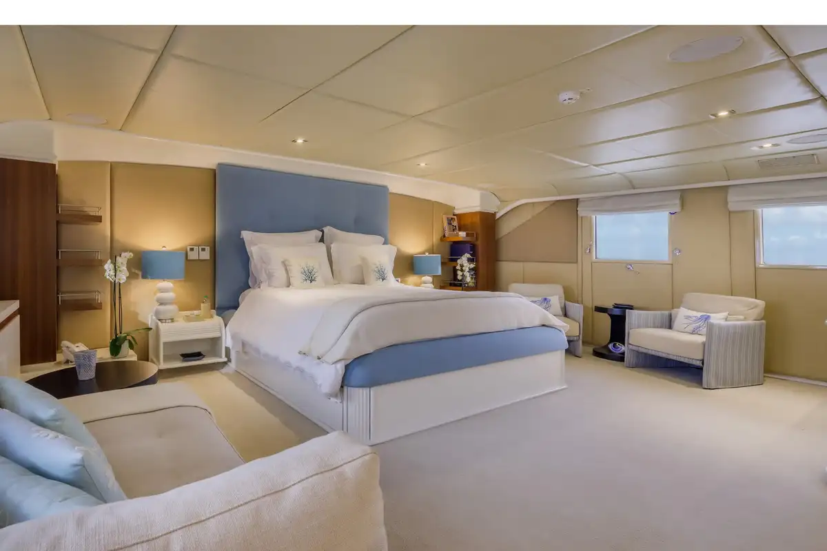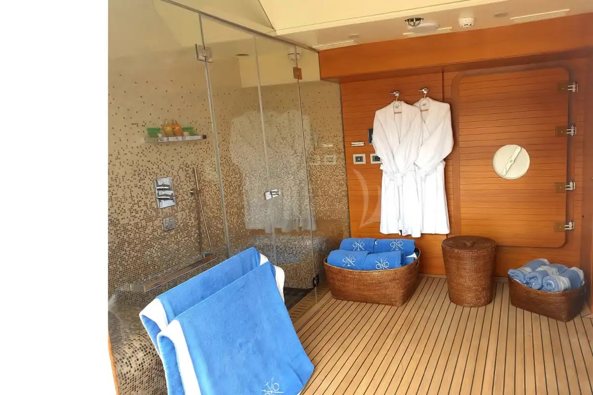 She offers a fantastic array of inside and outside social spaces and dining areas. Her newly pristine main deck saloon is a refined yet welcoming lounge with brand new high-end furnishings, great sea views and plenty of natural light. Also on the main deck there’s a vast, separate dining area for stylish formal occasions and entertaining, while her intimate sky lounge on the upper deck provides a relaxed, comfortable haven for tranquil relaxation and cosy movie nights. /p>