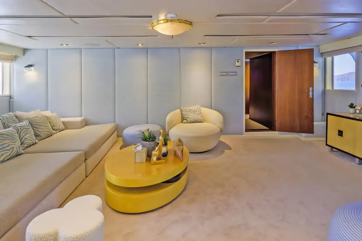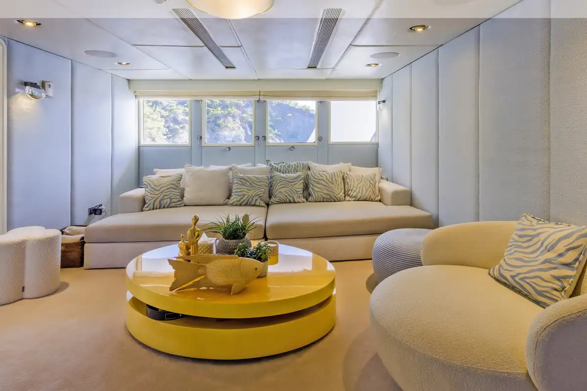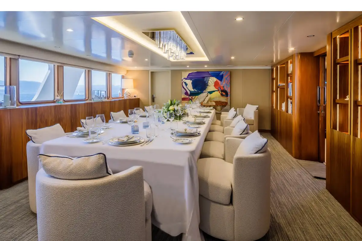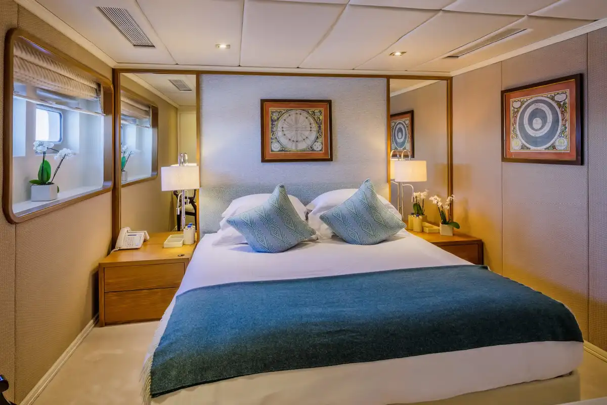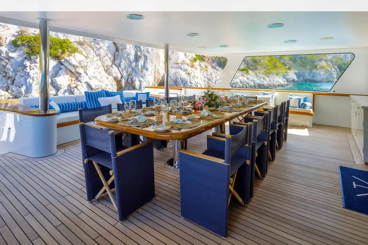 She offers a fantastic array of inside and outside social spaces and dining areas. Her newly pristine main deck saloon is a refined yet welcoming lounge with brand new high-end furnishings, great sea views and plenty of natural light. Also on the main deck there’s a vast, separate dining area for stylish formal occasions and entertaining, while her intimate sky lounge on the upper deck provides a relaxed, comfortable haven for tranquil relaxation and cosy movie nights. /p>