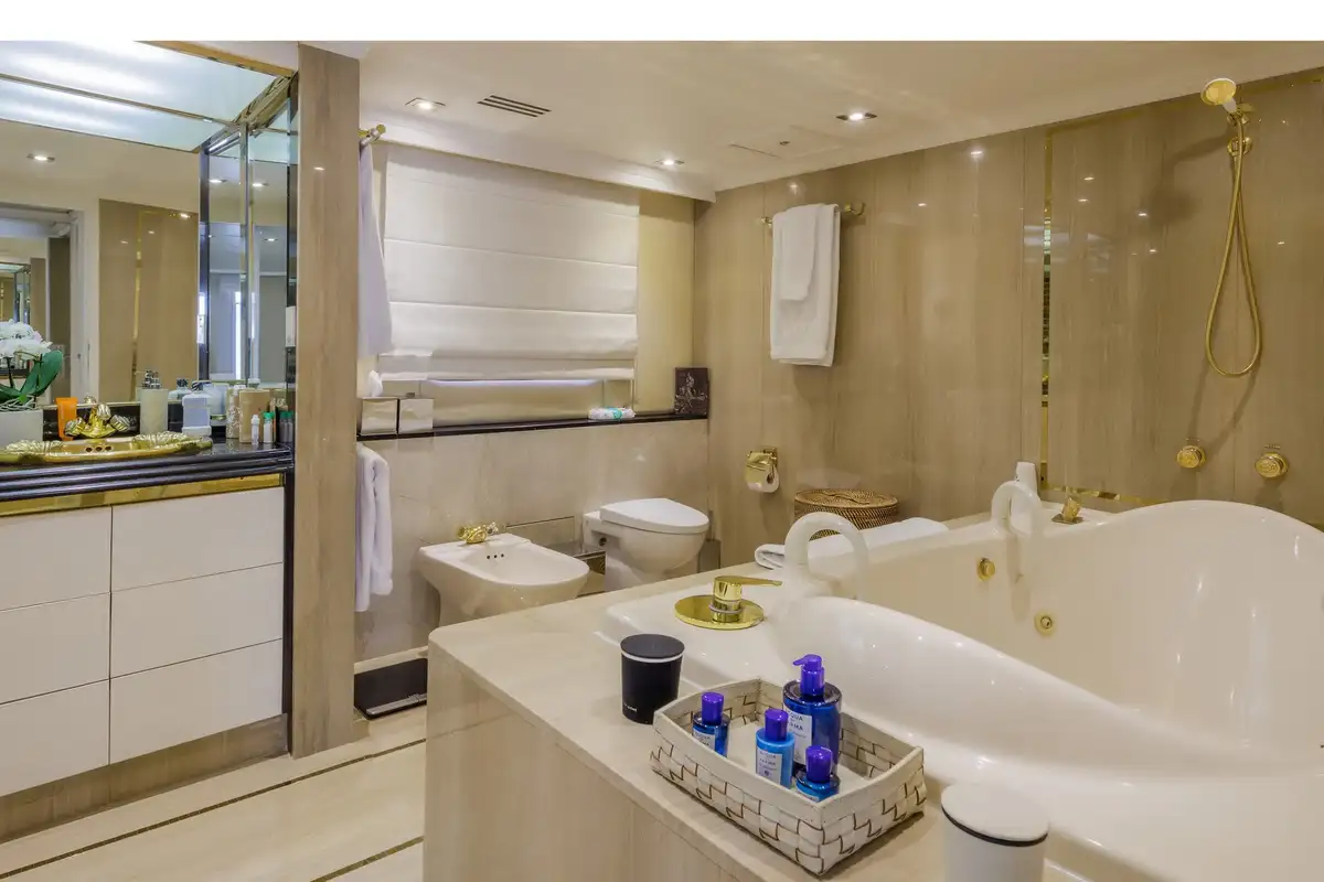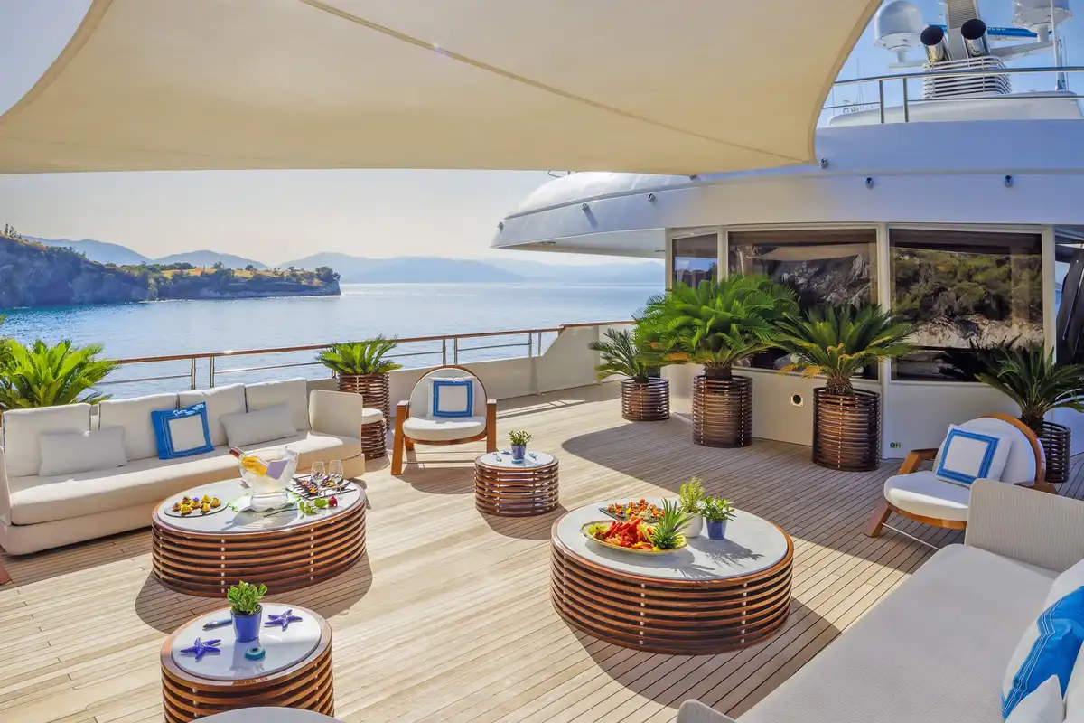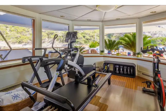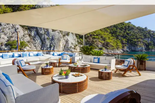 Just a few of the onboard highlights are the well-shaded outdoor spaces on several levels, the beach club with a dedicated sauna room and the large open-air lounge on the foredeck with a big spa pool and a commanding view over the sea. Key practical features include fast, reliable wi-fi and high-spec air conditioning throughout, very effective stabilisers to smooth her motion at all times, whether you’re out at sea or anchored in a bay, and a well-equipped gym on the upper deck with a grand sweep of windows.