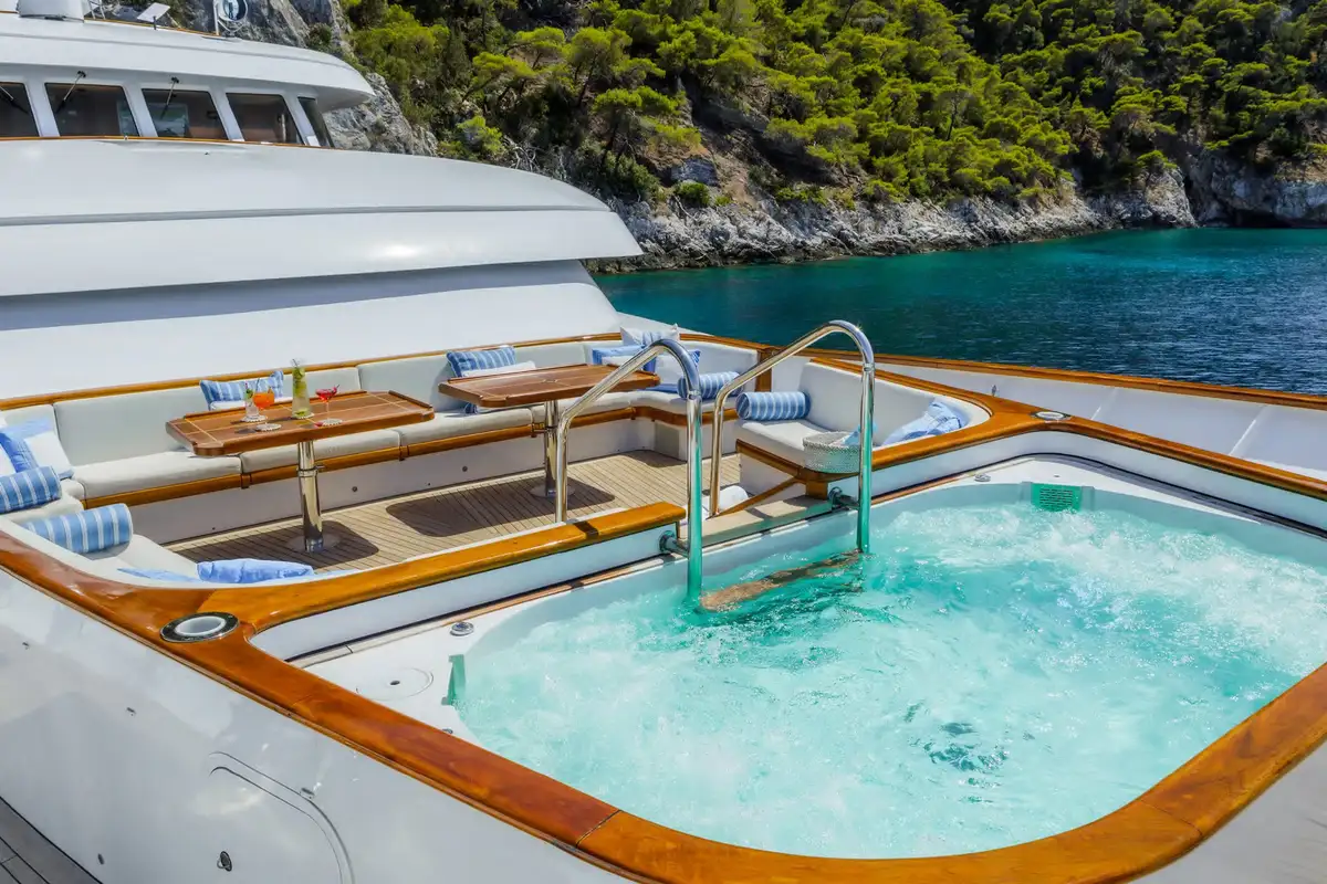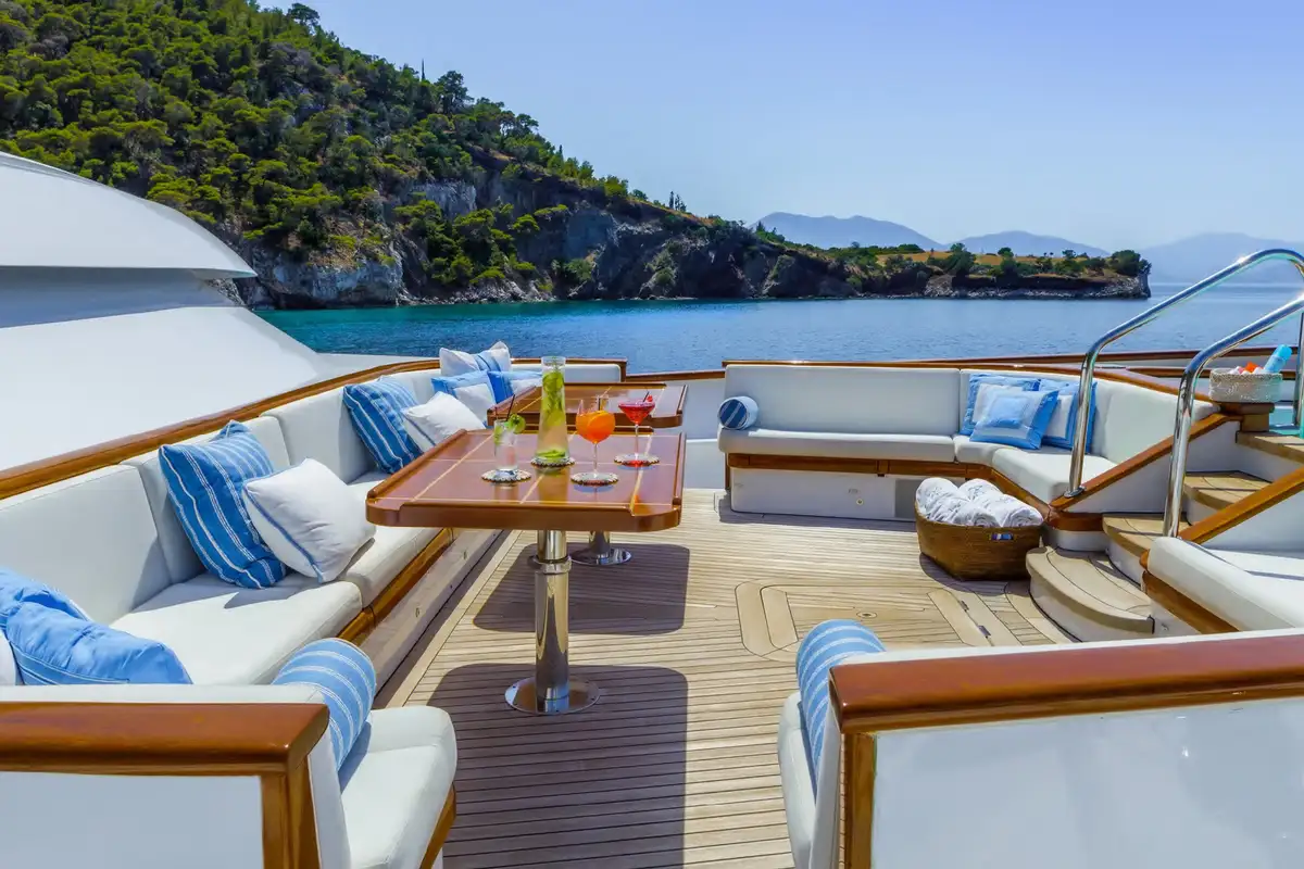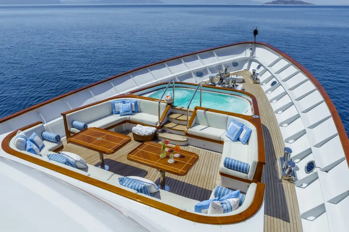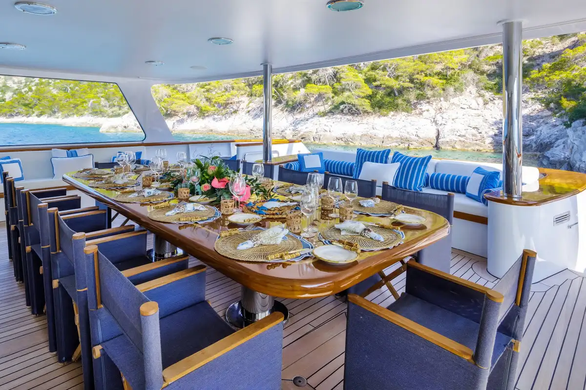 Designed to host 12 people in eight cabins with attentive service from 15 crew, her versatile guest accommodation is ideal for a holiday cruise with family or friends – or both – on the warm blue waters of the Aegean Sea. The full-beam master suite in the bow is your private haven with armchairs and a sofa flanking the king size bed and a two-person bathtub in the en suite bathroom. There’s also a VIP suite, two double cabins and two twins, all with private en suite facilities.