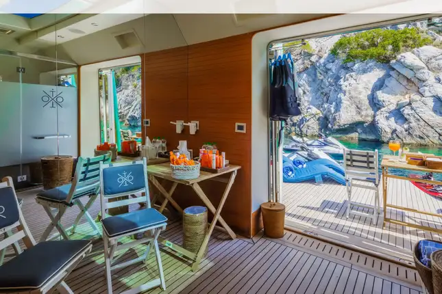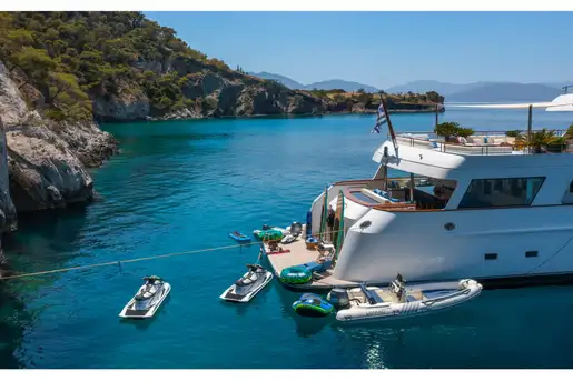 Another big benefit is an expert local captain who knows the hundreds of harbours and thousands of secluded coves in this world class yachting area like the back of his hand. Wherever you choose to cruise, there’s a fantastic fleet of small craft and toys to keep you thrilled when the anchor goes down and the stern lines are tied to shore. She has two large RIB tenders for waterskiing, wakeboarding and towable fun, plus jet skis, a jetsurf and a water jet flyboard, SeaBobs, snorkel, dive and fishing gear, kayaks, SUPs and more.