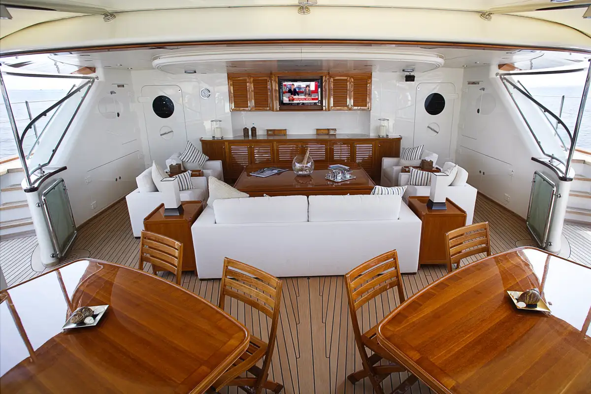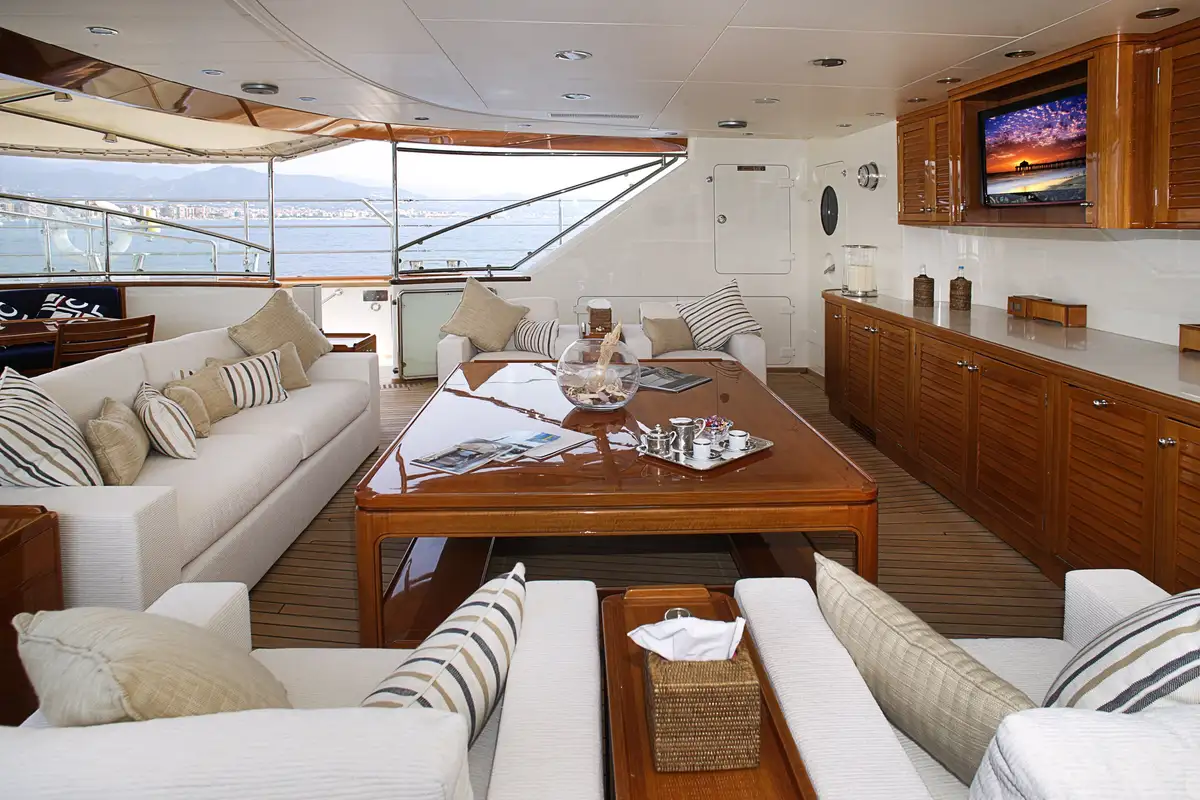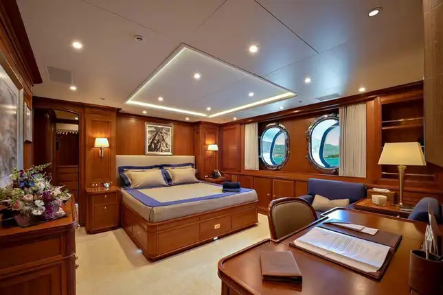 The traditionally styled interior layout accommodates up to 10 guests in 5 cabins. There is a double suite with a sofa, desk and walk-in wardrobe, 2 double cabins and 2 twin cabins - all en suite. There is a separate dining area off the lounge and an incredibly expansive living area in the cockpit. The décor is classical and elegant with varnished wood, cream fabrics and smart accents of nautical navy blue in the soft furnishings.