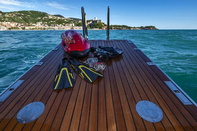 A staircase leads to the lazarette to access the hydraulic swim platform for easy tender boarding and allows guest to make full use of the water toys with direct access to the water. A side boarding ladder is also available.