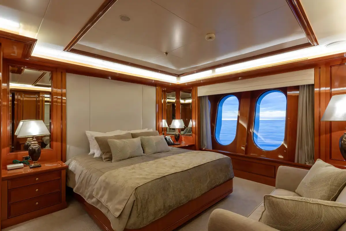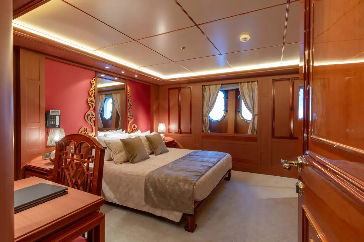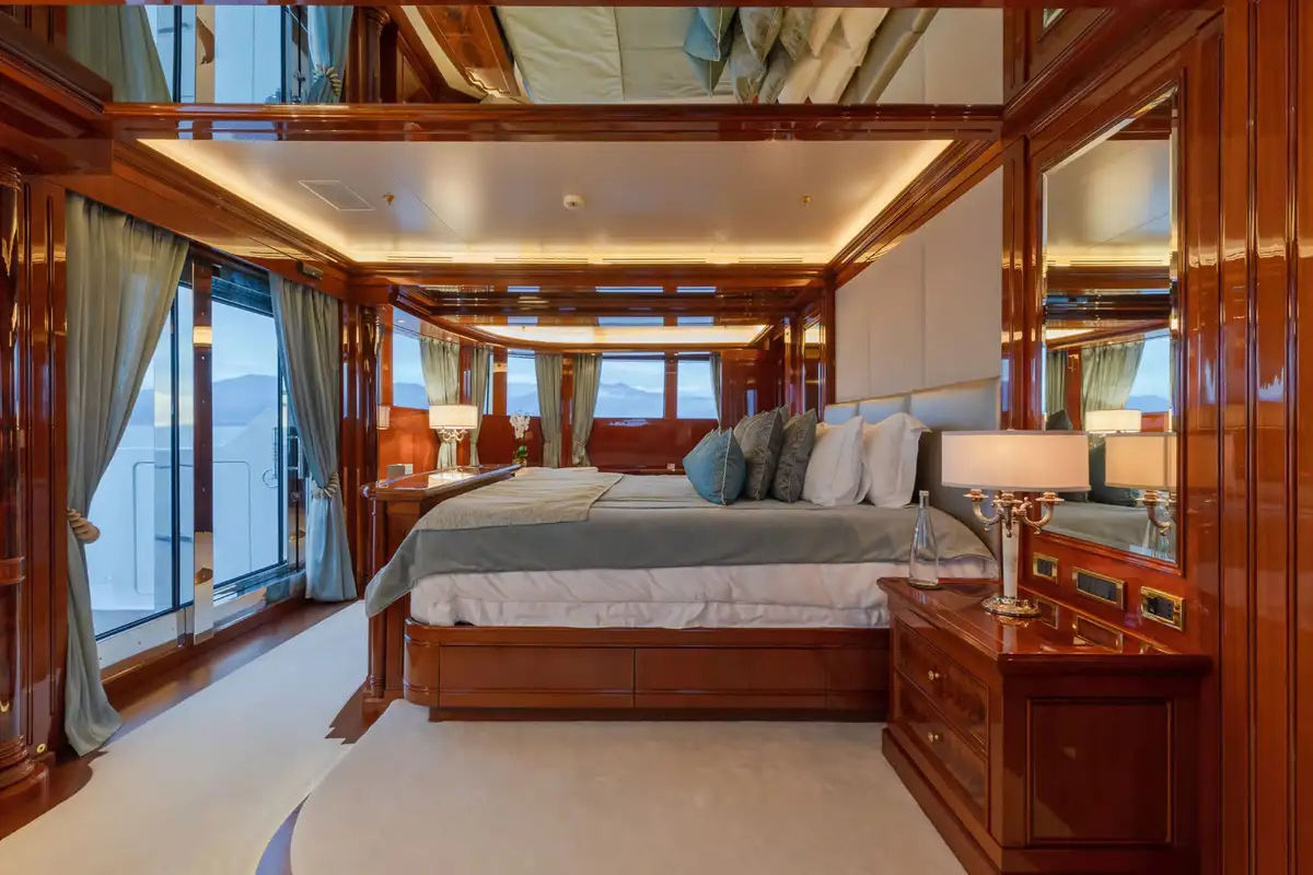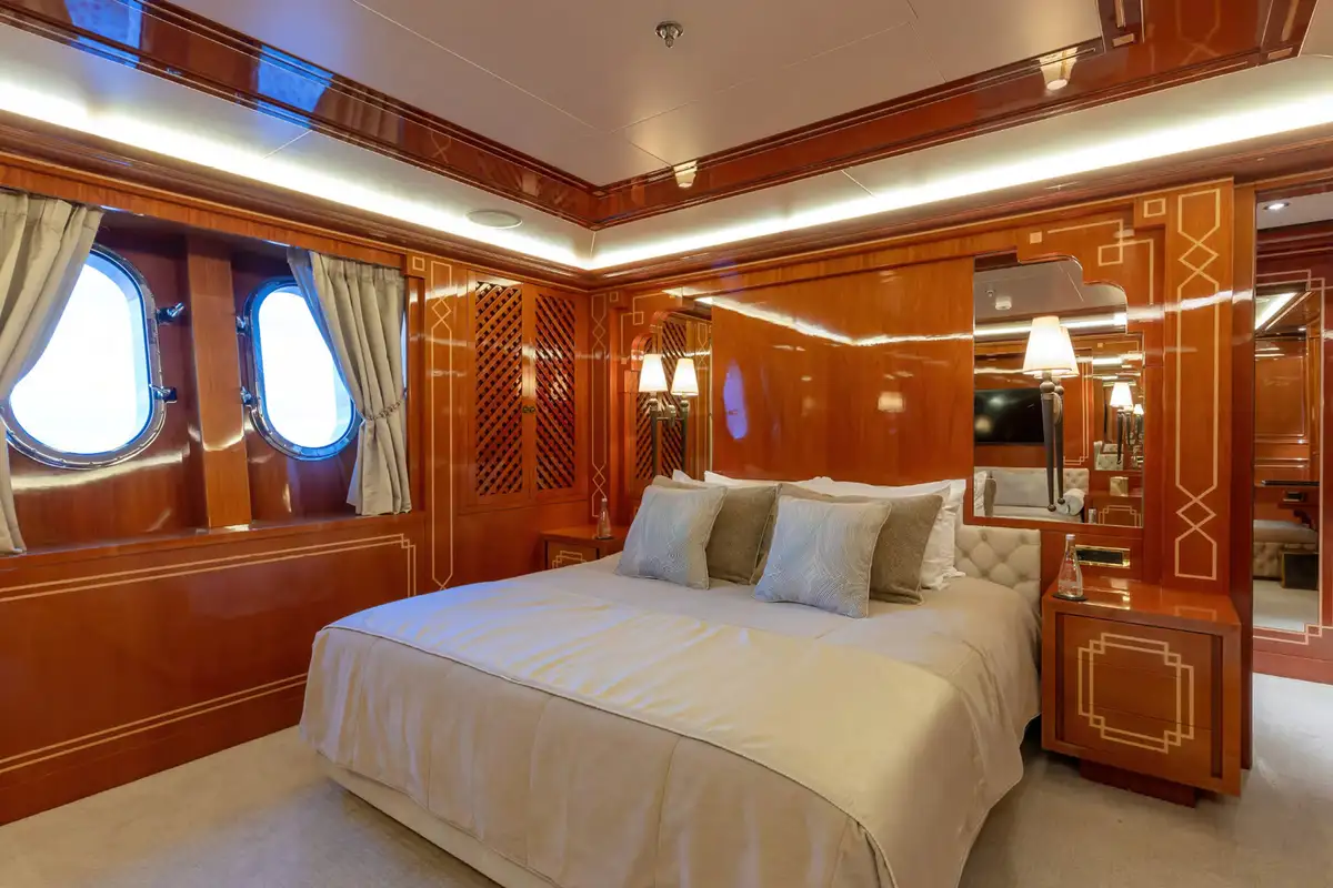 Accommodating up to 12 guests in nine lavish cabins, JOIA THE CROWN JEWEL offers a sanctuary for every guest. The full-beam master cabin, located on the main deck, provides panoramic views and a sumptuous en-suite bathroom. Five VIP cabins and three twin cabins, each with their own en suite facilities, ensure comfort and privacy for all. An elevator seamlessly connects all decks, enhancing accessibility throughout the yacht.