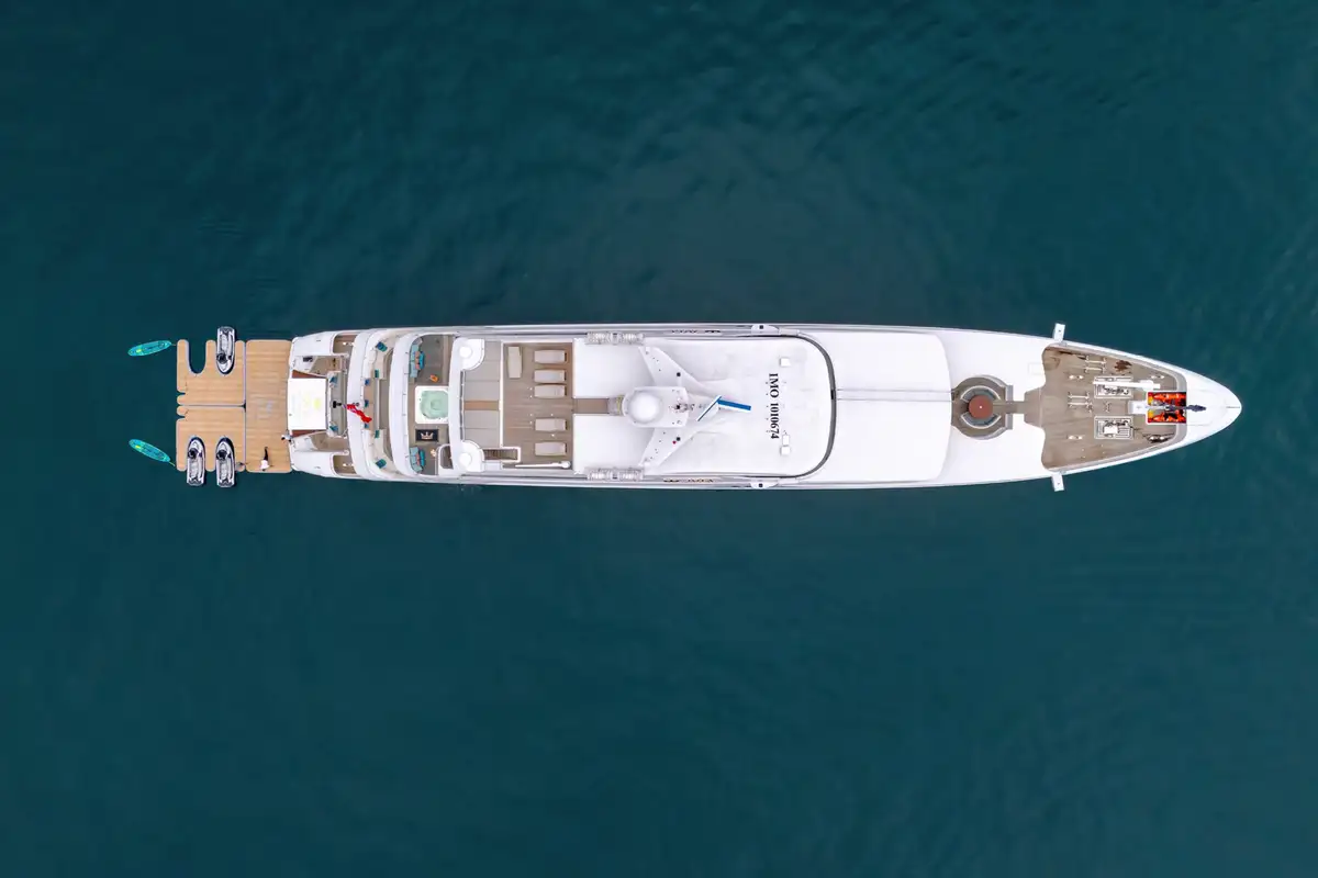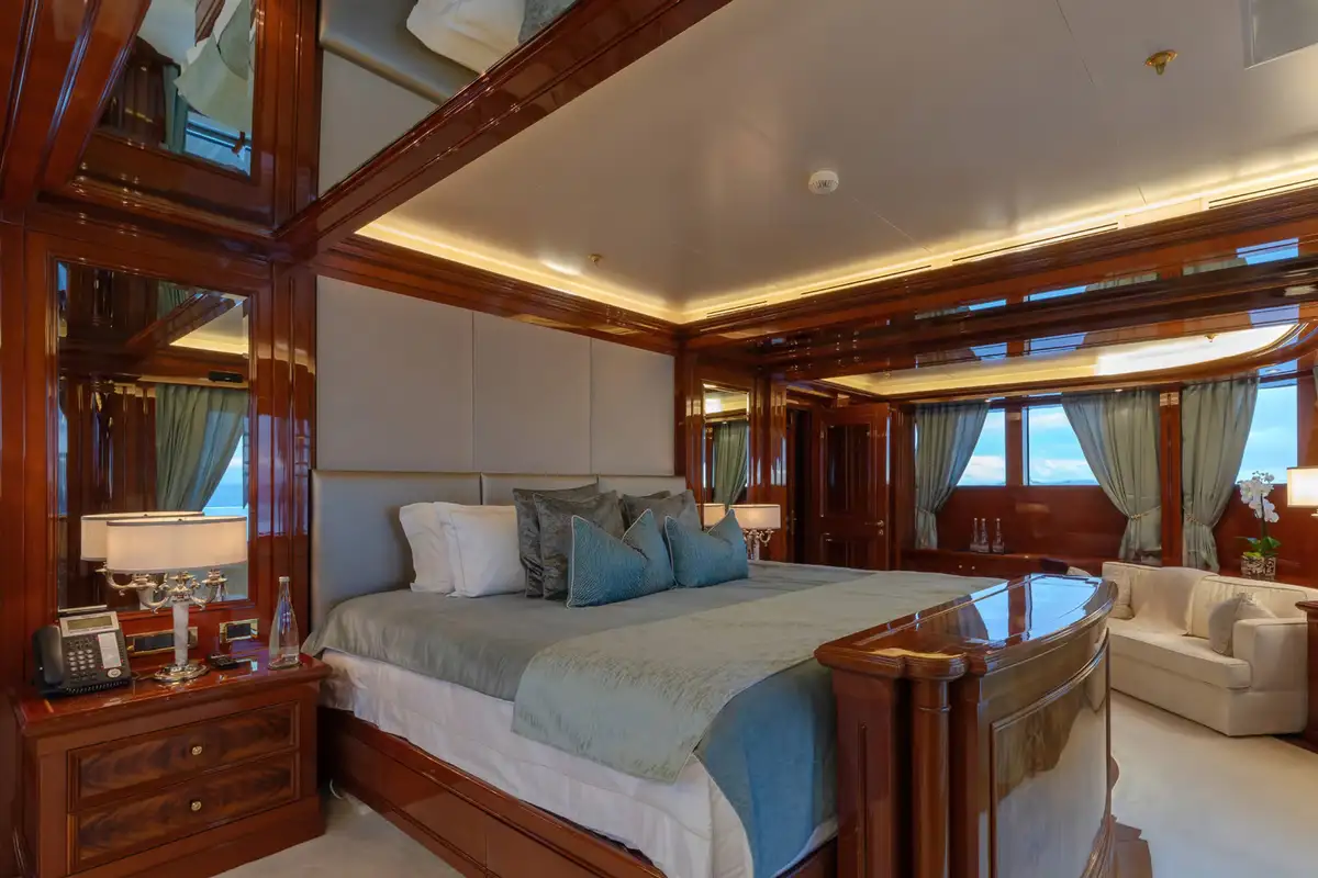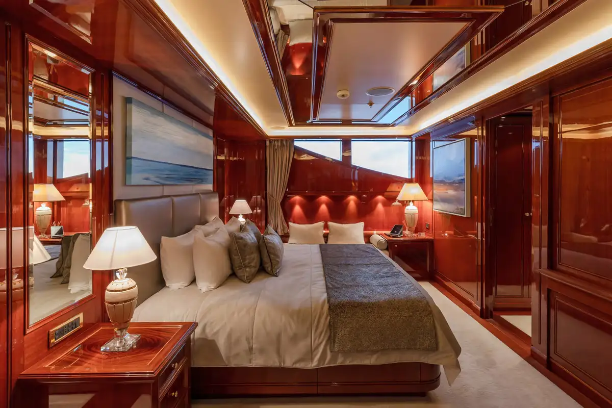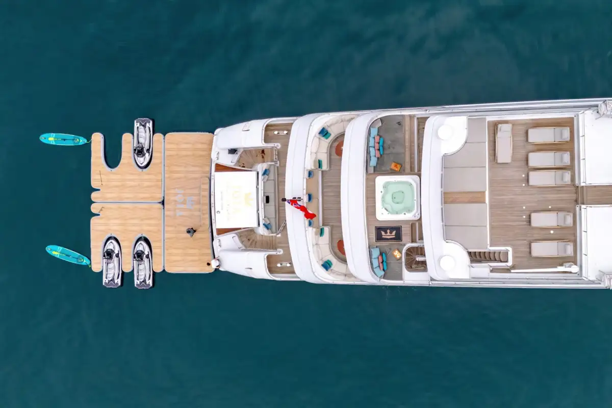 Accommodating up to 12 guests in nine lavish cabins, JOIA THE CROWN JEWEL offers a sanctuary for every guest. The full-beam master cabin, located on the main deck, provides panoramic views and a sumptuous en-suite bathroom. Five VIP cabins and three twin cabins, each with their own en suite facilities, ensure comfort and privacy for all. An elevator seamlessly connects all decks, enhancing accessibility throughout the yacht.