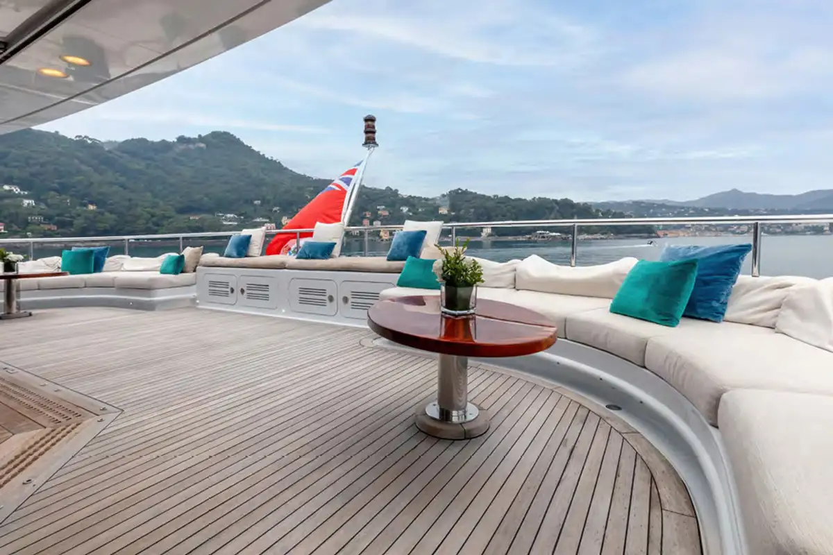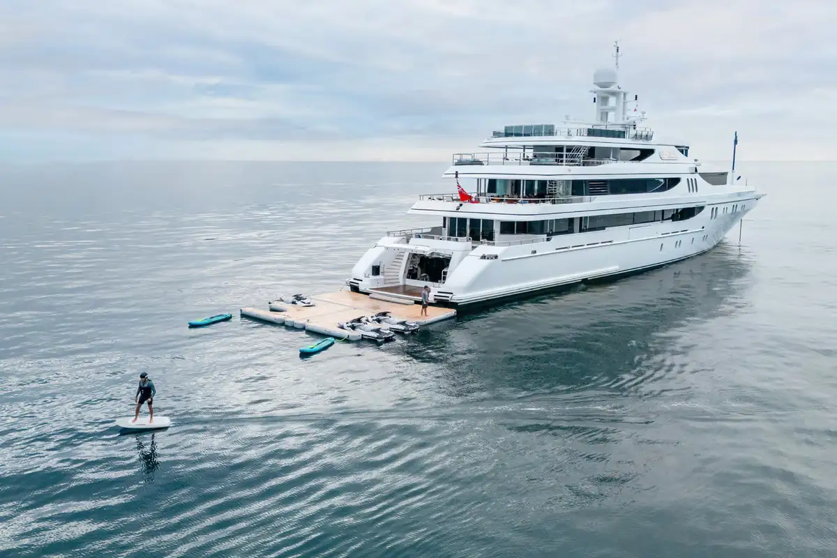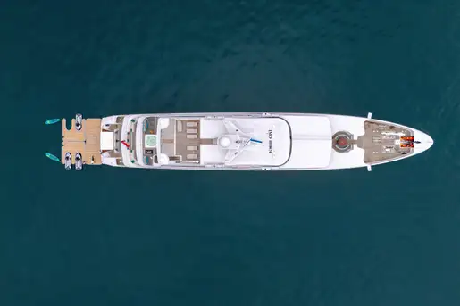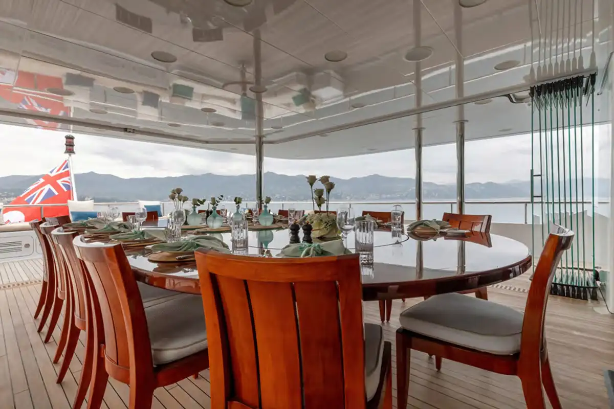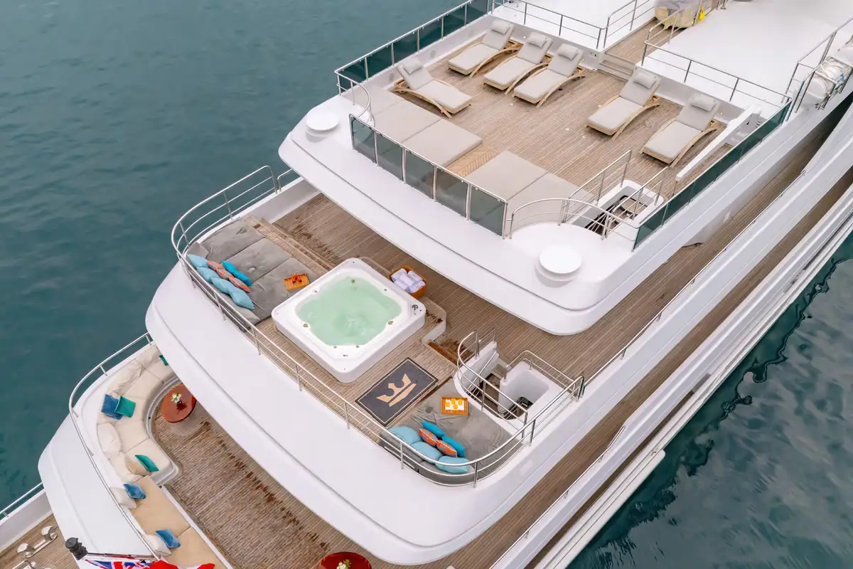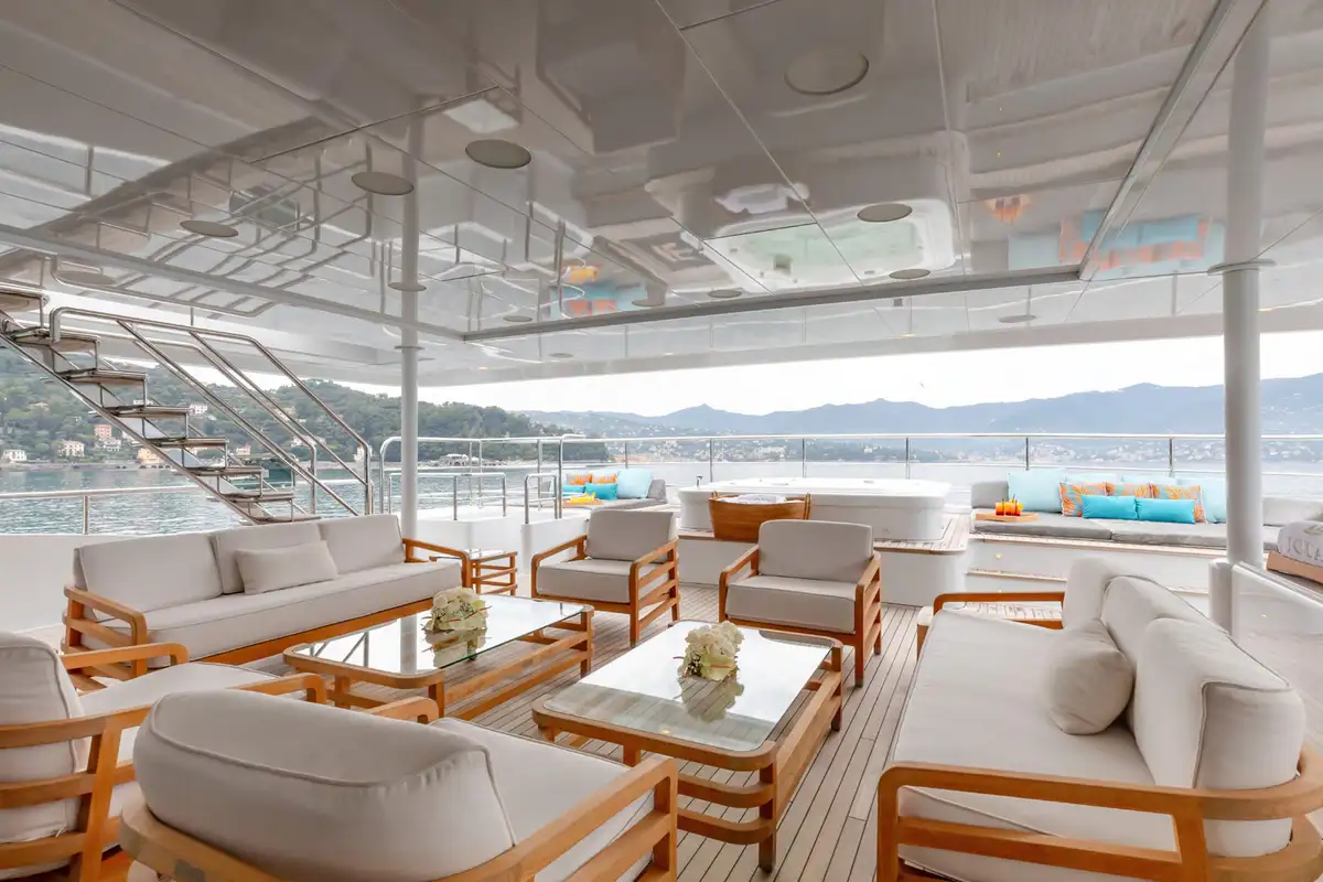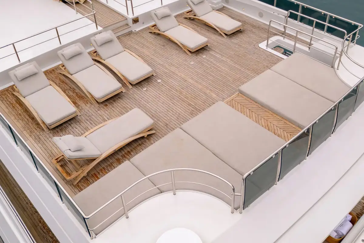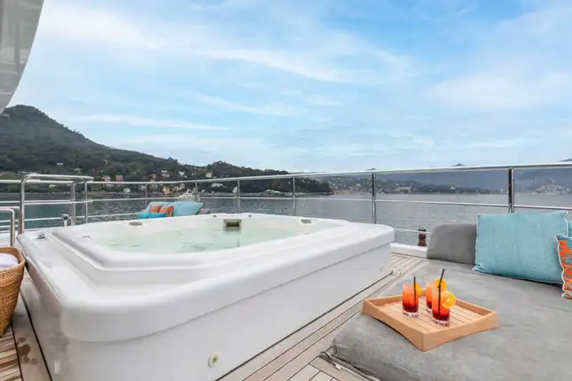 Outdoor living is elevated to new heights on board, with an expansive sundeck inviting guests to unwind on sun loungers, or take a dip in the jacuzzi, all while enjoying breathtaking vistas. The upper deck features a versatile winter garden dining area, which can be enclosed for climate-controlled comfort or opened to the sea breeze. A spacious beach club at the stern offers direct access to the water, creating the perfect setting for sunbathing or launching water toys.