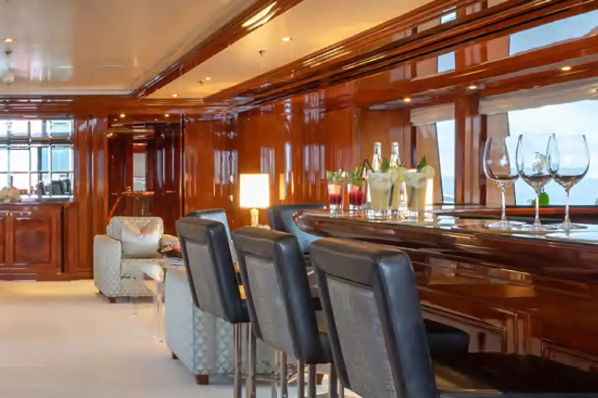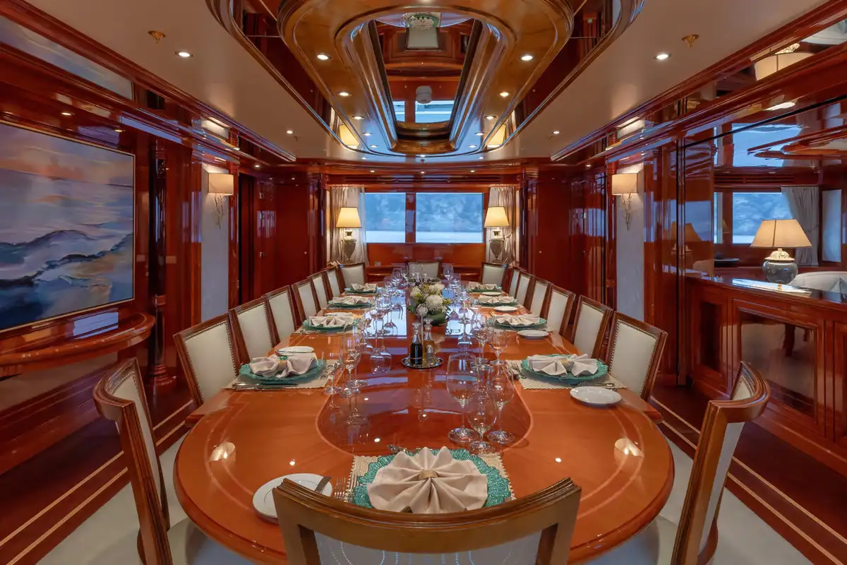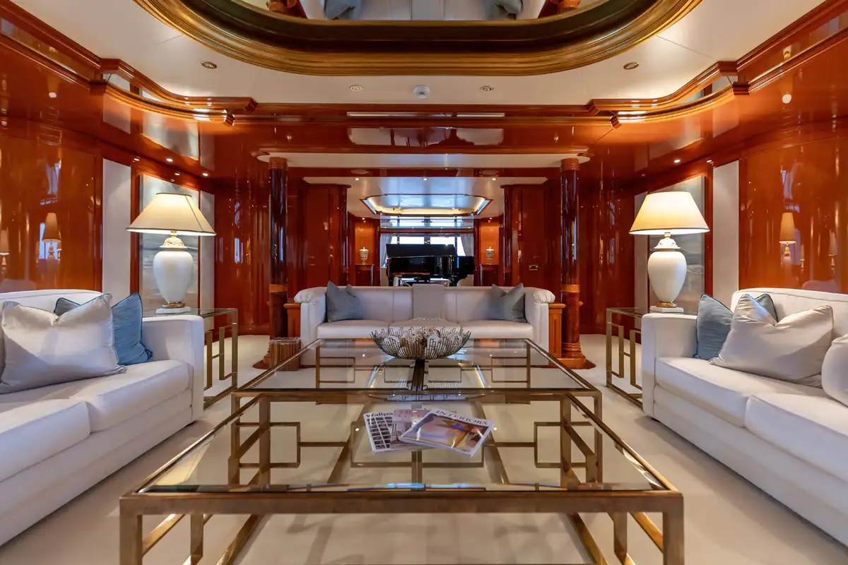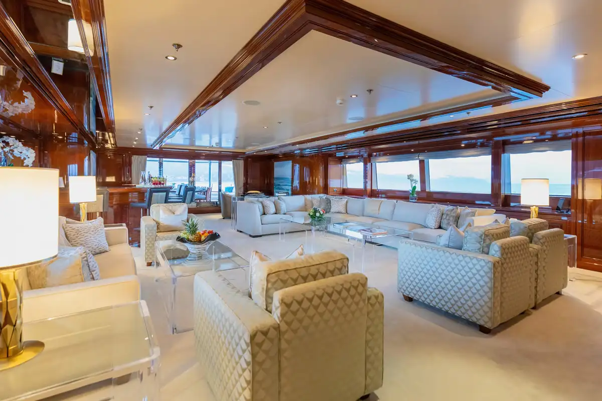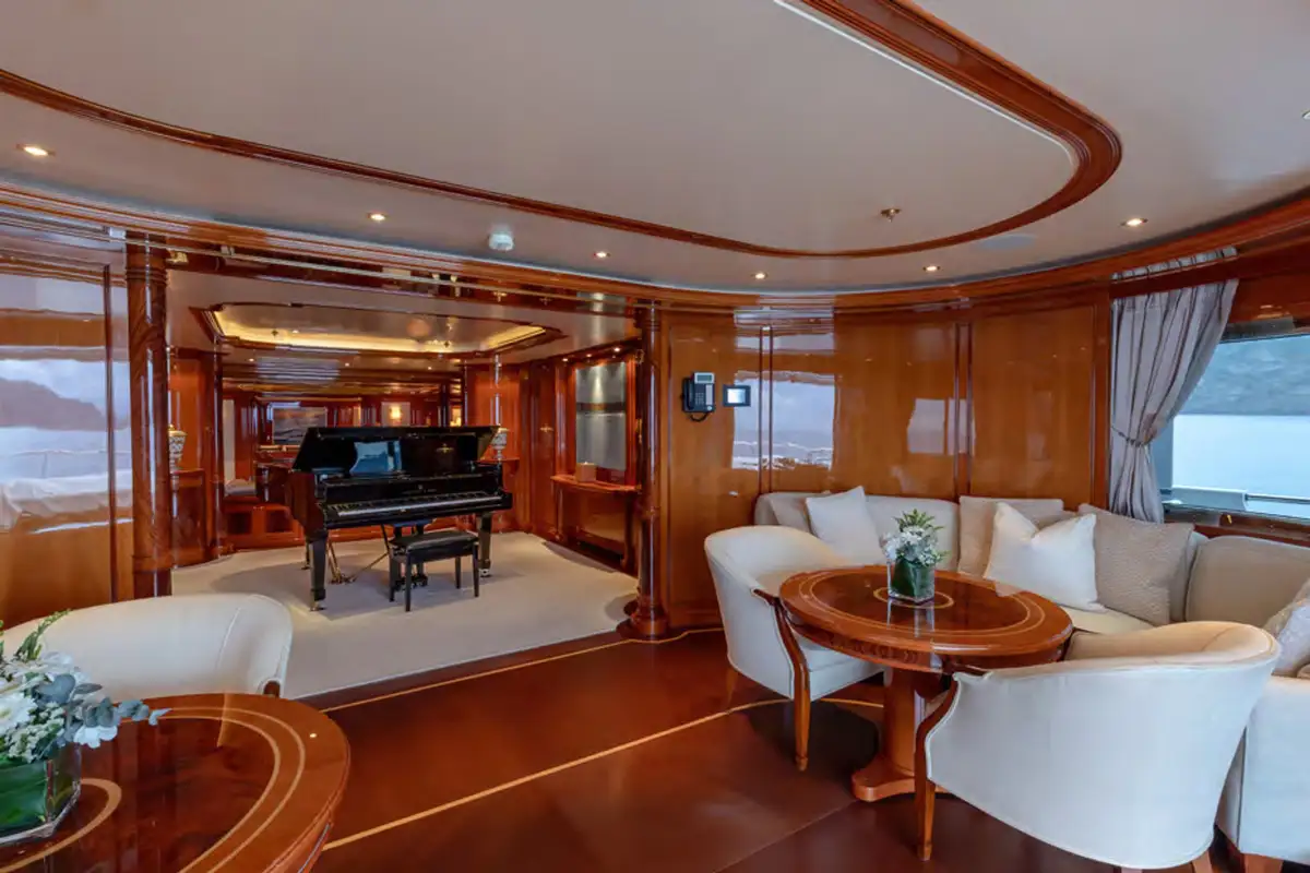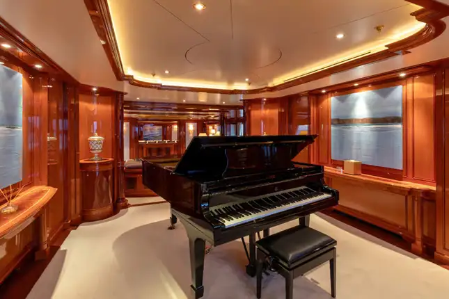 Step into a world of refined elegance as you explore JOIA THE CROWN JEWEL's interior, masterfully designed by Della Role Design. Rich mahogany paneling, complemented by accents of bois de rose, creates a warm and inviting atmosphere throughout. The main deck lounge features plush seating areas and a Steinway grand piano, setting the stage for intimate gatherings or sophisticated soirées. For cinematic indulgence, the yacht boasts a private cinema room, perfect for movie nights at sea.