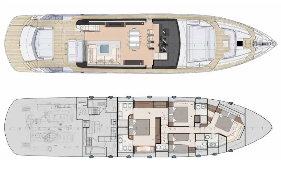 - Full beam lower deck master cabin with office and en suite