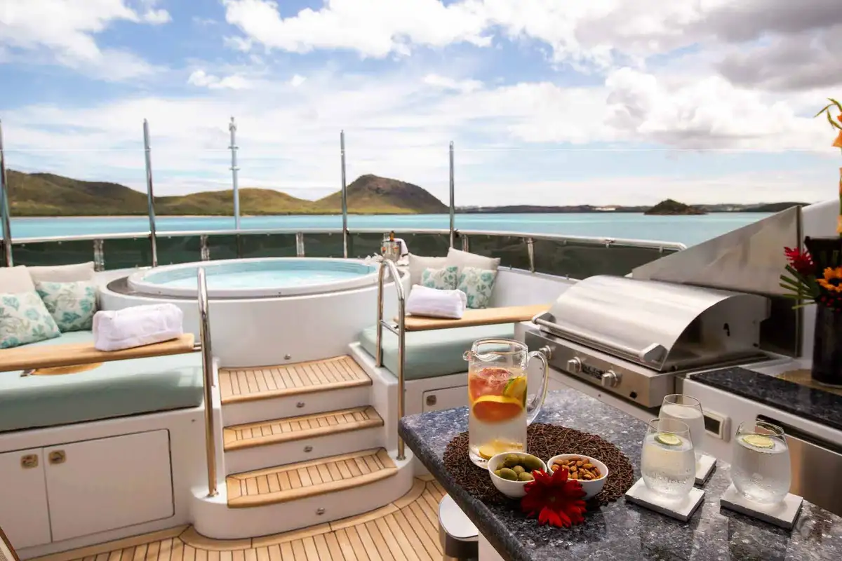 Her outside spaces are a notable highlight, ideal for making the most of an island-hopping cruise. The sun deck is perfect for fun-packed days at anchor with a bar and barbecue, plenty of sun loungers, a big jacuzzi pool – and a giant water slide to launch yourself straight into the sea. There’s a spacious outdoor dining space on the upper aft deck as well as an open-air lounge.