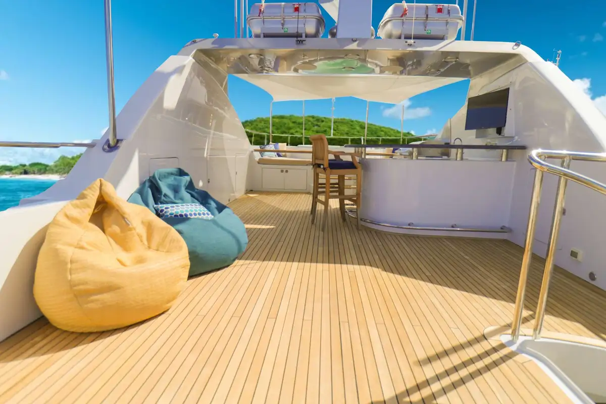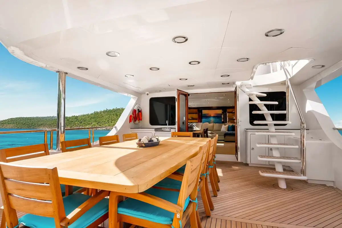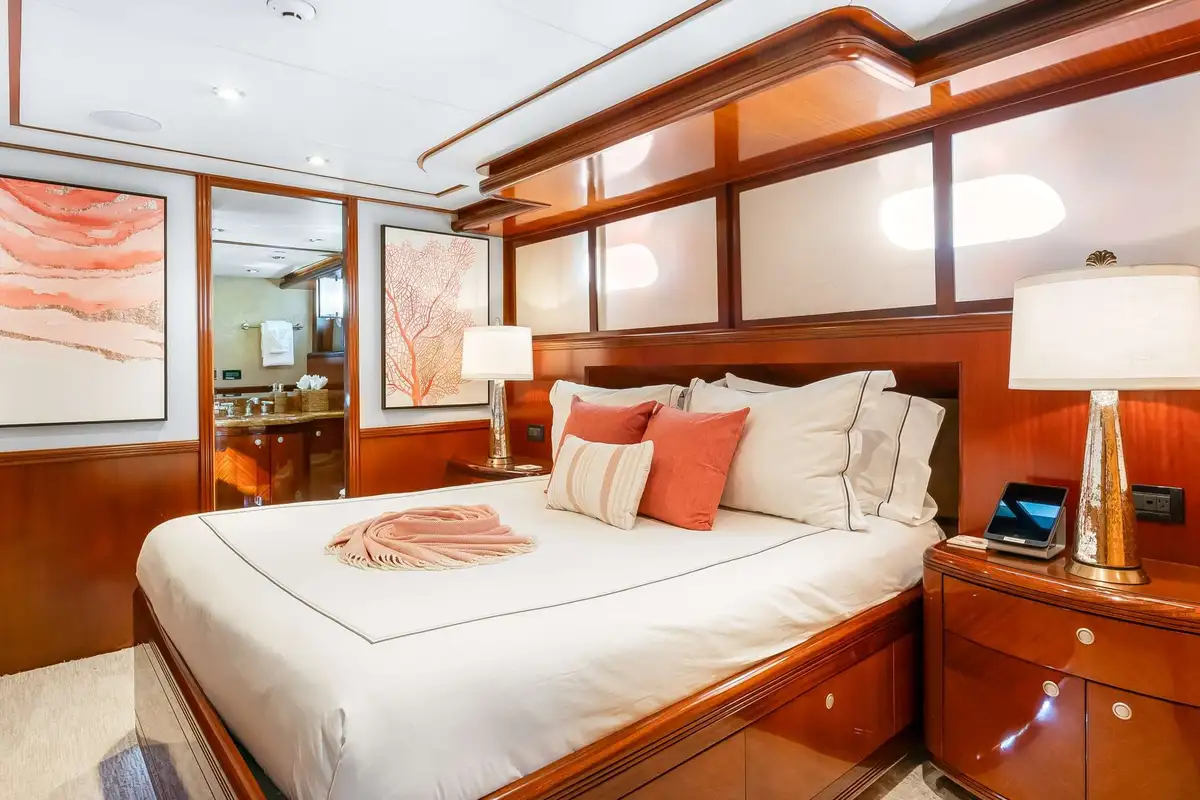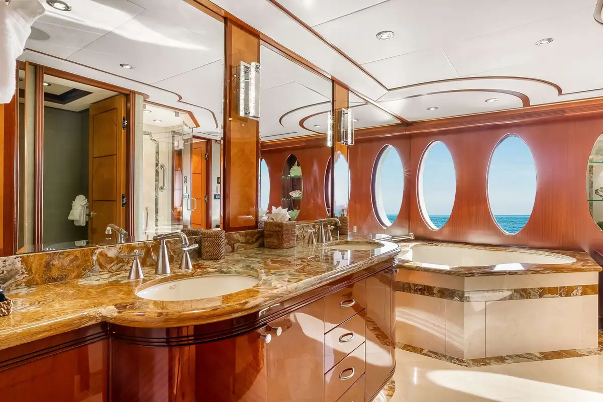 The master suite is huge and exquisitely finished in finely crafted tropical hardwoods, with six big oval porthole windows on each side. There’s a study area as well as a vanity desk, and the marble en suite bathroom has a two-person bathtub plus a separate shower. The lower deck guest cabins are also large and luxurious. There are two double cabins, two convertible twin/doubles and extra pullman berths, so she’ll adapt to the needs of your group.