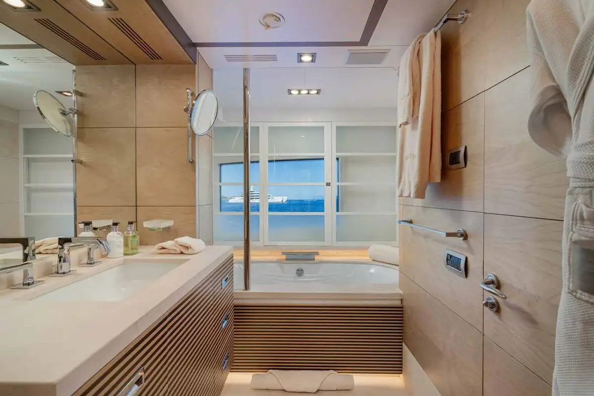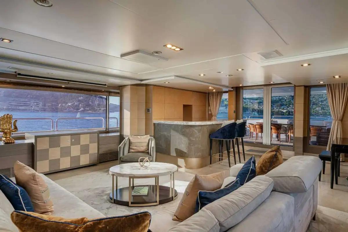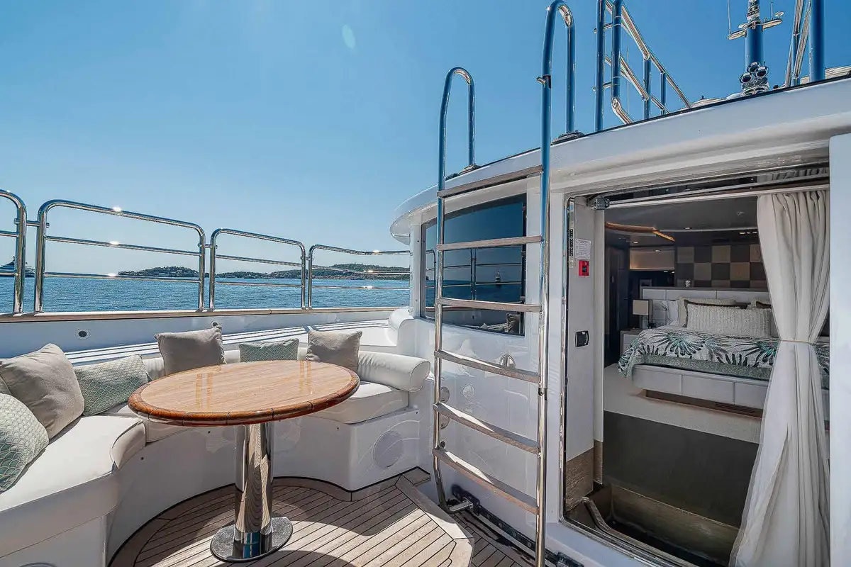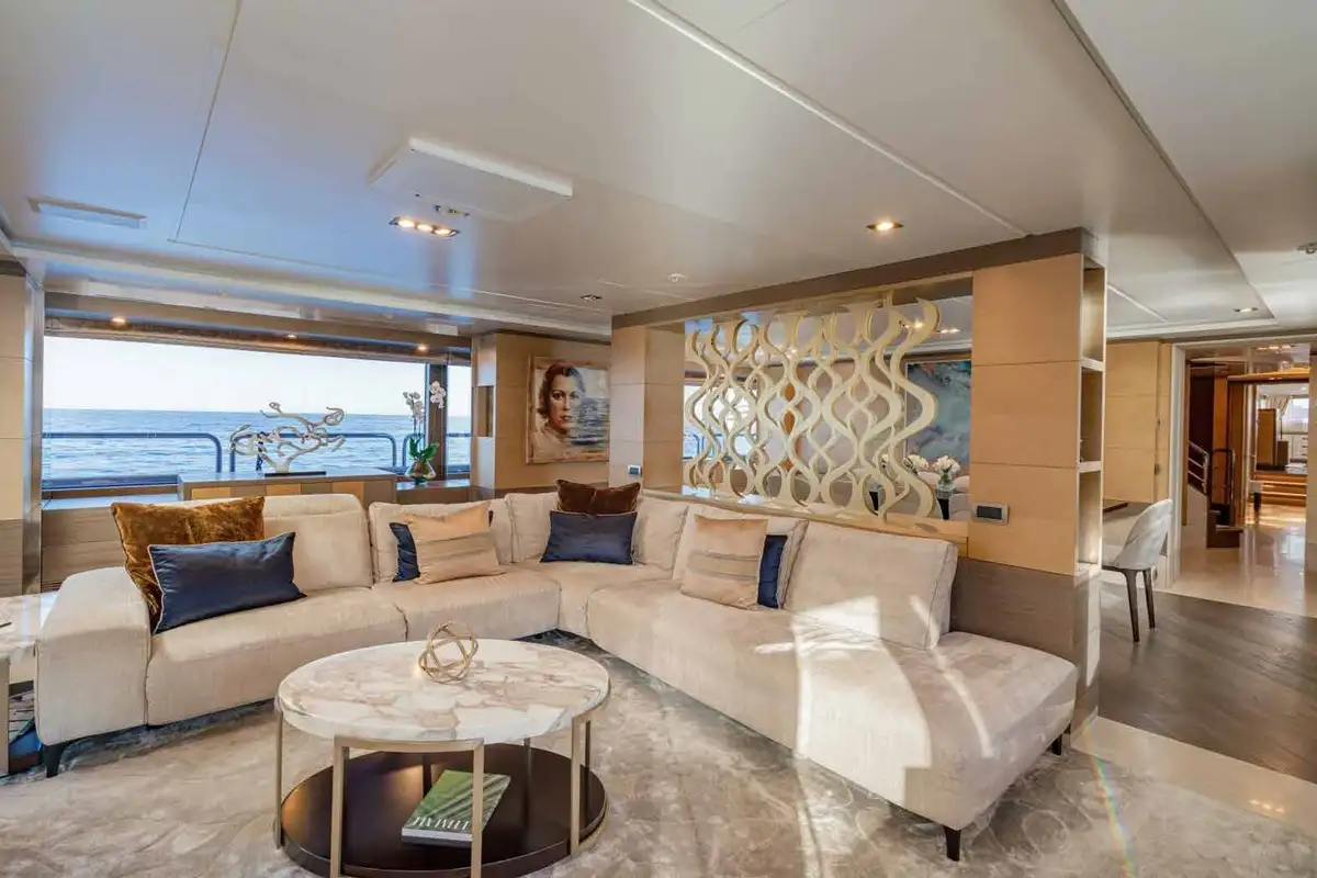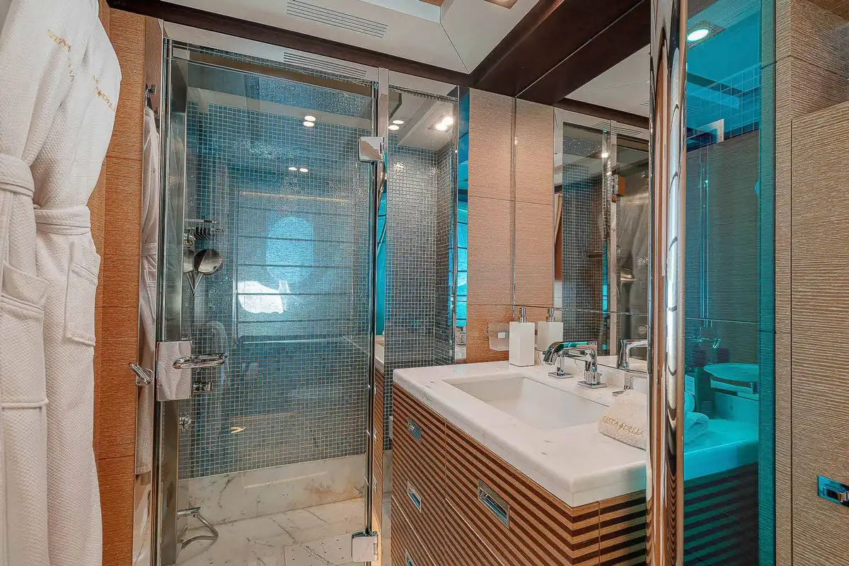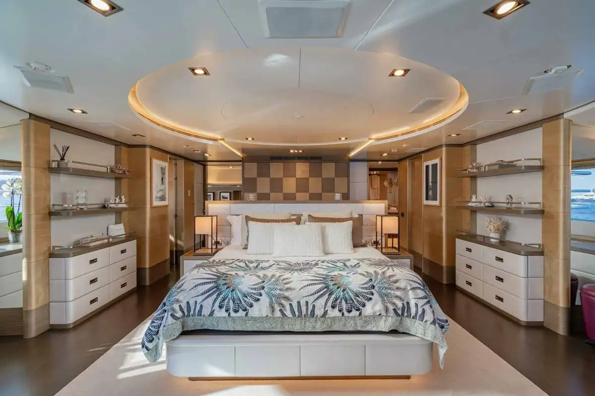 Her layout is intuitively structured for those who understand flow. The main deck opens into a refined lounge framed by large windows and tailored furnishings, leading forward to the full-beam master suite, complete with panoramic views, his-and-her bathrooms, and a private lounge terrace. This suite feels more like a coastal penthouse than a cabin. Below, four guest suites, two doubles, one twin with pullman, and one convertible smaller double. All offer faultless flexibility without compromising on privacy or comfort.