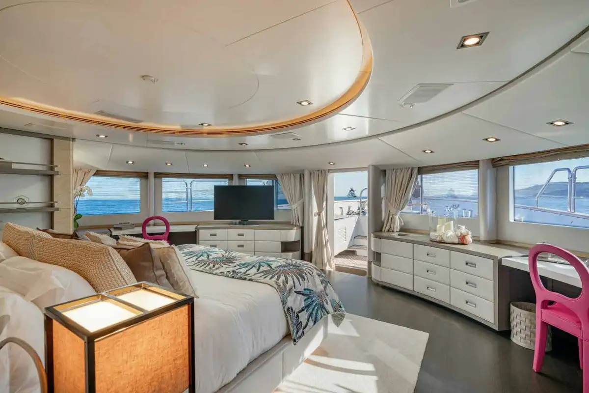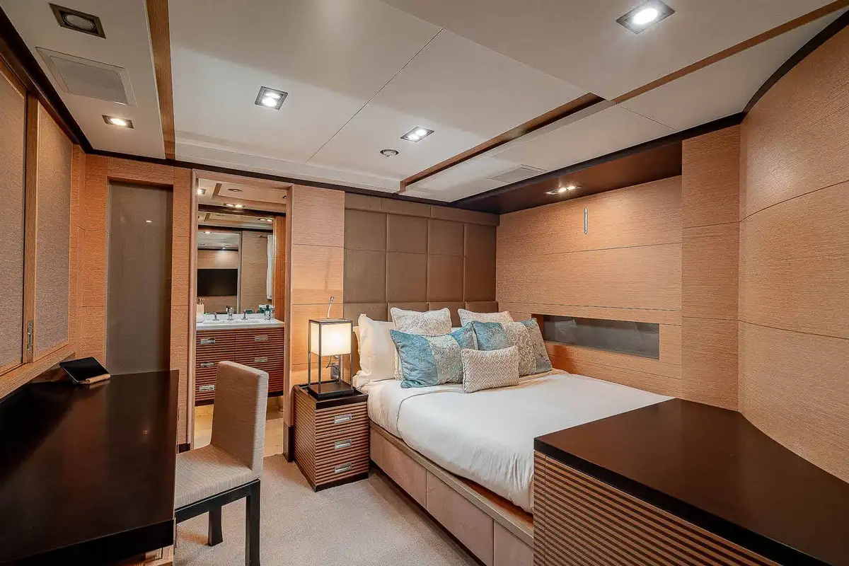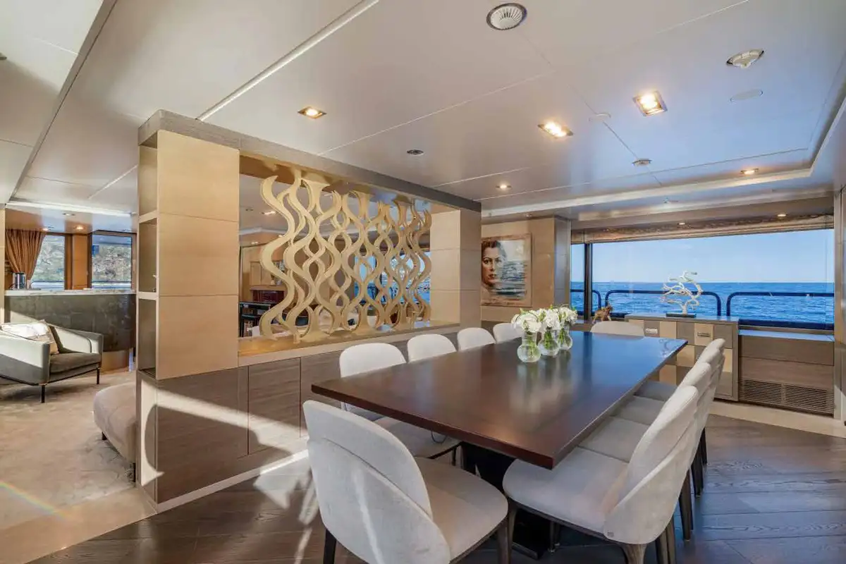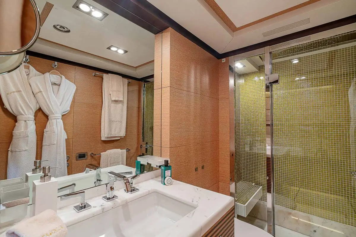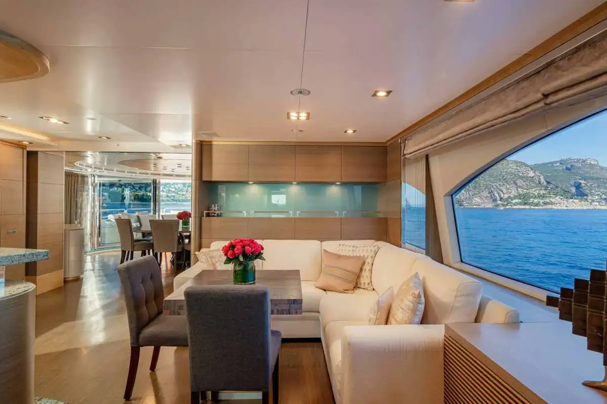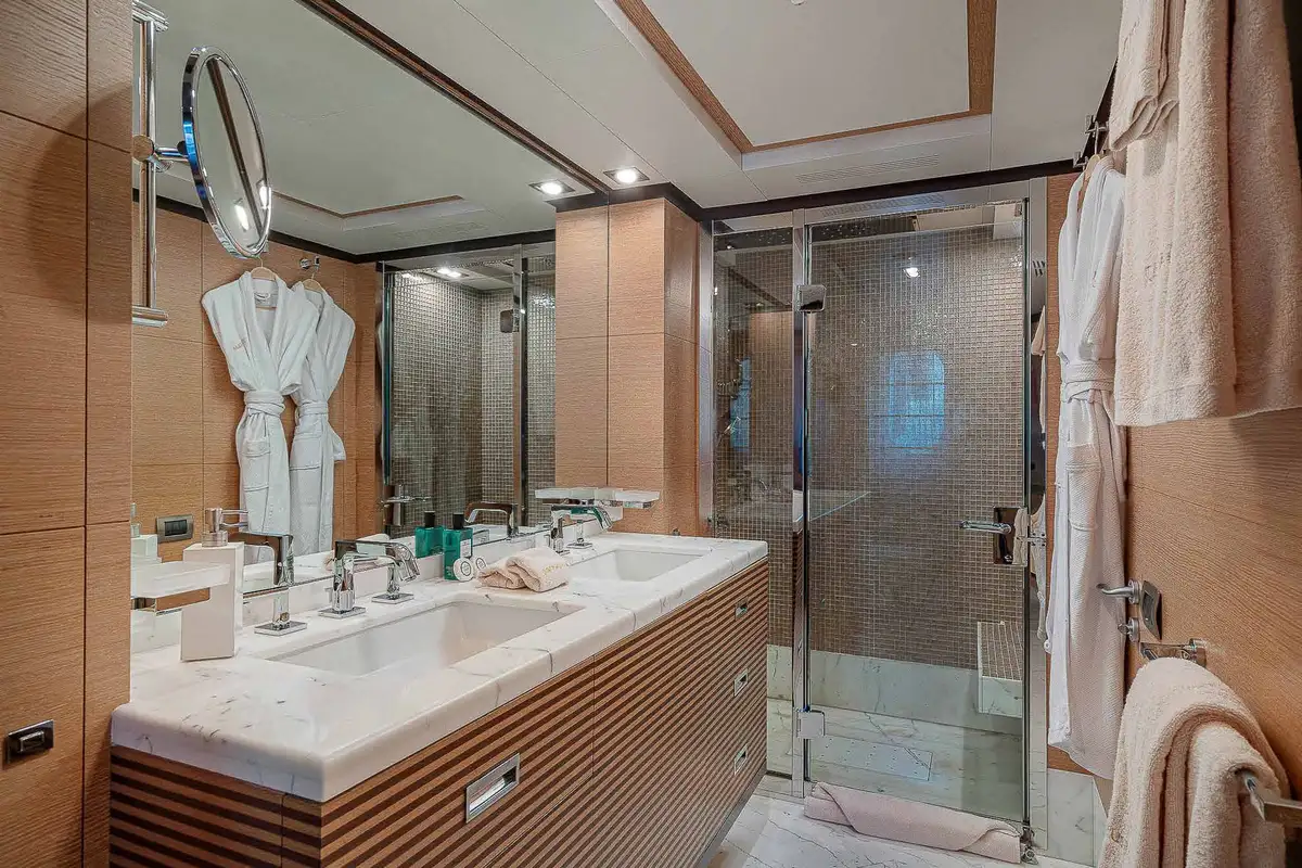 Her layout is intuitively structured for those who understand flow. The main deck opens into a refined lounge framed by large windows and tailored furnishings, leading forward to the full-beam master suite, complete with panoramic views, his-and-her bathrooms, and a private lounge terrace. This suite feels more like a coastal penthouse than a cabin. Below, four guest suites, two doubles, one twin with pullman, and one convertible smaller double. All offer faultless flexibility without compromising on privacy or comfort.