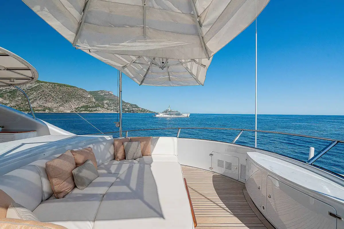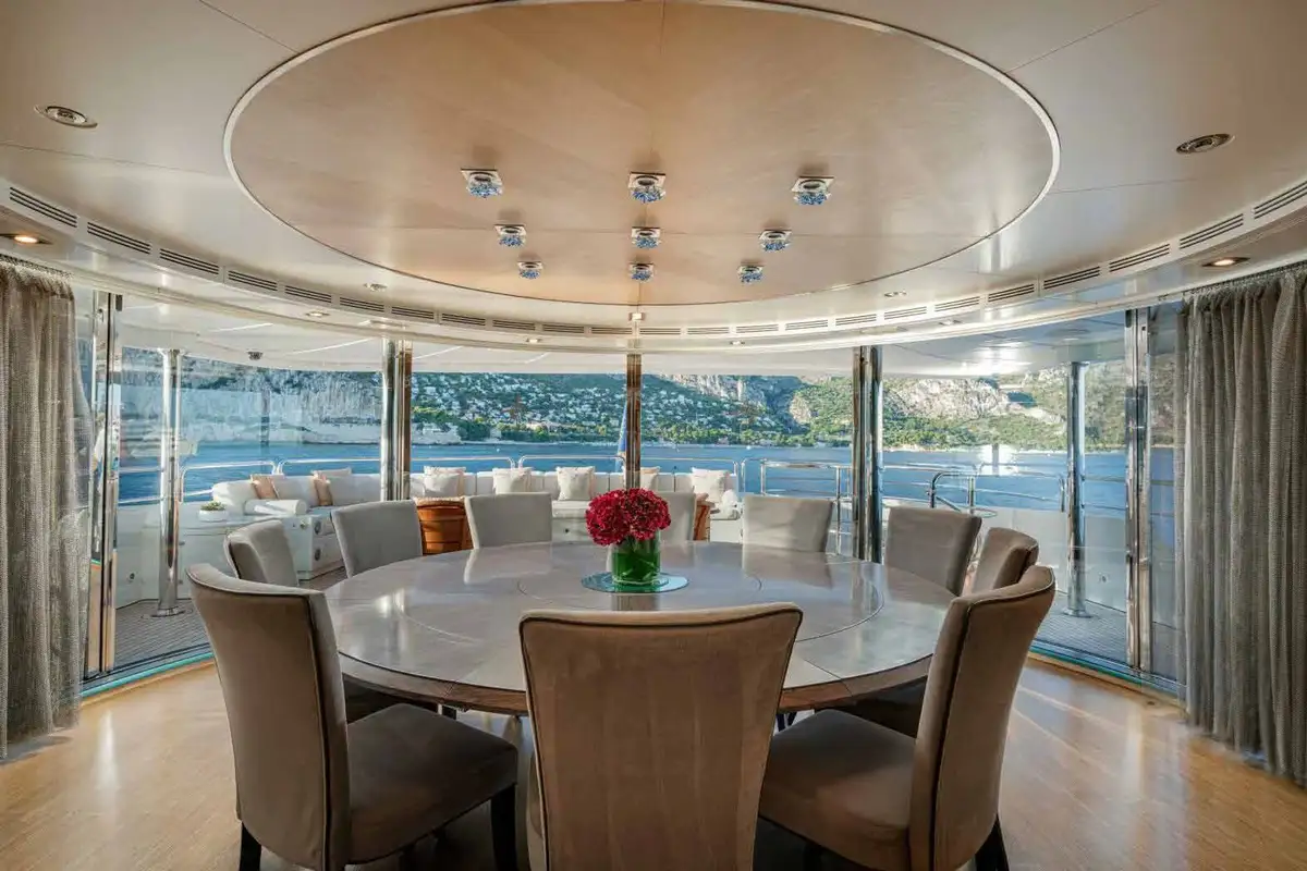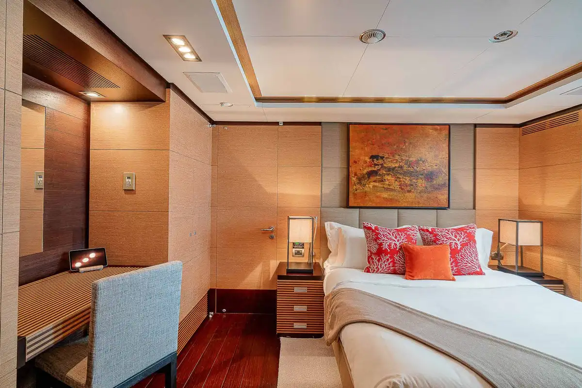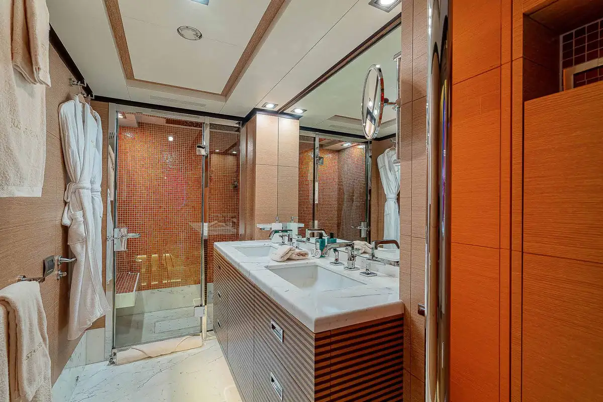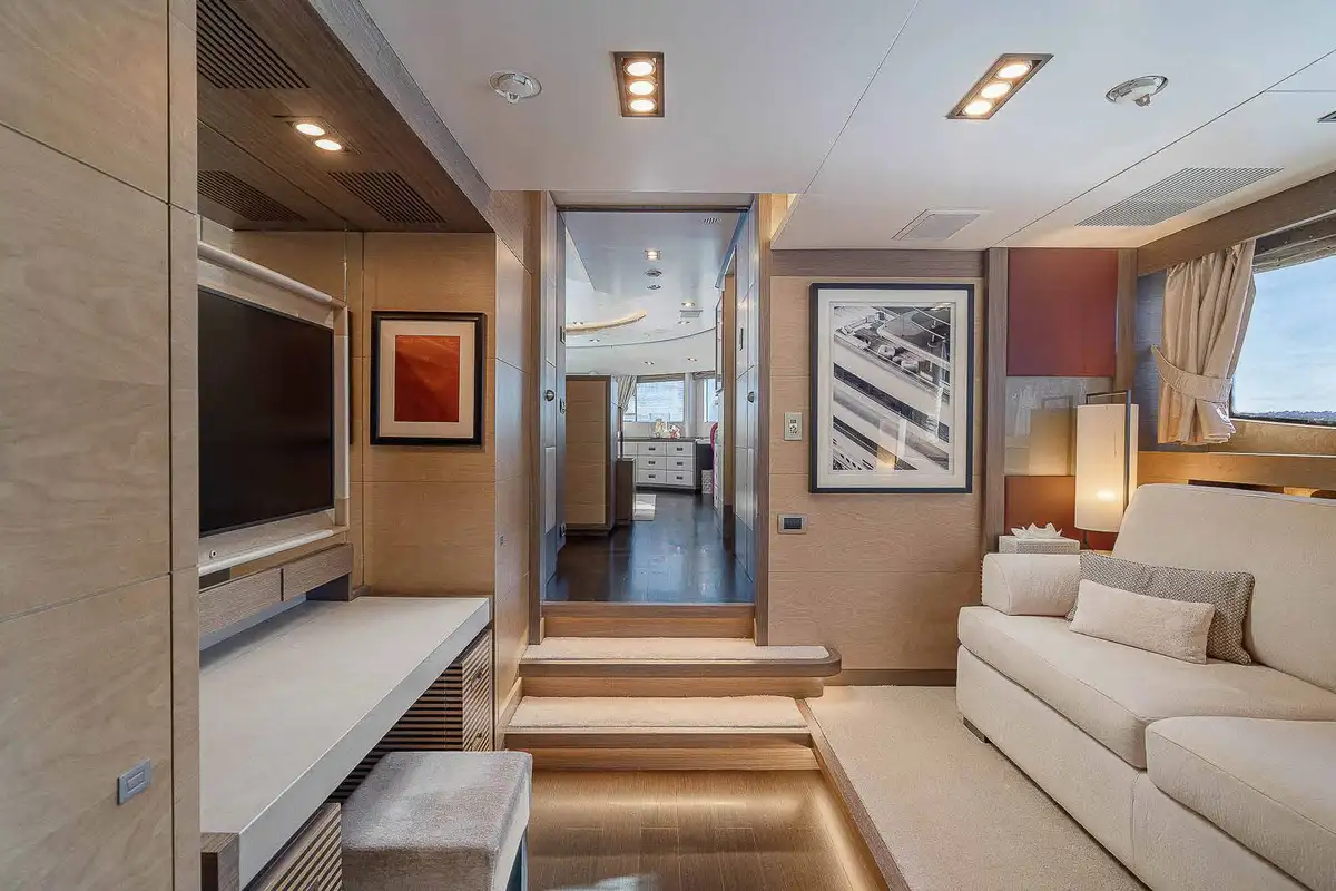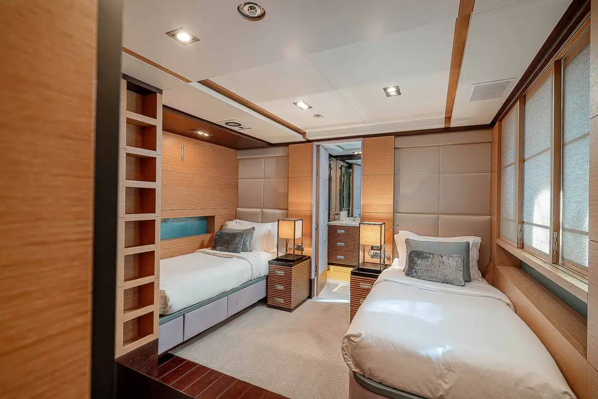 Her layout is intuitively structured for those who understand flow. The main deck opens into a refined lounge framed by large windows and tailored furnishings, leading forward to the full-beam master suite, complete with panoramic views, his-and-her bathrooms, and a private lounge terrace. This suite feels more like a coastal penthouse than a cabin. Below, four guest suites, two doubles, one twin with pullman, and one convertible smaller double. All offer faultless flexibility without compromising on privacy or comfort.