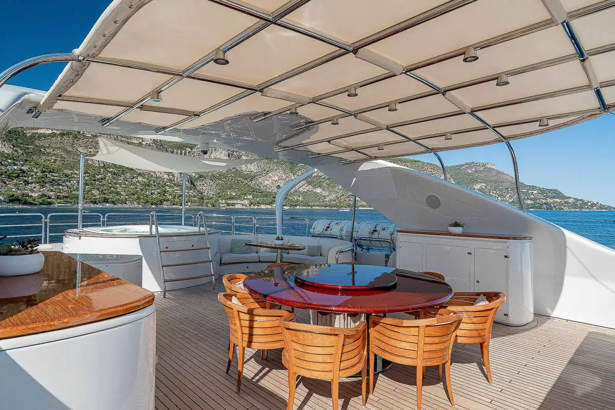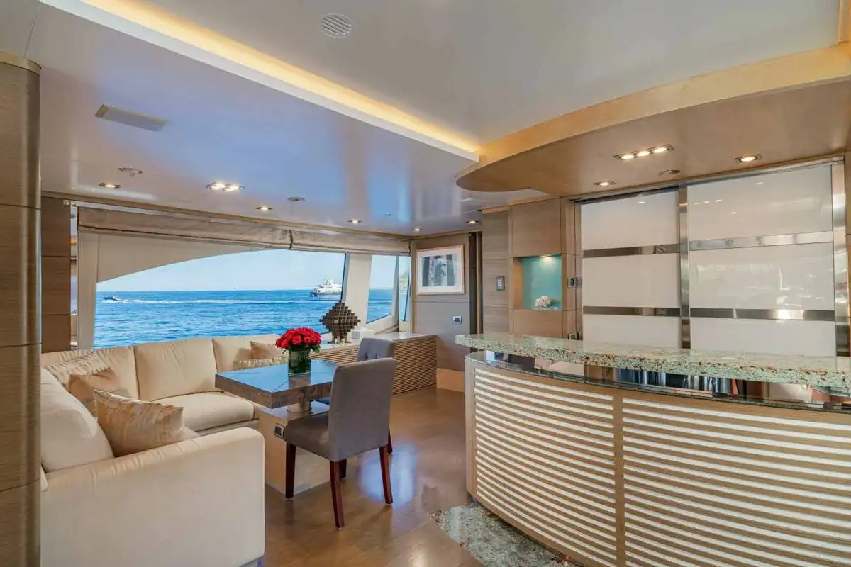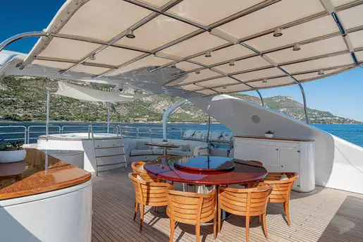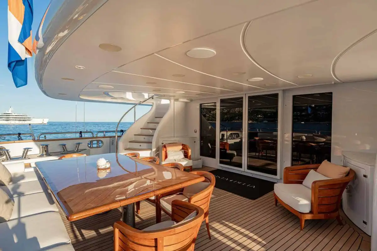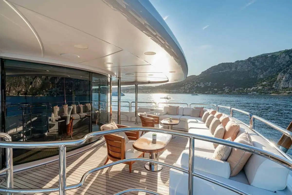 Up top, the expansive sun deck becomes the social core: generous sun pads, a well-appointed bar, al fresco dining beneath a hardtop, and a chef-grade grill. The upper aft deck and main aft terrace extend the experience, ideal for informal dining or gathering at dusk. Every exterior space is designed not just to host but to linger from breakfast to golden hour, and long after.