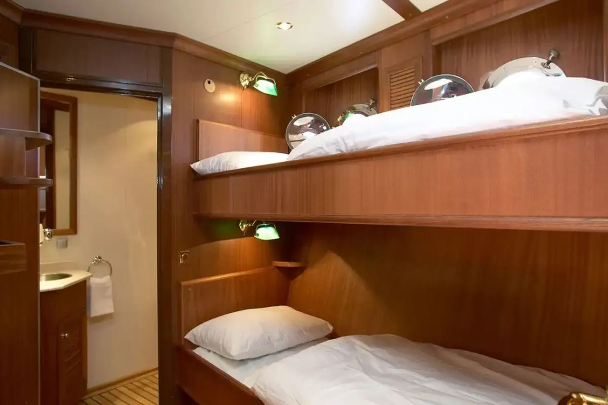 The 38m (124.8ft) classic yacht KAIROS II by shipyard Aegean Yacht, built in 2007, offers flexible accommodation for up to 16 guests in eight cabins.