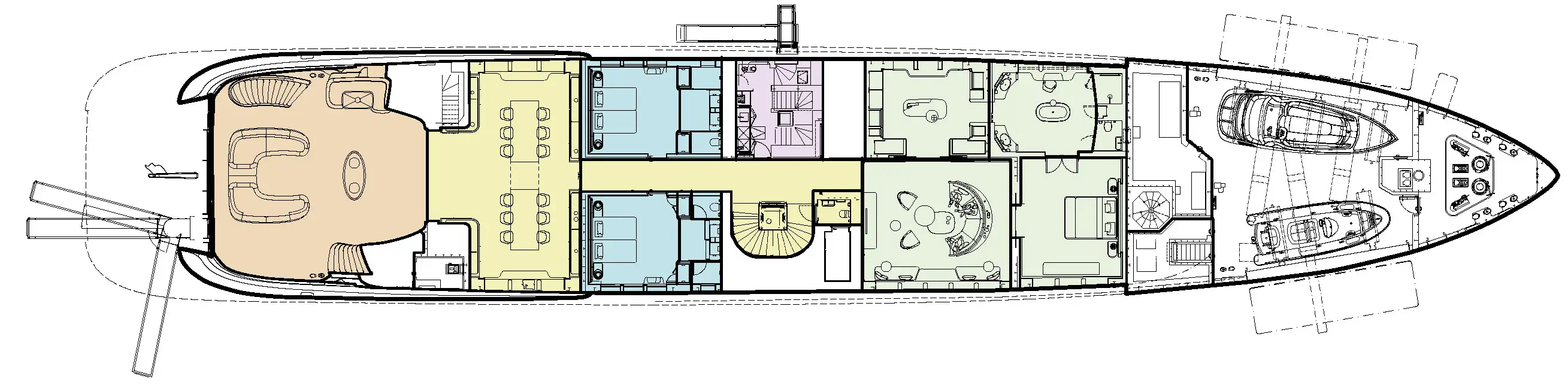 The owner’s suite is simply sublime, with four large rooms that occupy the front half of the main deck. The master cabin flows into a big private lounge, which in turn leads into a dressing room and study. Another door from the cabin leads into a huge en suite bathroom with a free-standing bathtub as its central hub. Come on board and prepare to be amazed.