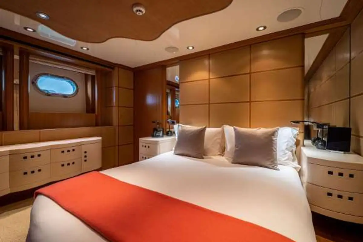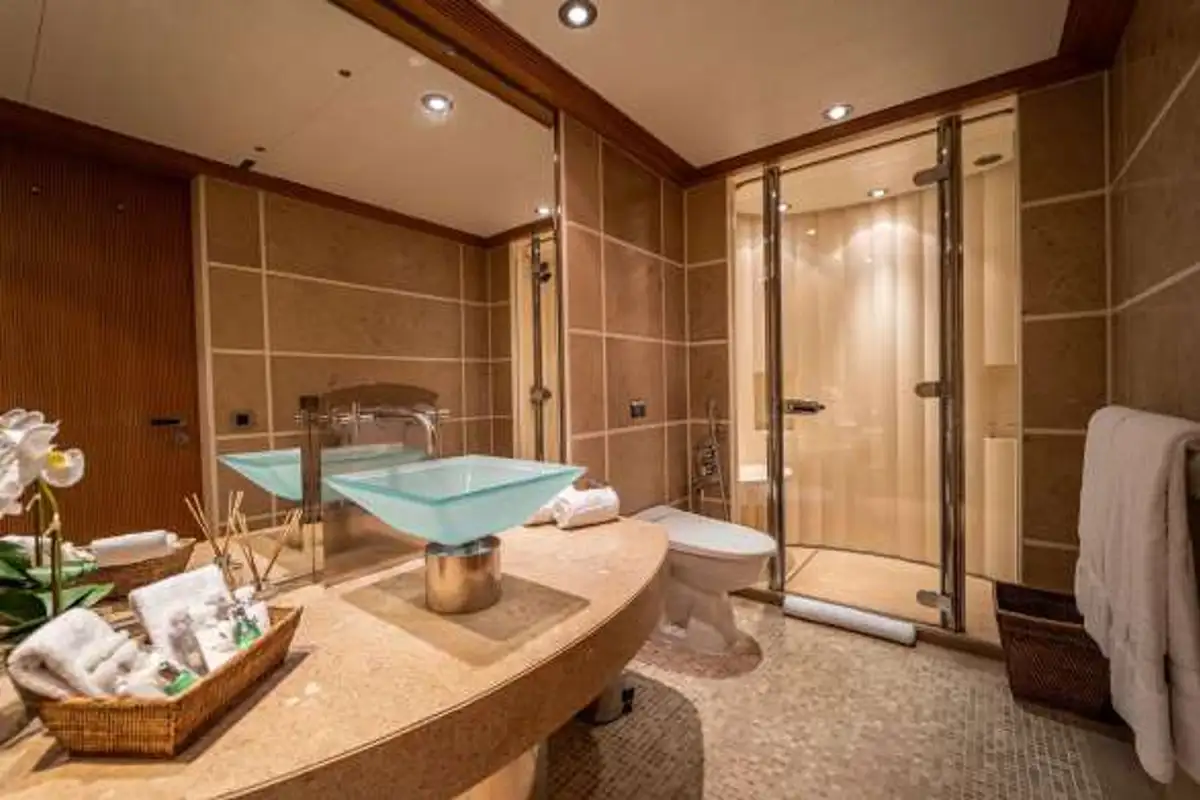 She’s beautifully finished inside, too, with a smart, stylish and luxurious interior by the renowned designer Terence Disdale in a palette of sultry earth tones, based on a contemporary theme with natural stone, fine leather and marble, silk sofas and blond hardwood floors. Big picture windows that flood the main saloon and sky lounge with lots of natural light. Timeless styling, beautiful furnishings and sumptuous seating create an elegant, comfortable atmosphere.