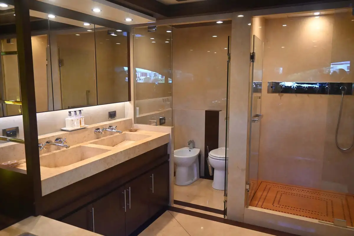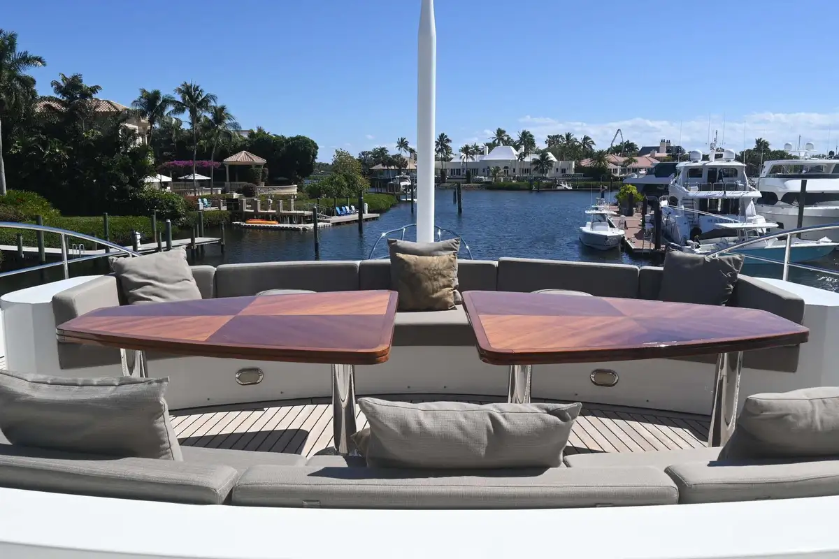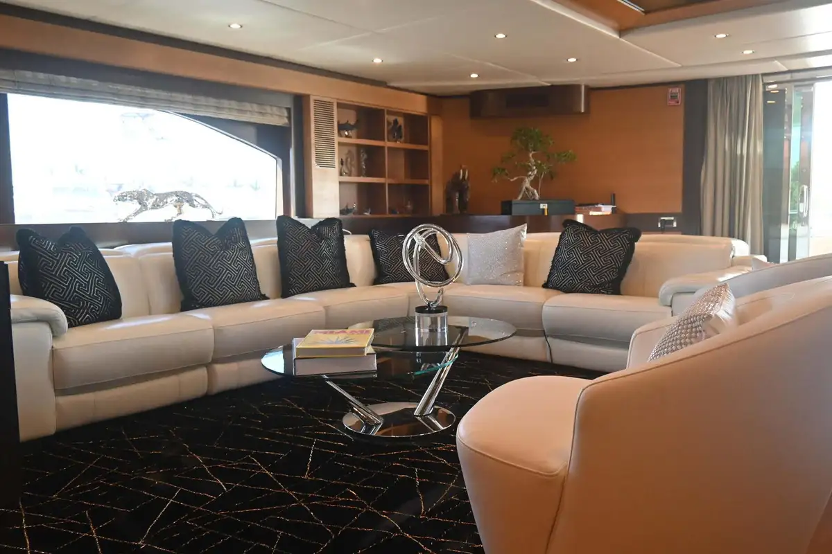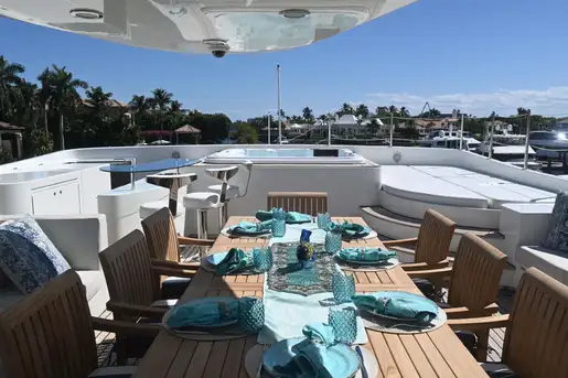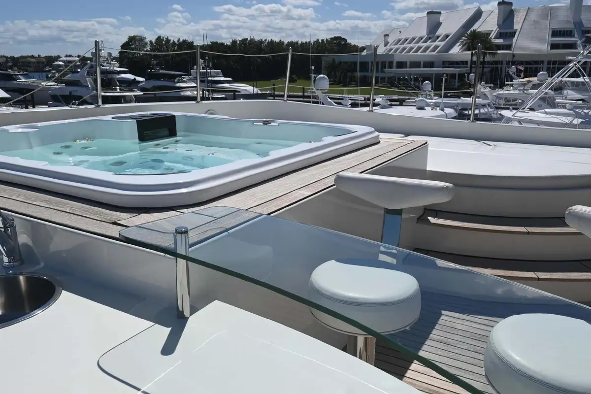 KIMBERLIE, the personification of a carefully thought-out design made for comfort, contains 6 staterooms for 12 guests. The master stateroom is situated on the main deck, spanning the entire beam, and is naturally illuminated by its vast skylights. The lower deck houses 4 wonderful staterooms, 2 with queen beds, and the other 2 with twin beds. The VIP cabin is located on the bridge deck, and forward of the sky lounge. The sundeck provides the perfect ambiance for sun-lounging and taking a dip in the jacuzzi. The bar is strategically located next to the jacuzzi so charter guests can be easily served by crew without having to awkwardly reach. KIMBERLIE is an incredible 360 GT yacht with an abundance of space.