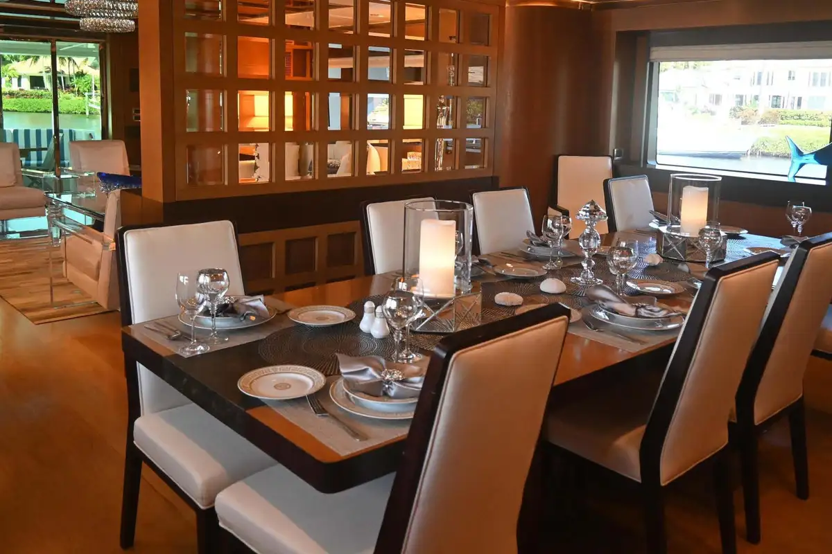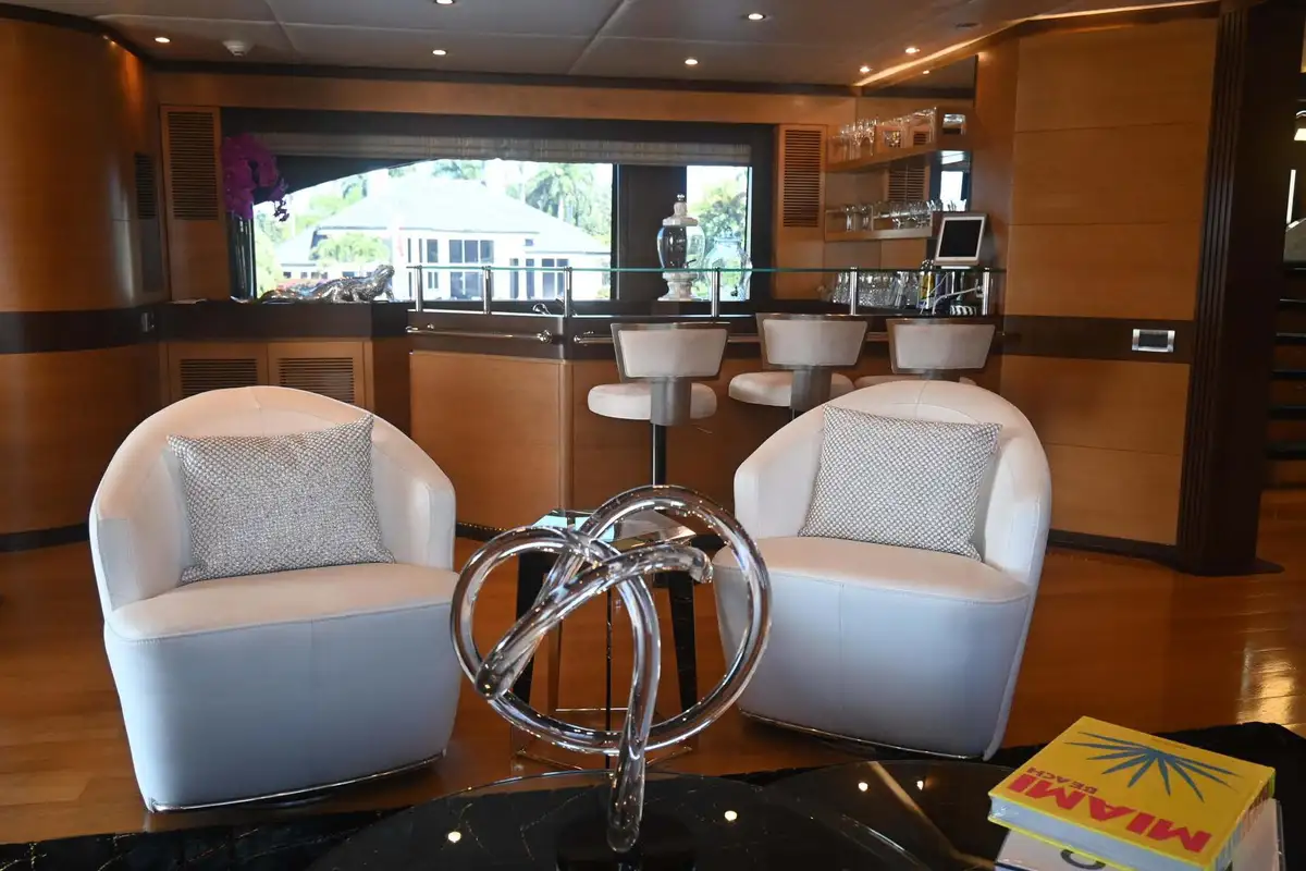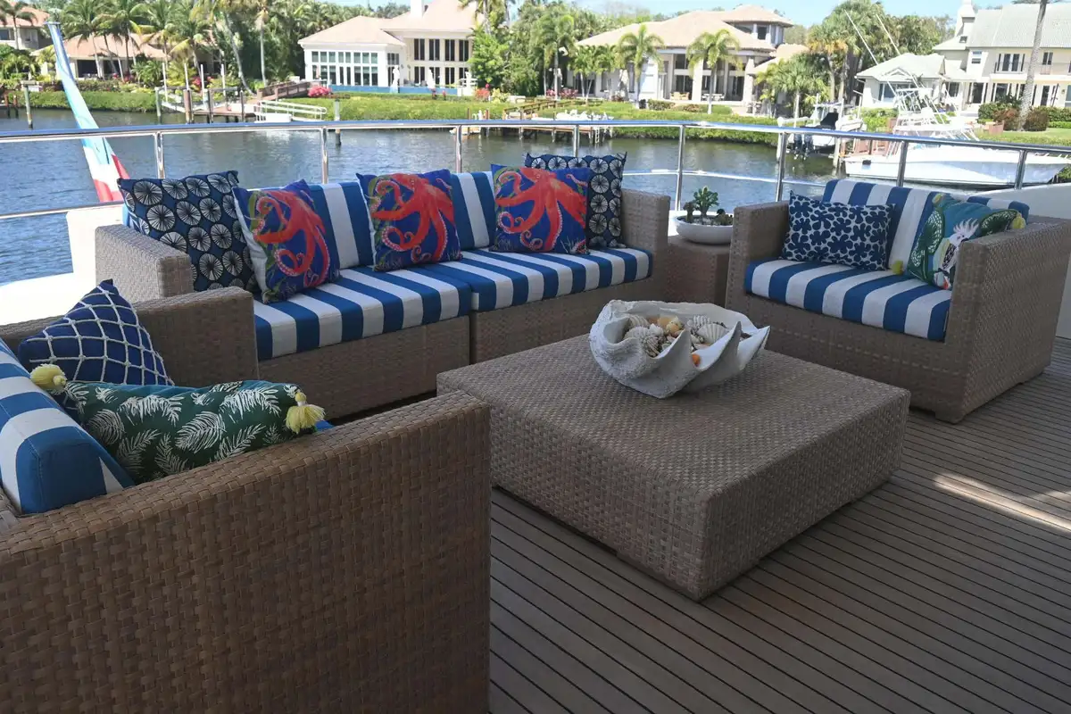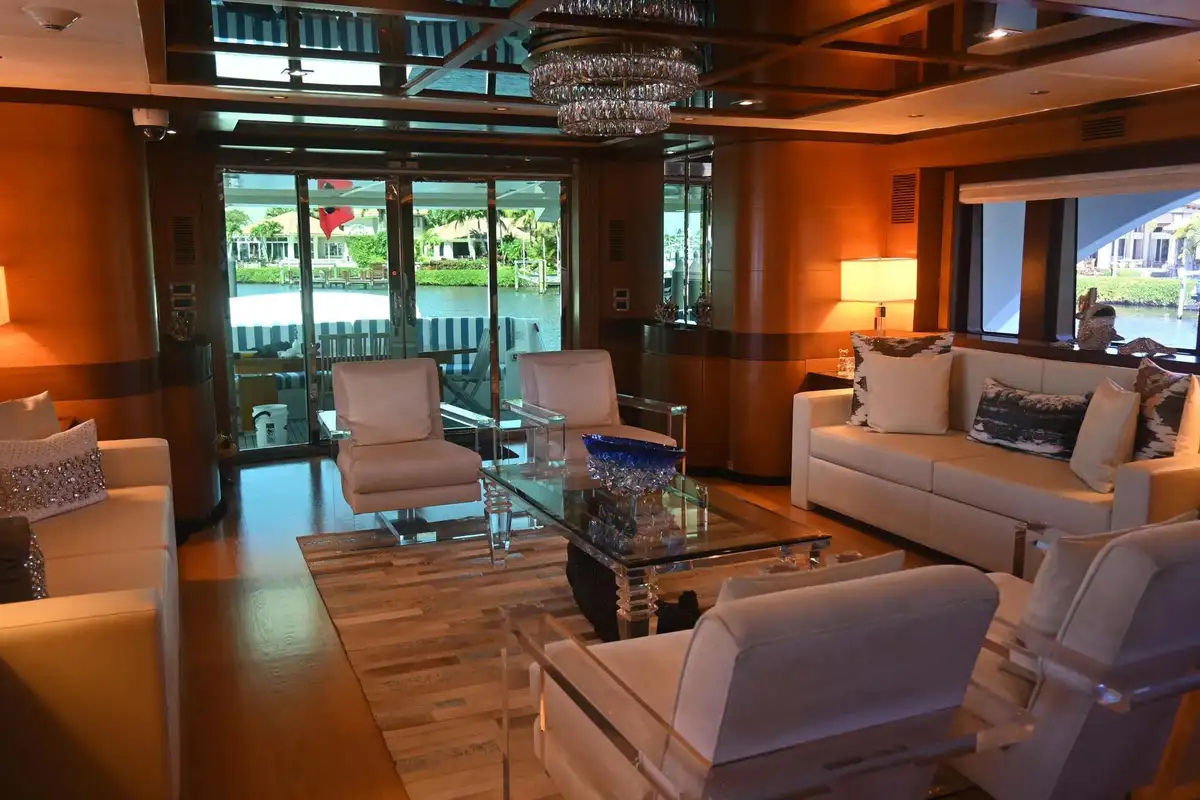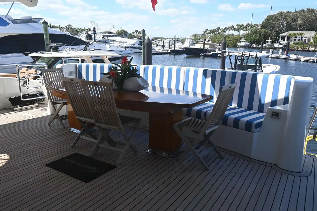 KIMBERLIE, the personification of a carefully thought-out design made for comfort, contains 6 staterooms for 12 guests. The master stateroom is situated on the main deck, spanning the entire beam, and is naturally illuminated by its vast skylights. The lower deck houses 4 wonderful staterooms, 2 with queen beds, and the other 2 with twin beds. The VIP cabin is located on the bridge deck, and forward of the sky lounge. The sundeck provides the perfect ambiance for sun-lounging and taking a dip in the jacuzzi. The bar is strategically located next to the jacuzzi so charter guests can be easily served by crew without having to awkwardly reach. KIMBERLIE is an incredible 360 GT yacht with an abundance of space.