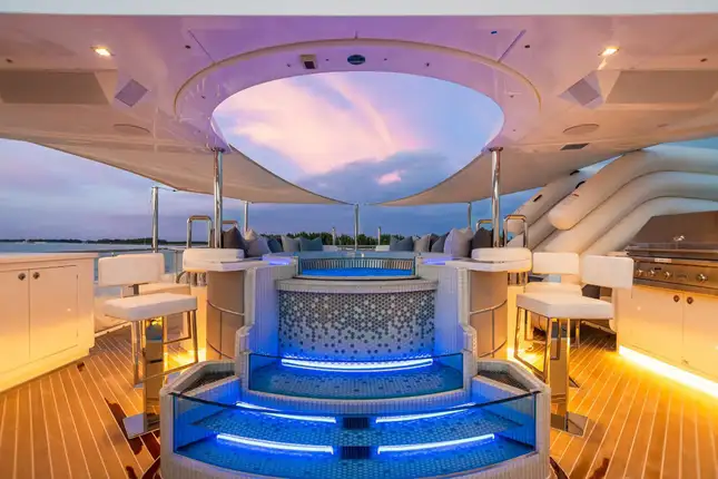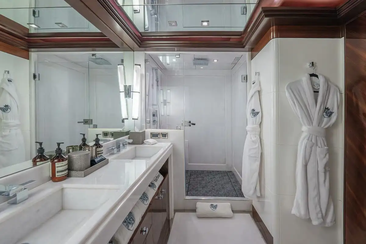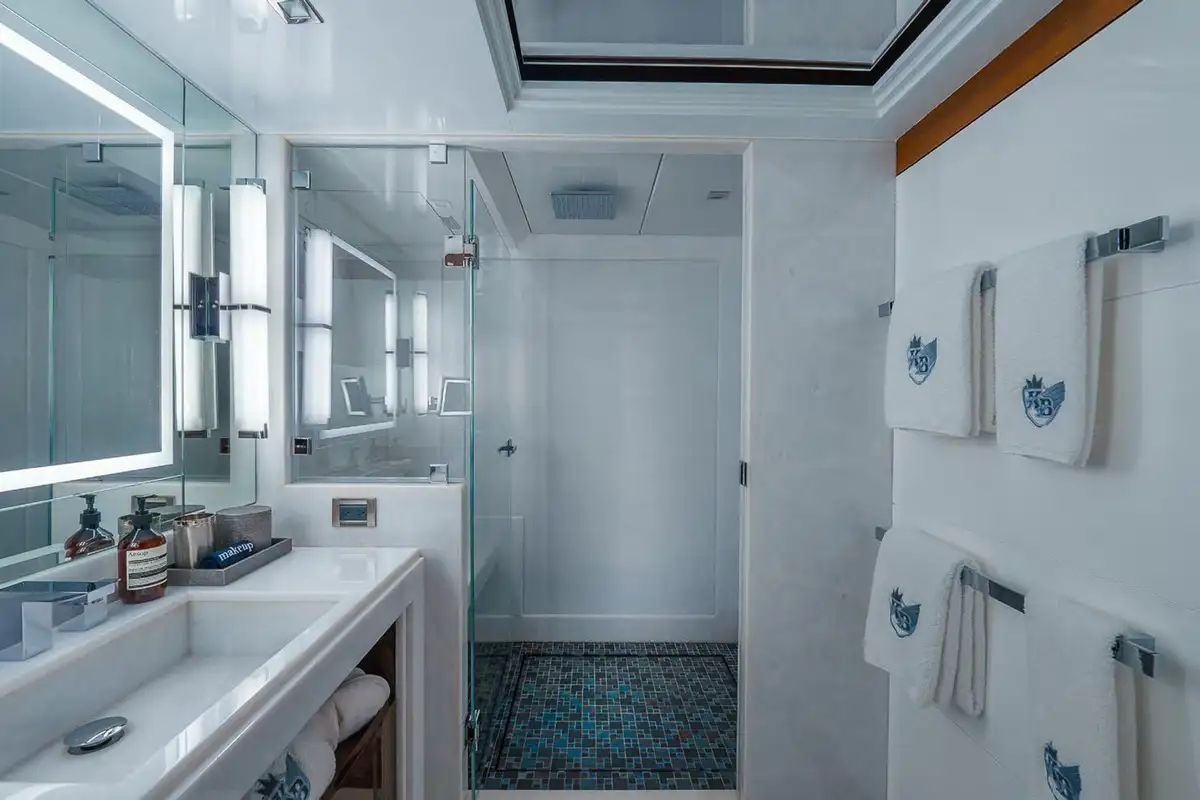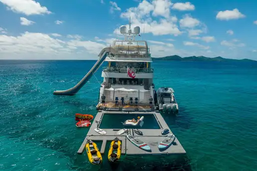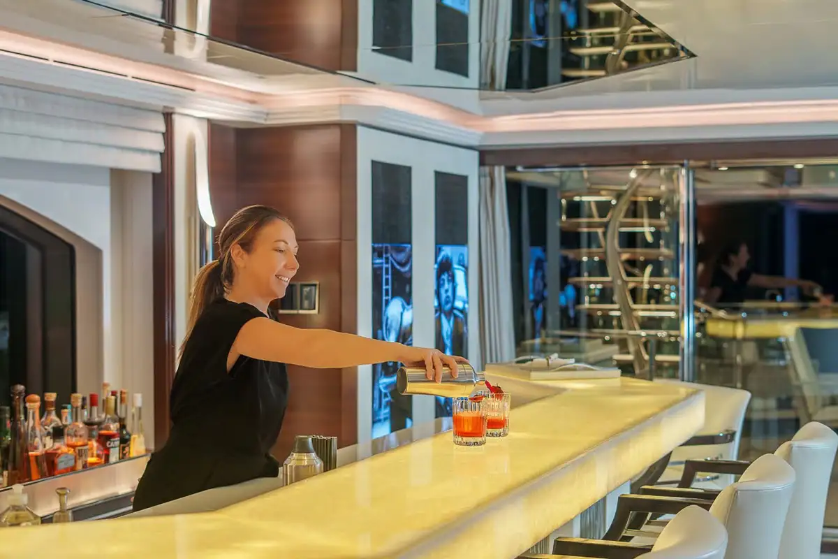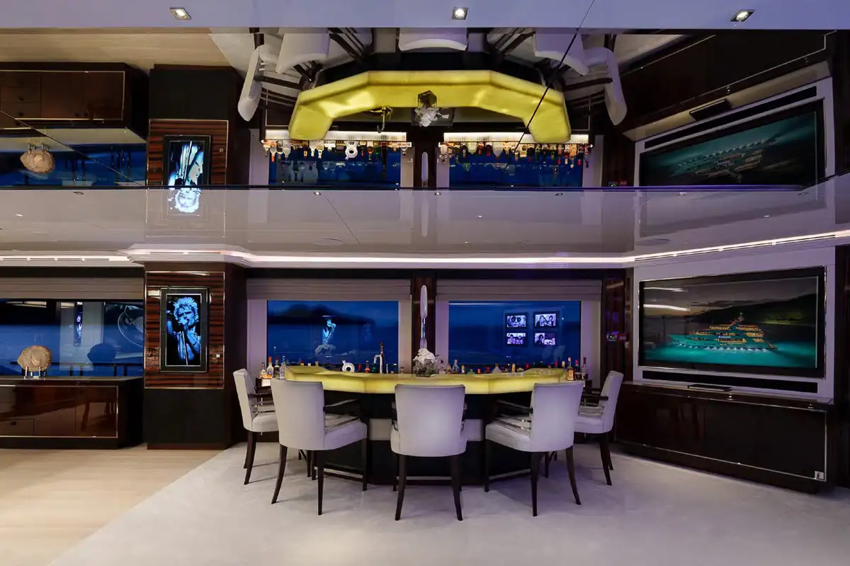 Her sundeck is a spectacular outdoor party zone. The jacuzzi has a three-tier cascading waterfall and a swim-up bar; there’s also a big dining table, a large onyx sit-up bar, sun loungers and sunpads, three TVs and two lounge areas. In the heat of the midday sun, there’s an exhilarating three-storey water slide so you can launch yourself from the sundeck straight into the sea for a refreshing dip.