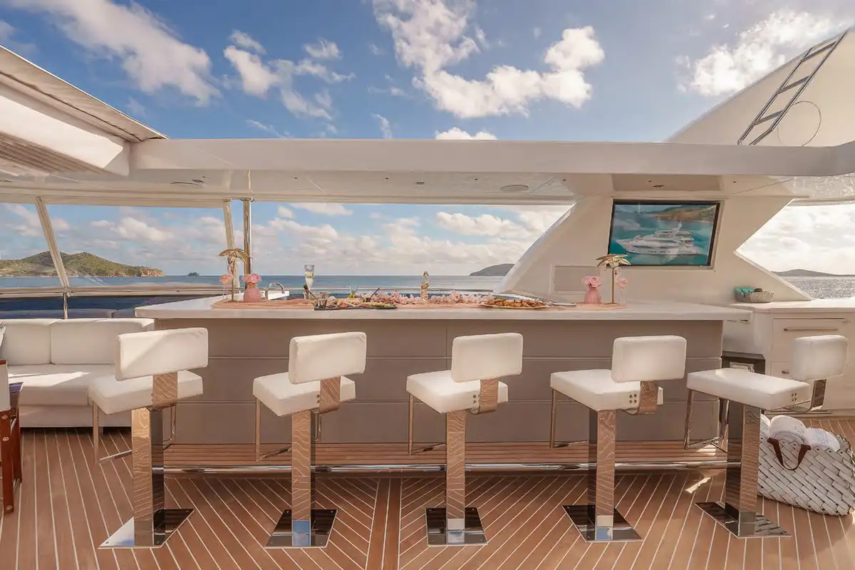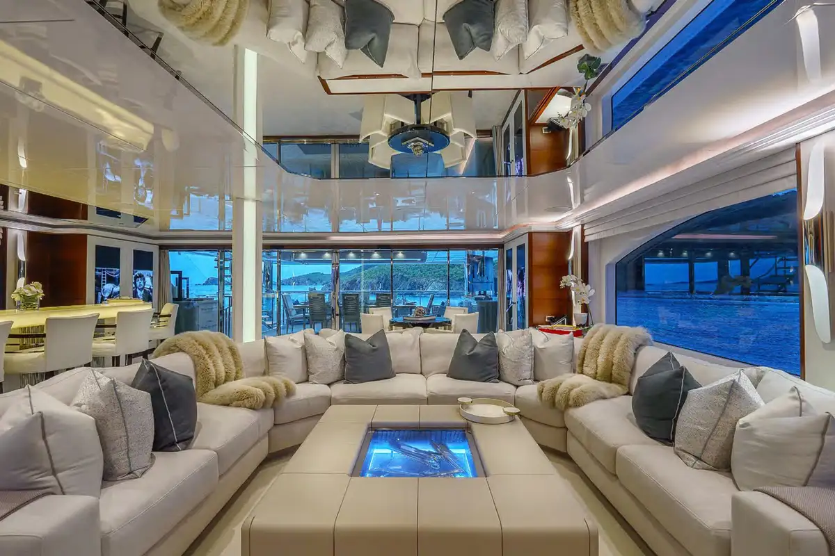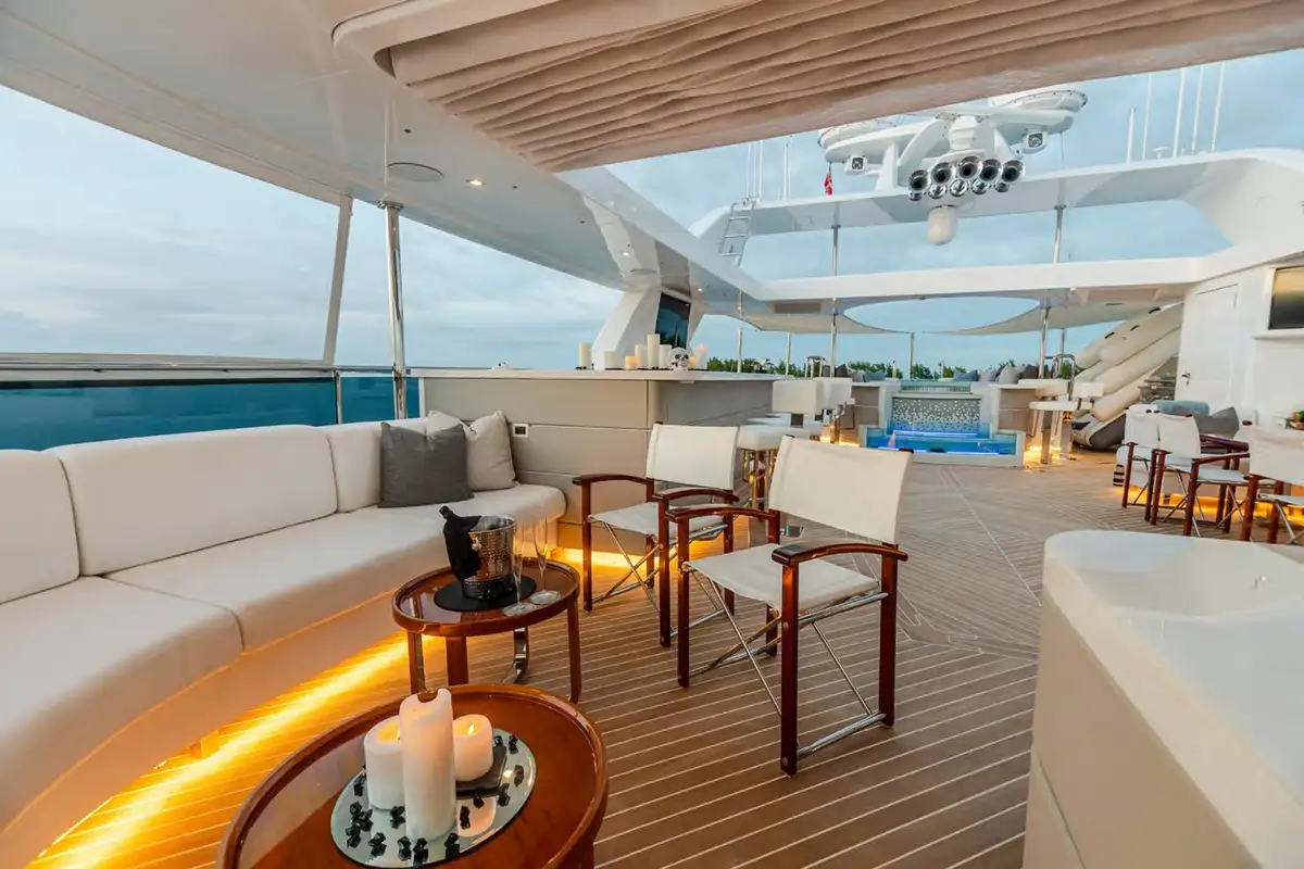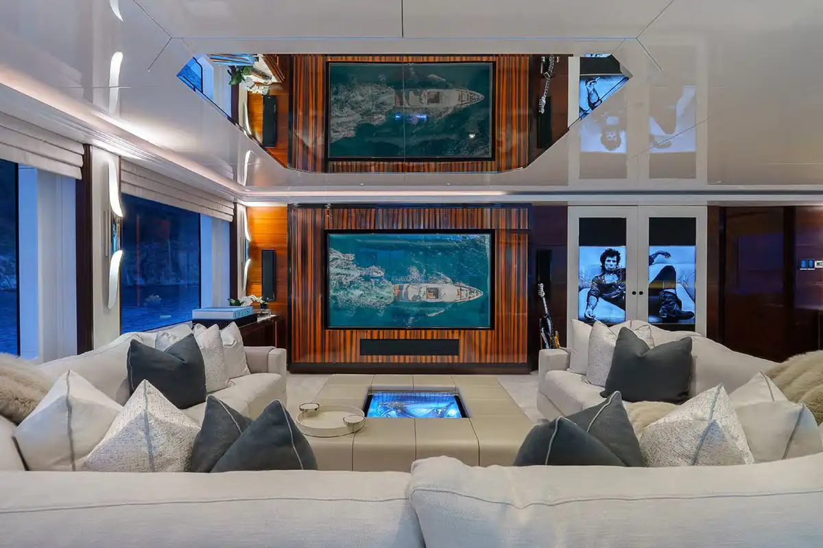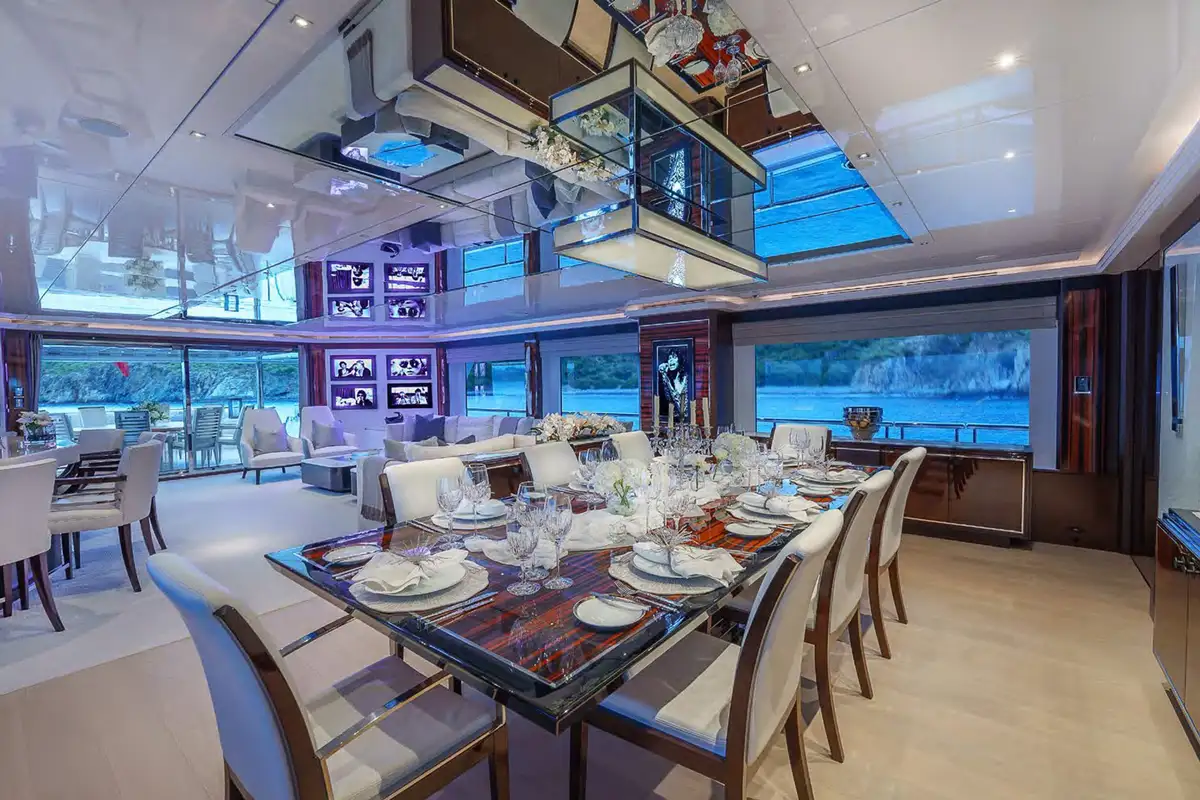 Her sundeck is a spectacular outdoor party zone. The jacuzzi has a three-tier cascading waterfall and a swim-up bar; there’s also a big dining table, a large onyx sit-up bar, sun loungers and sunpads, three TVs and two lounge areas. In the heat of the midday sun, there’s an exhilarating three-storey water slide so you can launch yourself from the sundeck straight into the sea for a refreshing dip.