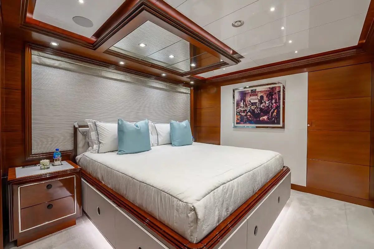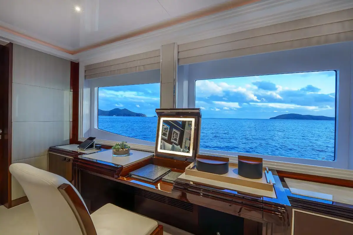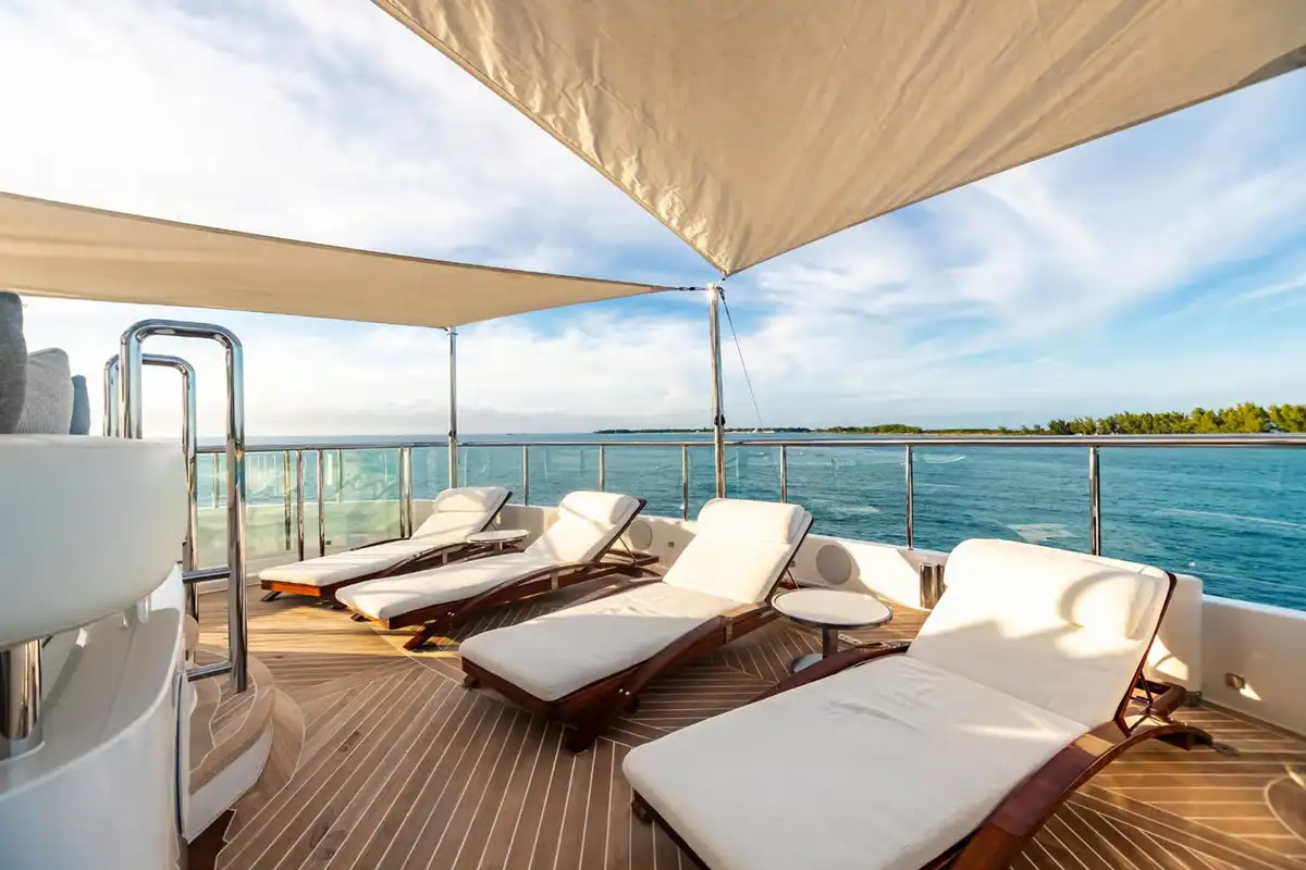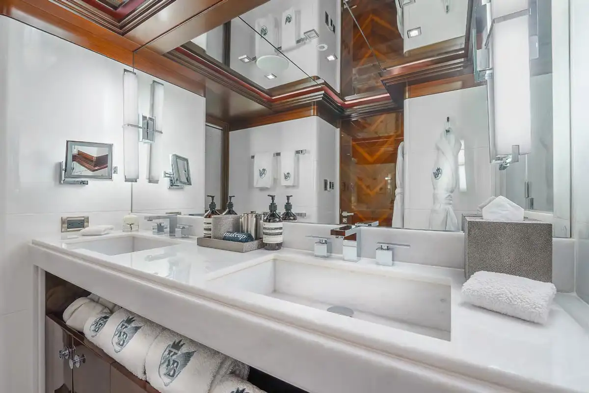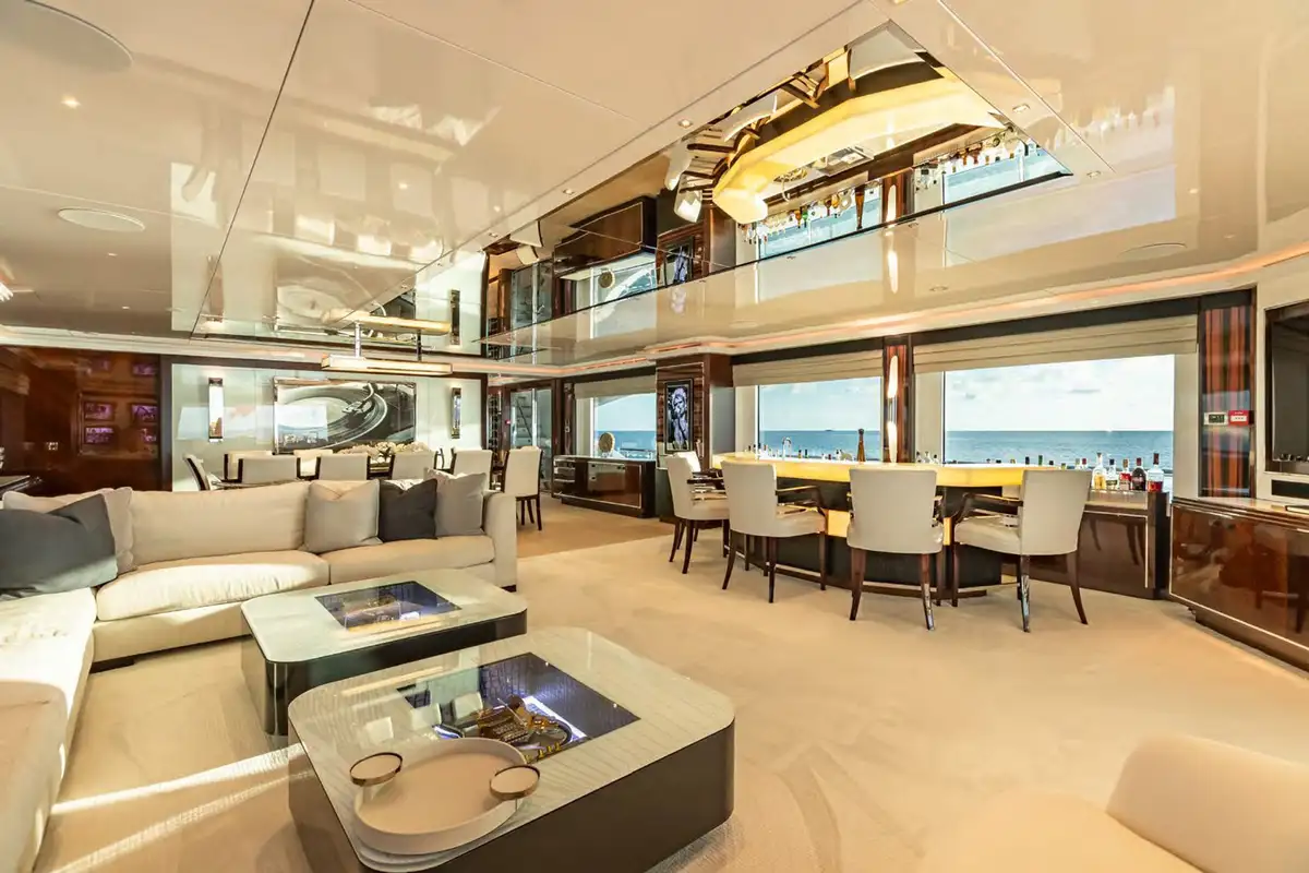 Her sundeck is a spectacular outdoor party zone. The jacuzzi has a three-tier cascading waterfall and a swim-up bar; there’s also a big dining table, a large onyx sit-up bar, sun loungers and sunpads, three TVs and two lounge areas. In the heat of the midday sun, there’s an exhilarating three-storey water slide so you can launch yourself from the sundeck straight into the sea for a refreshing dip.