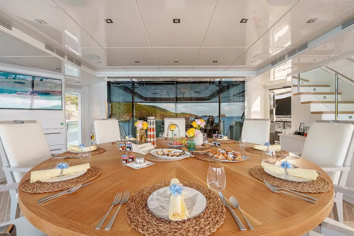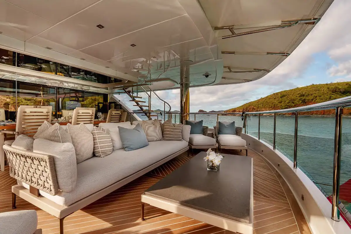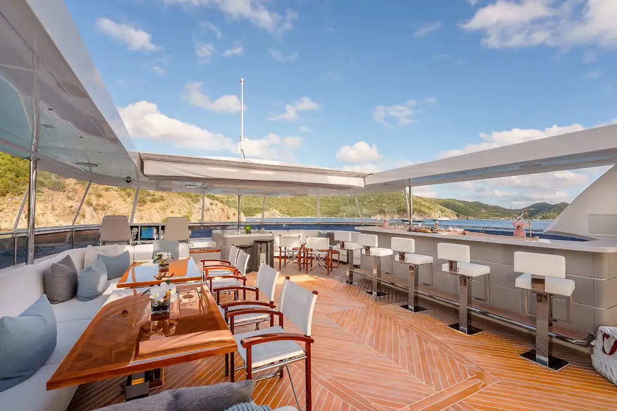She also has two aft-facing decks, each with a covered dining area and a variety of seating spaces, so when you fancy a different vibe or scene you can simply go to a different deck. The foredeck lounge is yet another inviting option where you can sit and strum a guitar in the cool sea breeze or recline with a book or magazine on the expansive sunpads.