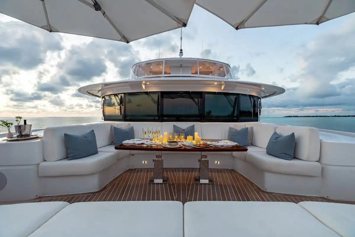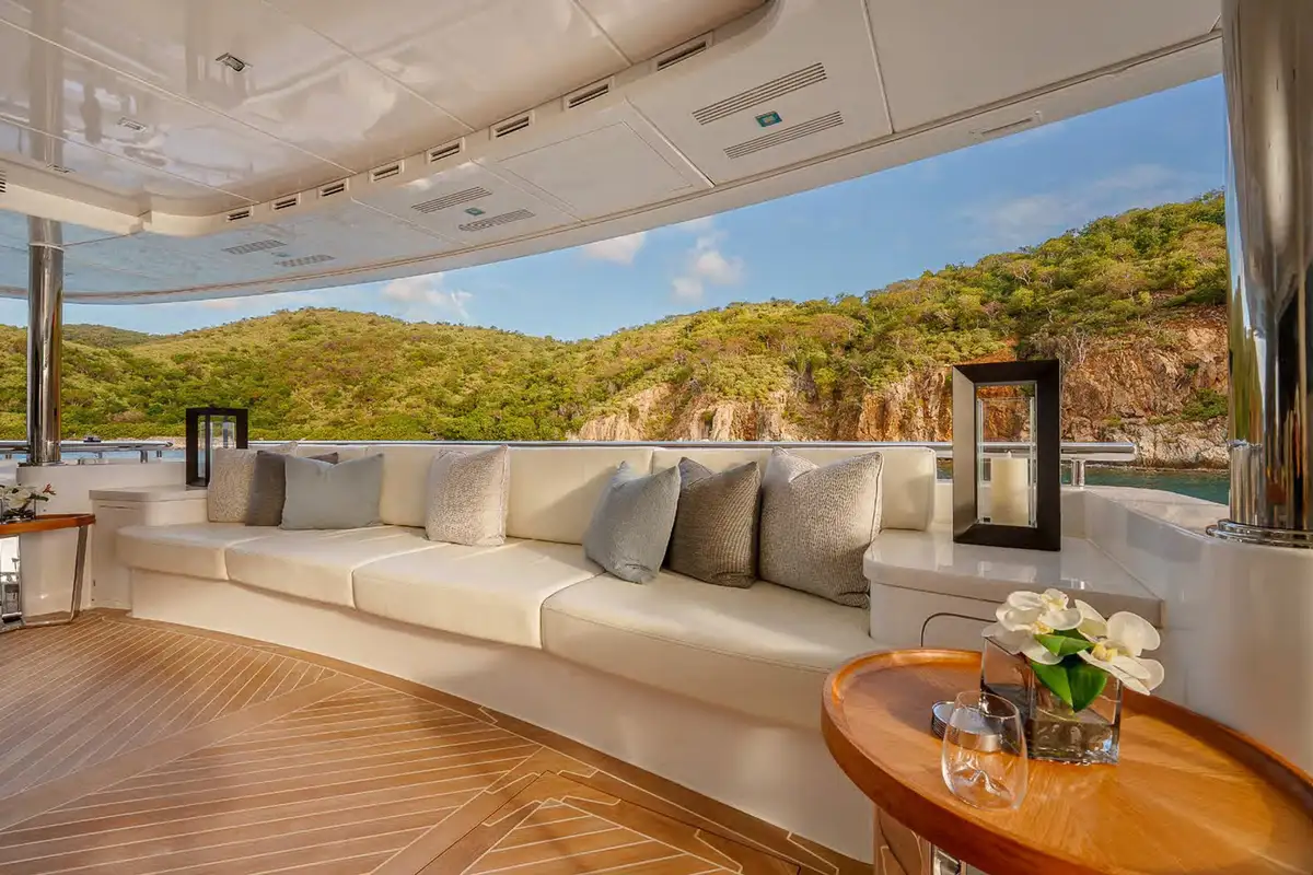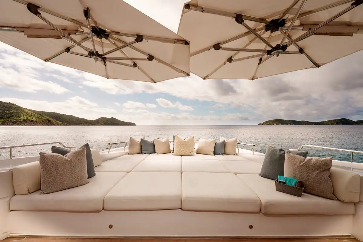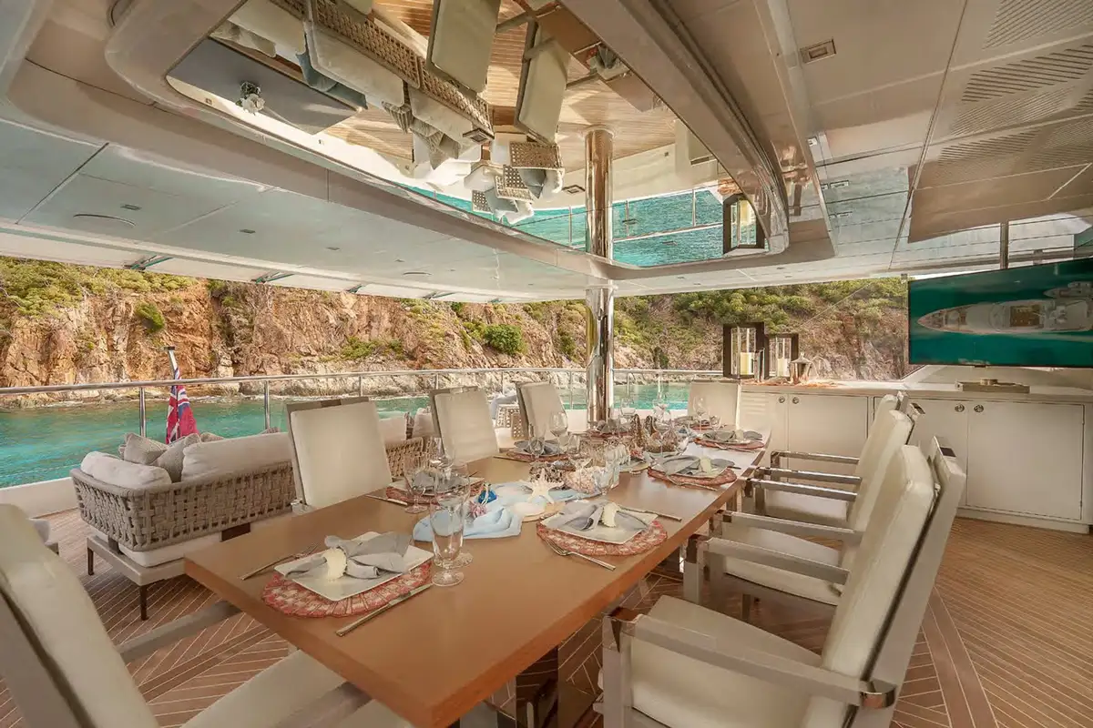She also has two aft-facing decks, each with a covered dining area and a variety of seating spaces, so when you fancy a different vibe or scene you can simply go to a different deck. The foredeck lounge is yet another inviting option where you can sit and strum a guitar in the cool sea breeze or recline with a book or magazine on the expansive sunpads.
