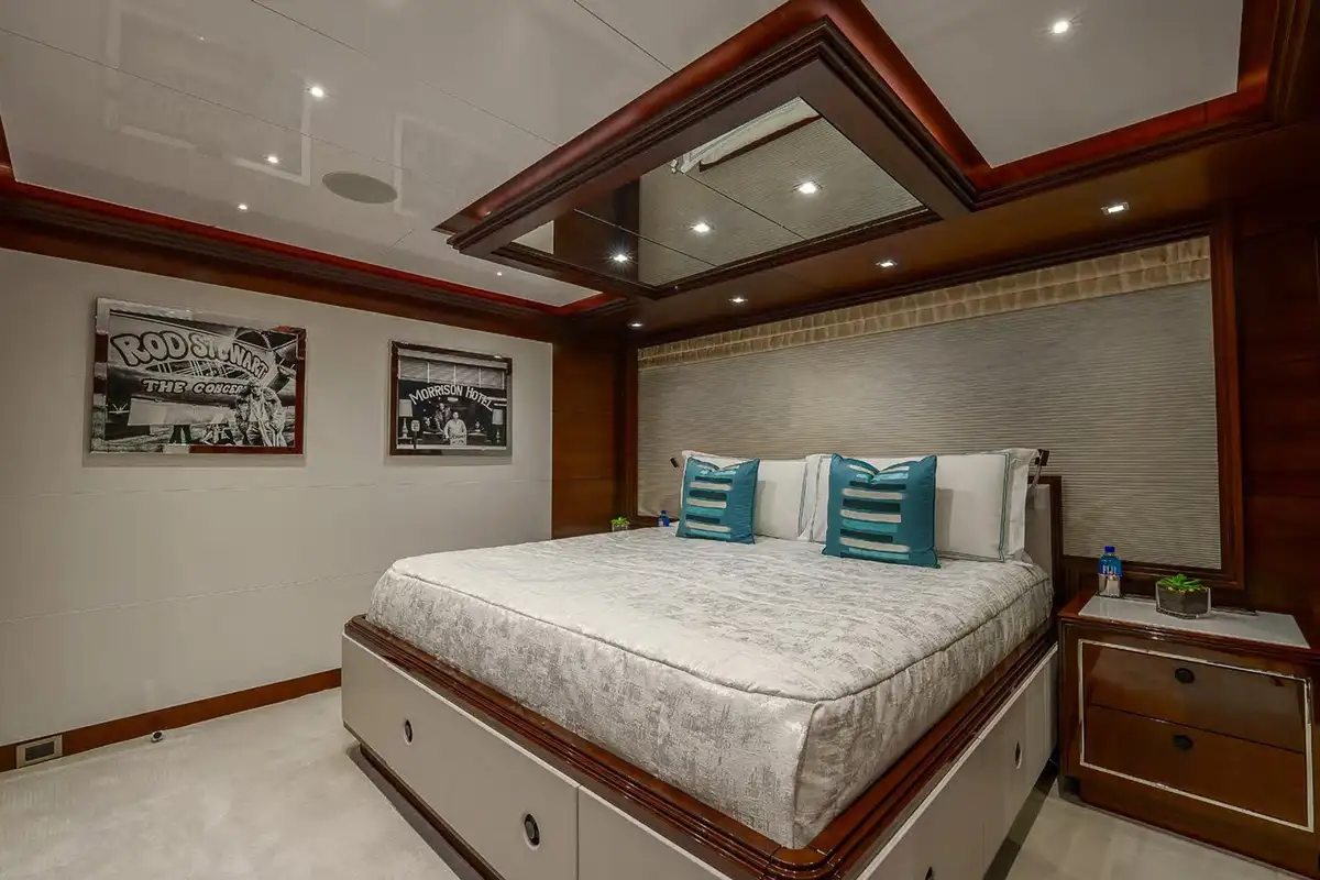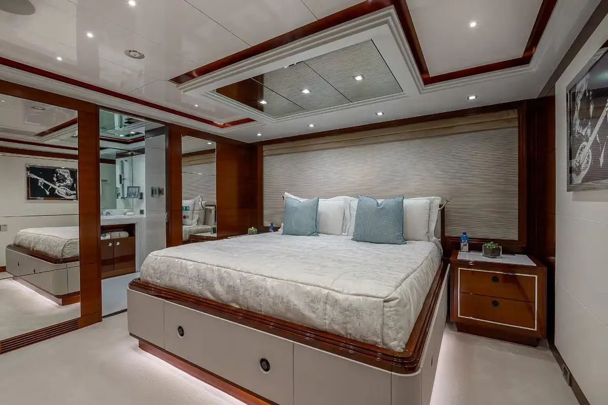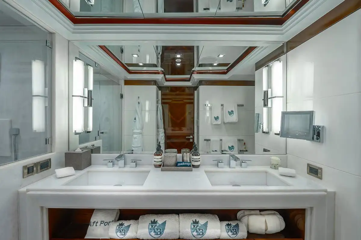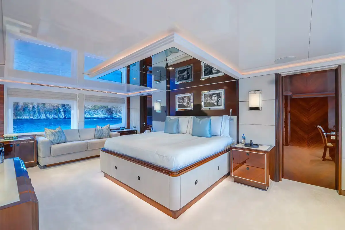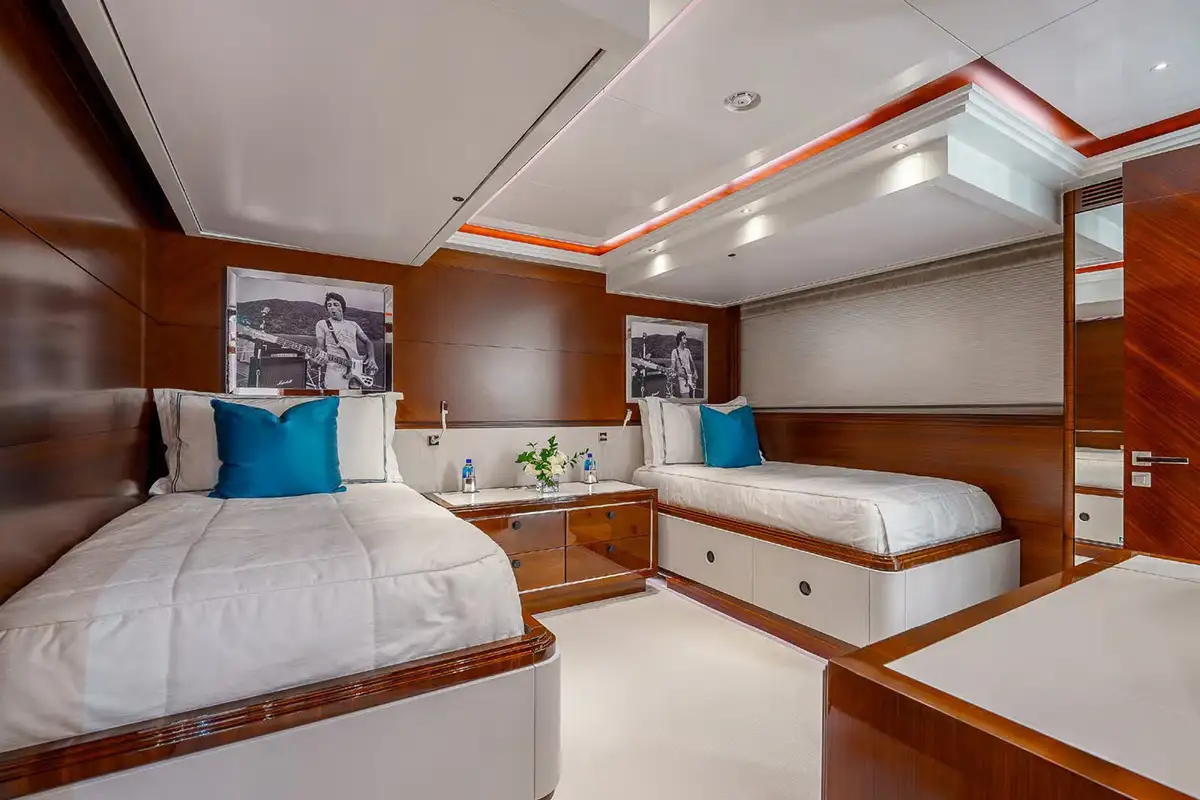KING BABY’s interior spaces are alluring, inspiring and supremely comfortable, with large saloons on two levels, audiophile entertainment systems and sharp modern décor to perfectly match the unique rock-inspired décor. Up front on the main deck, the master suite is a spacious full-beam cabin with a big, plush sofa, a study desk, king size bed and a two-person bath as well as a rain room shower in the marble en suite bathroom. The other four cabins – three doubles and a twin, on the lower deck – are all nicely finished in the same signature style.