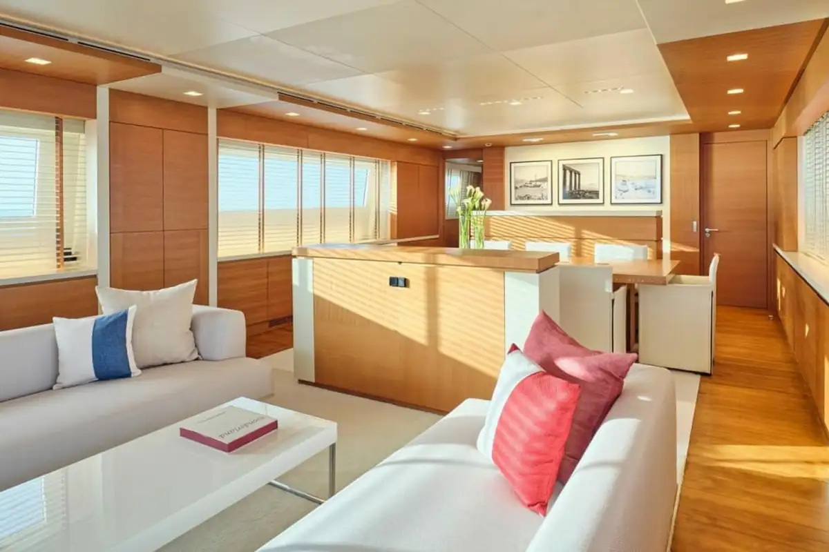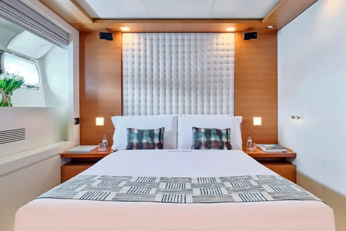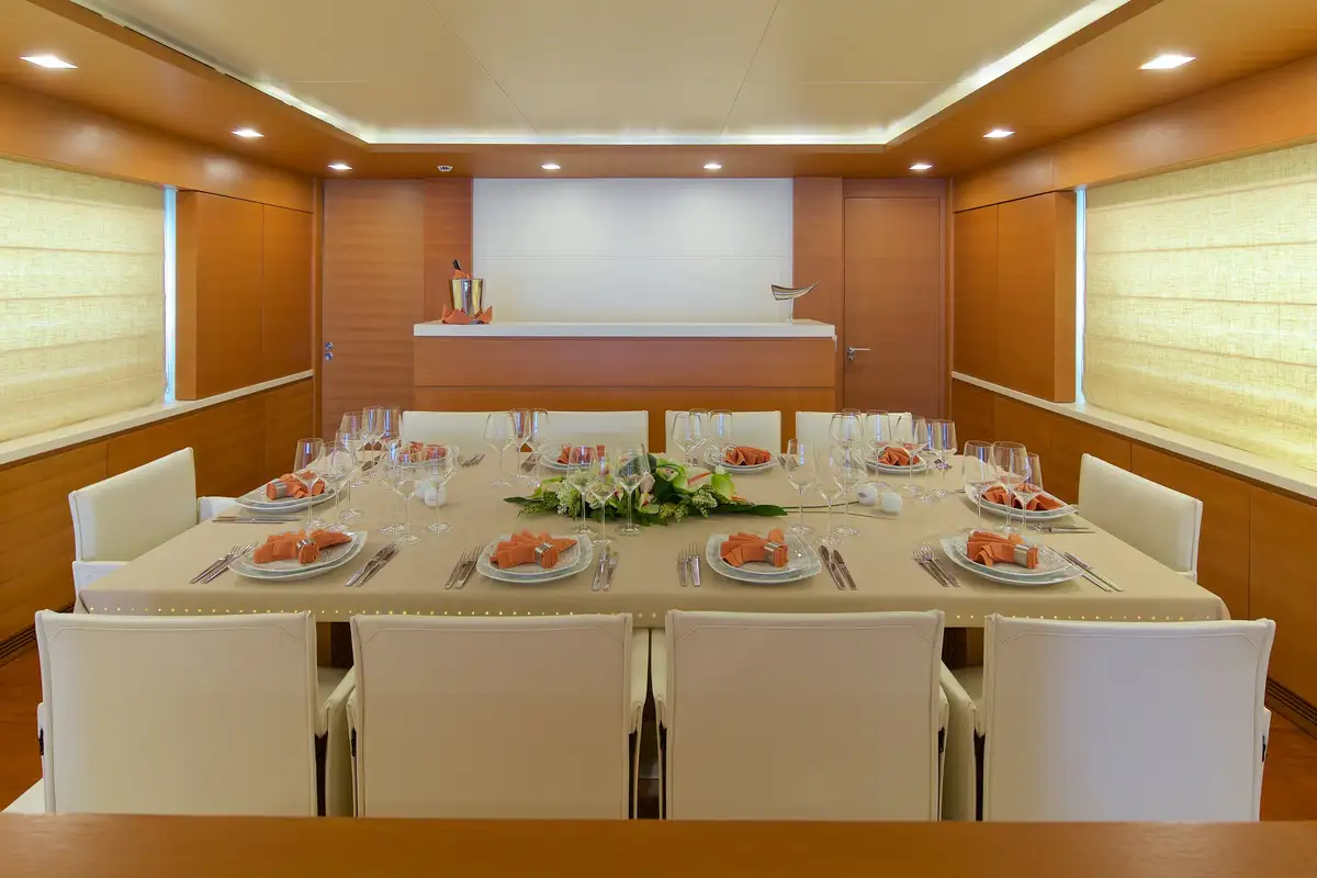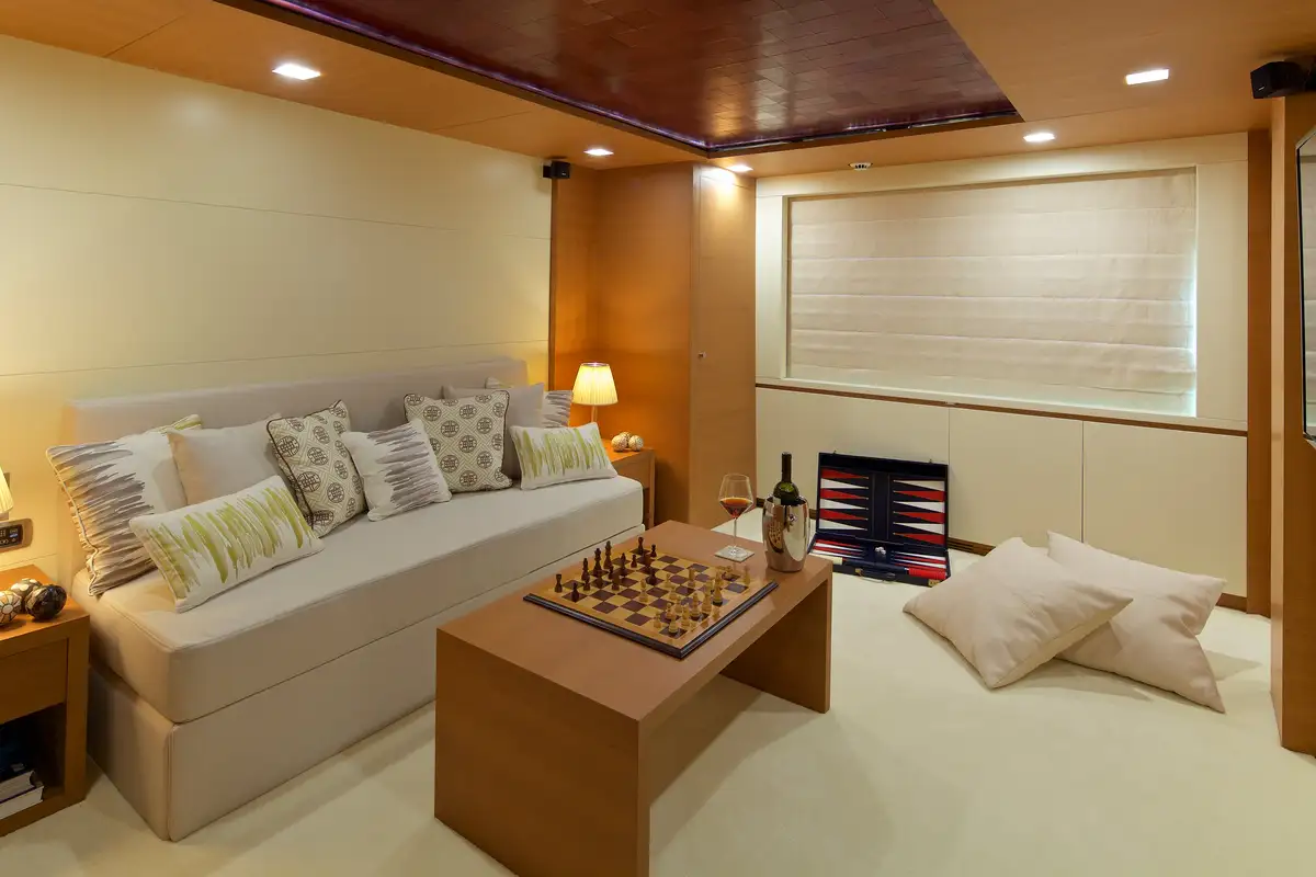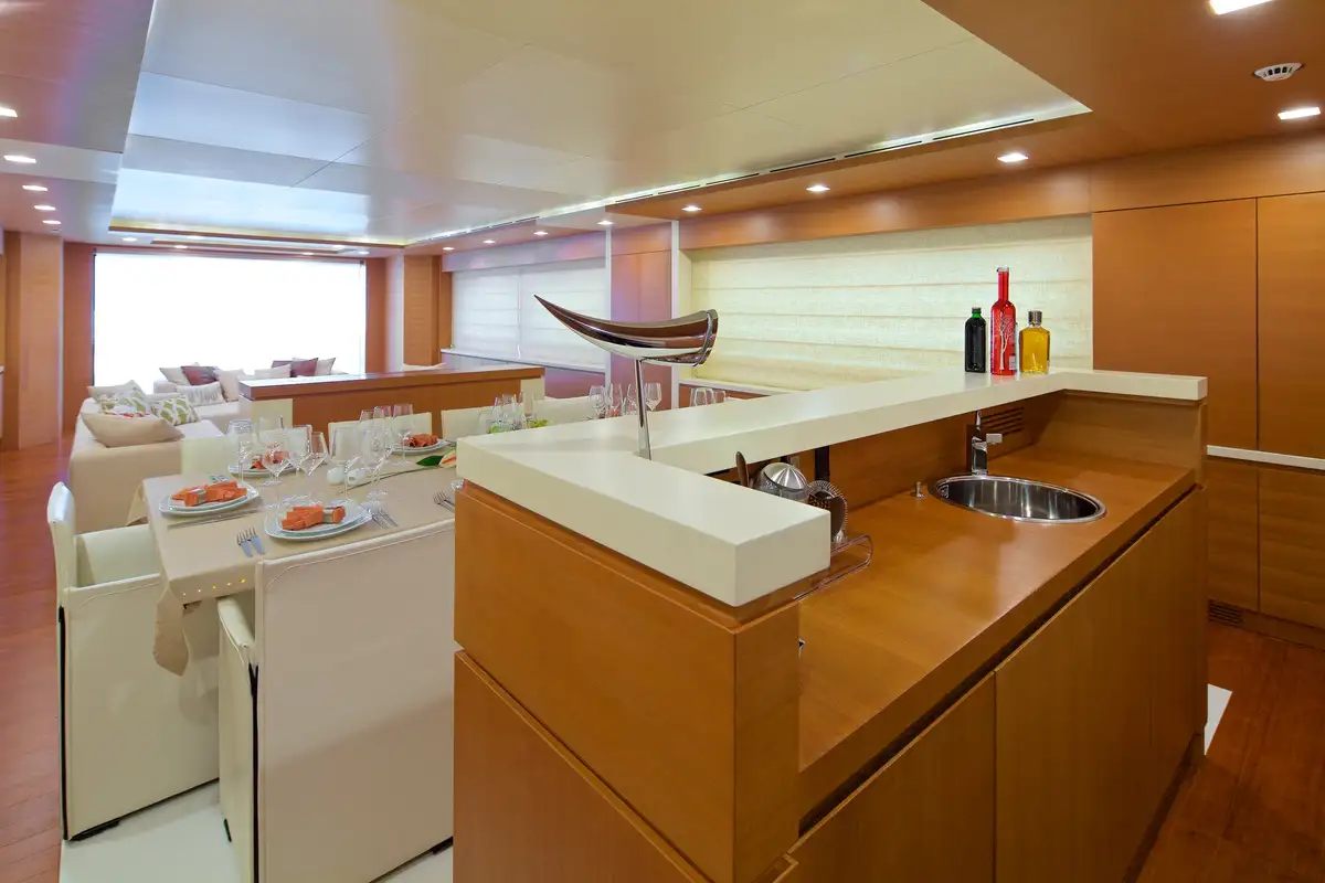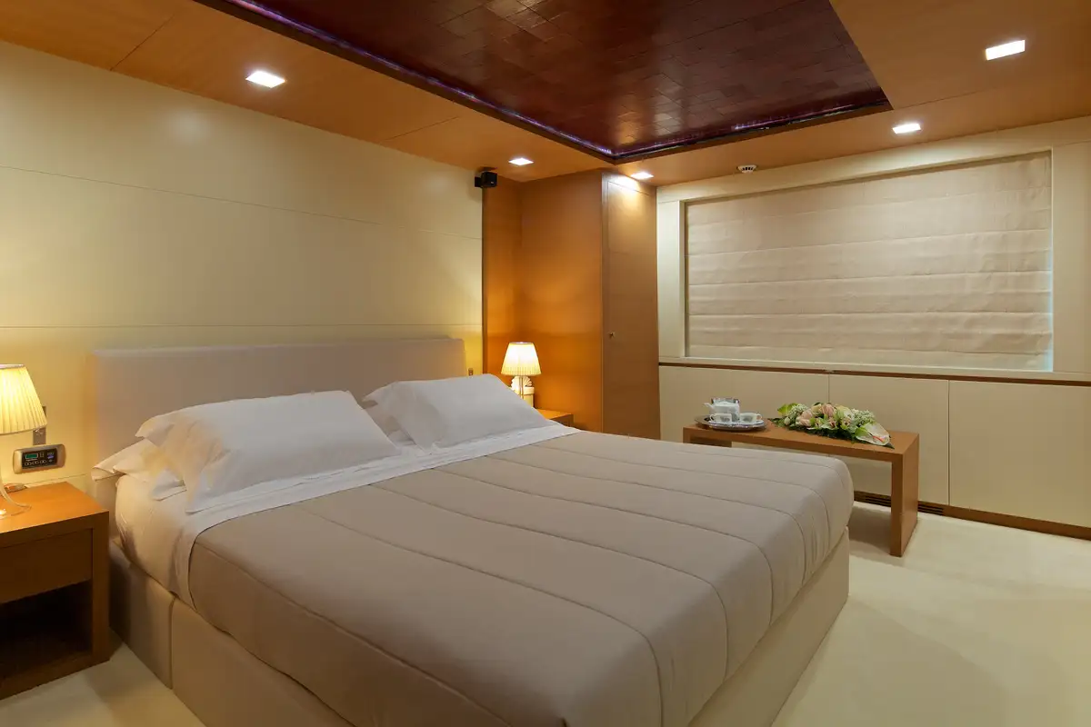 Accommodation on the lower deck includes a full beam master cabin with king size bed, two twin cabins with pullman berths in each (for children) and two double cabins. On the main deck there is one double VIP cabin. Across this flexible layout, a maximum of 12 guests can be accommodated. Overall, her interior is a good example of classic, minimalist Italian design which keeps it bright and fresh.