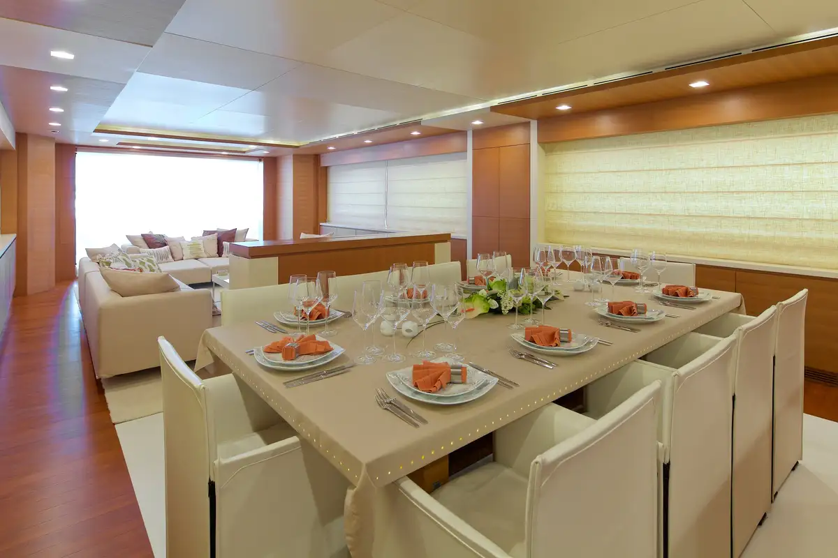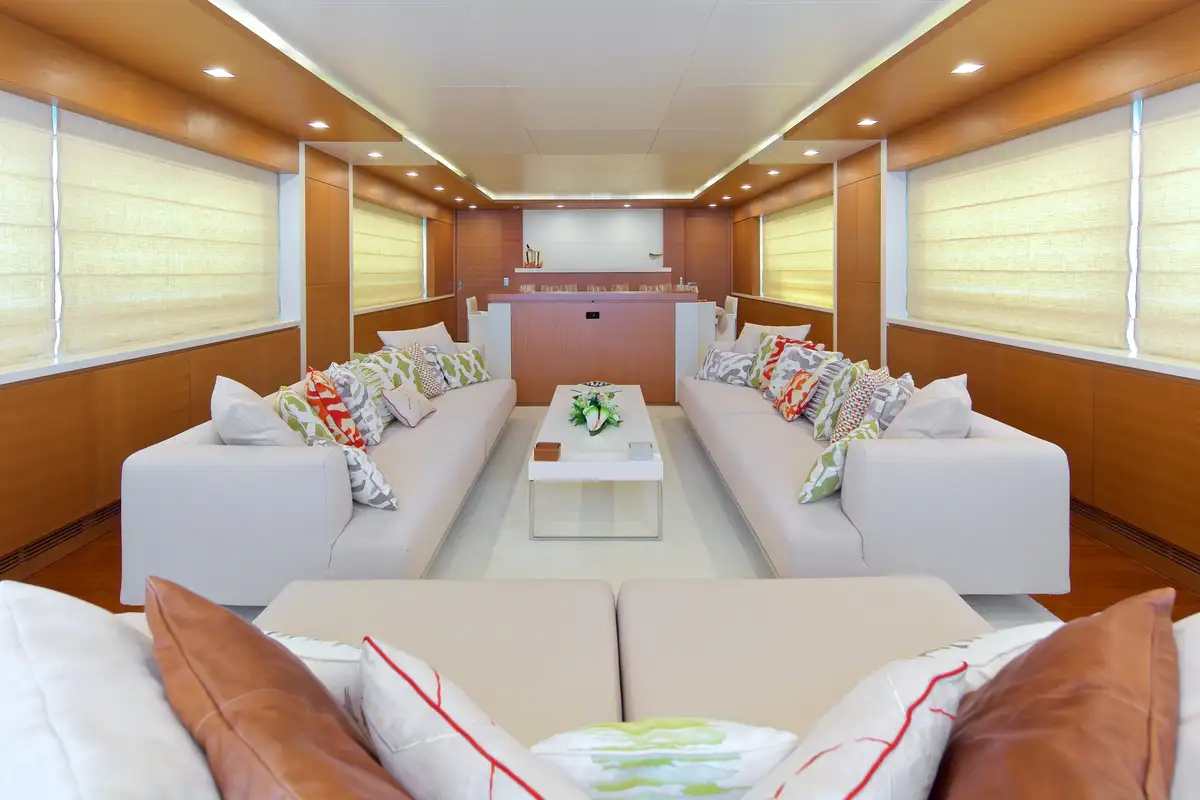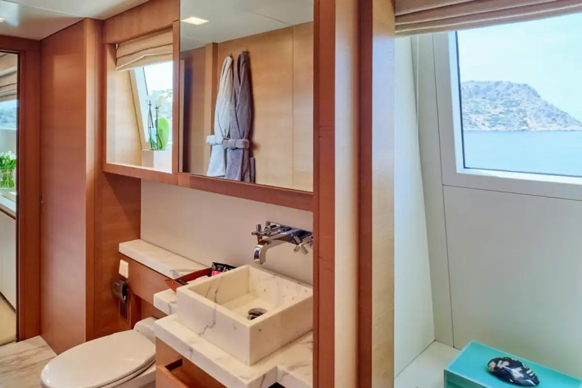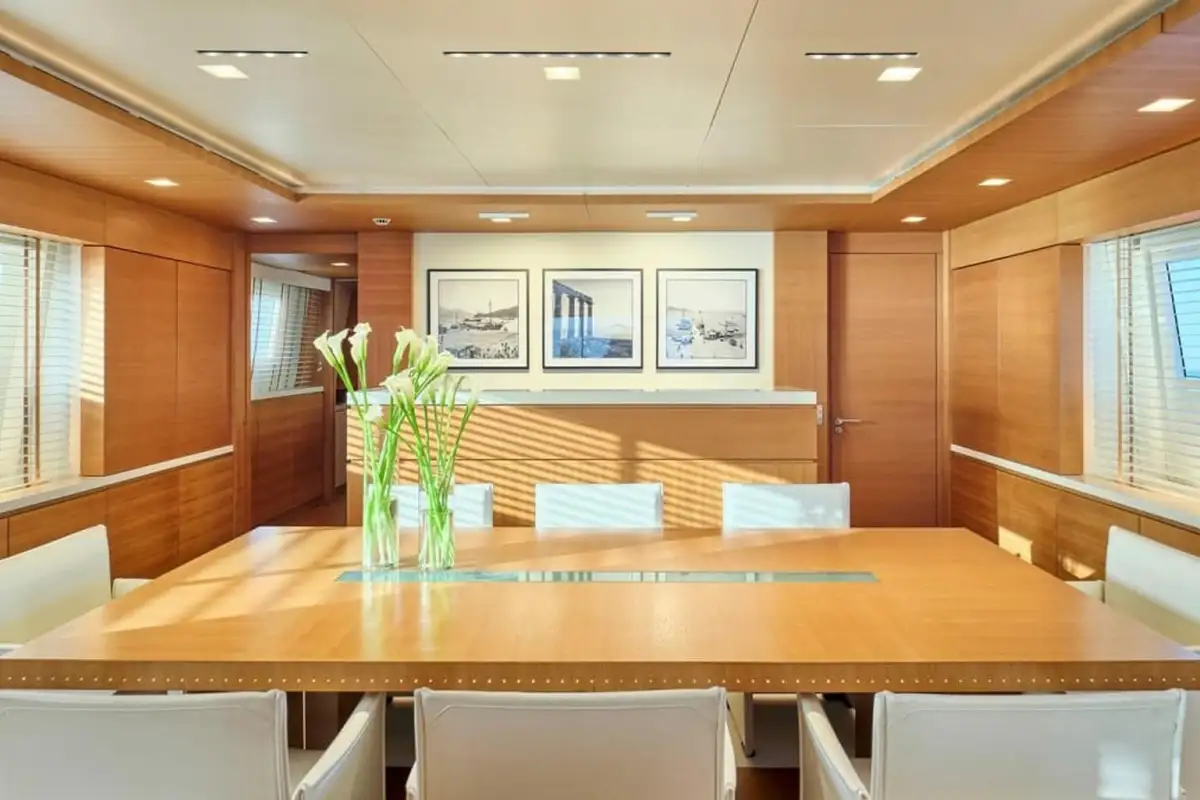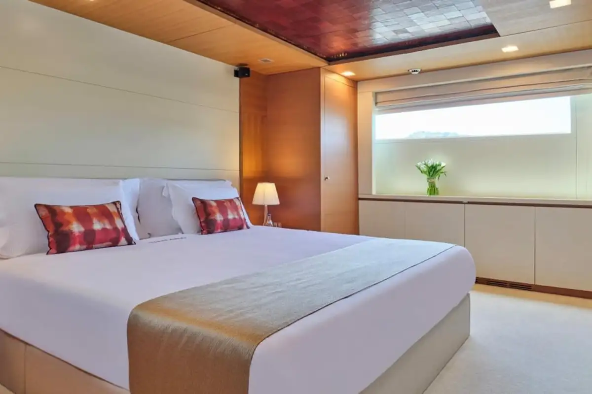 Accommodation on the lower deck includes a full beam master cabin with king size bed, two twin cabins with pullman berths in each (for children) and two double cabins. On the main deck there is one double VIP cabin. Across this flexible layout, a maximum of 12 guests can be accommodated. Overall, her interior is a good example of classic, minimalist Italian design which keeps it bright and fresh.
