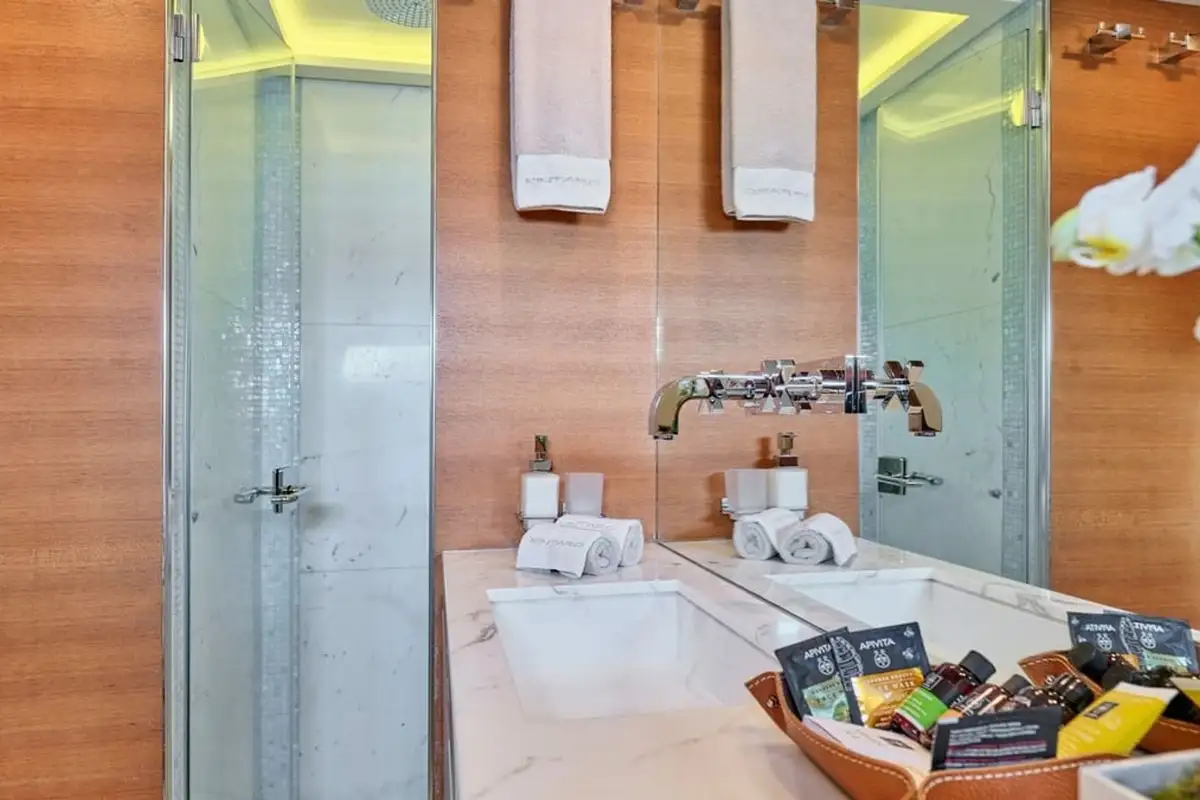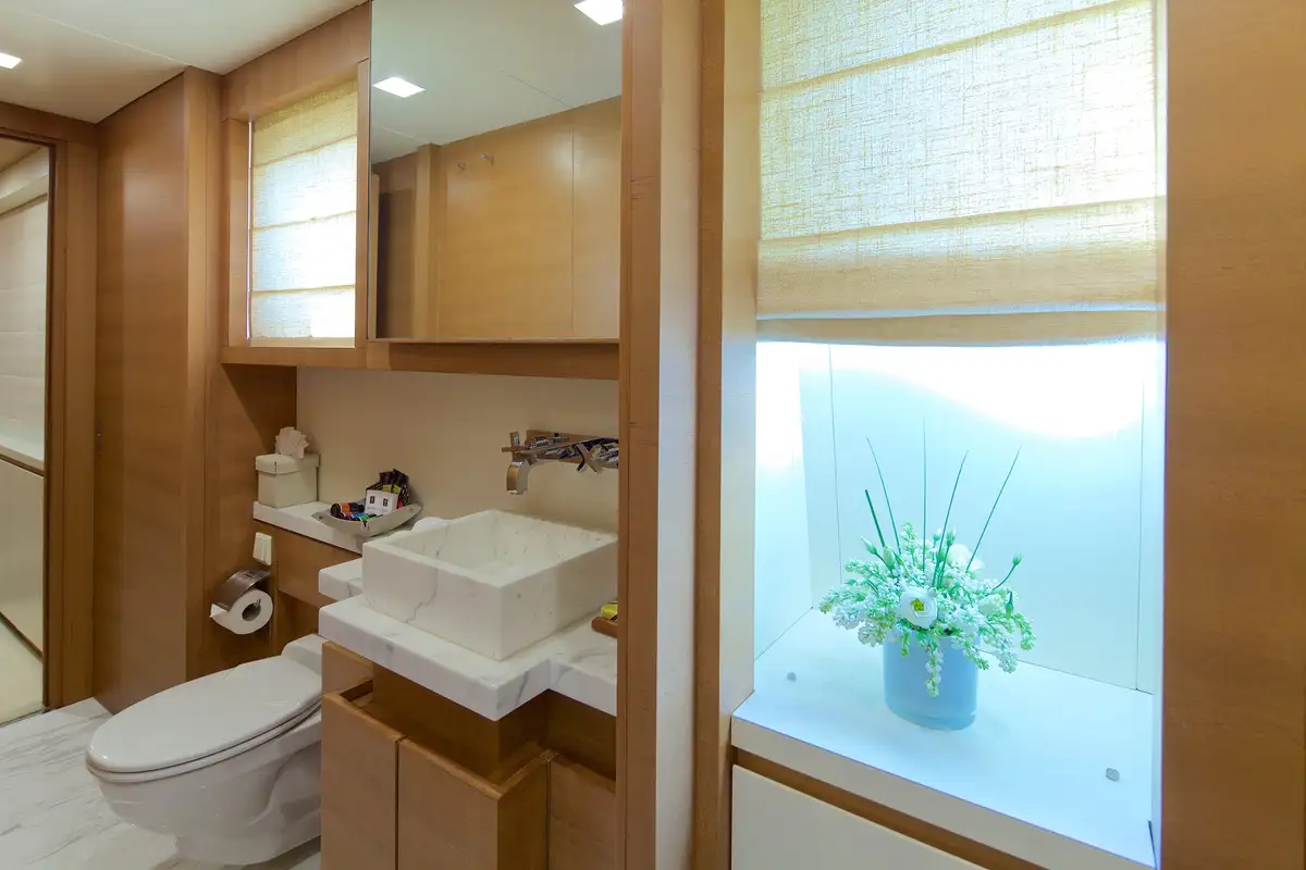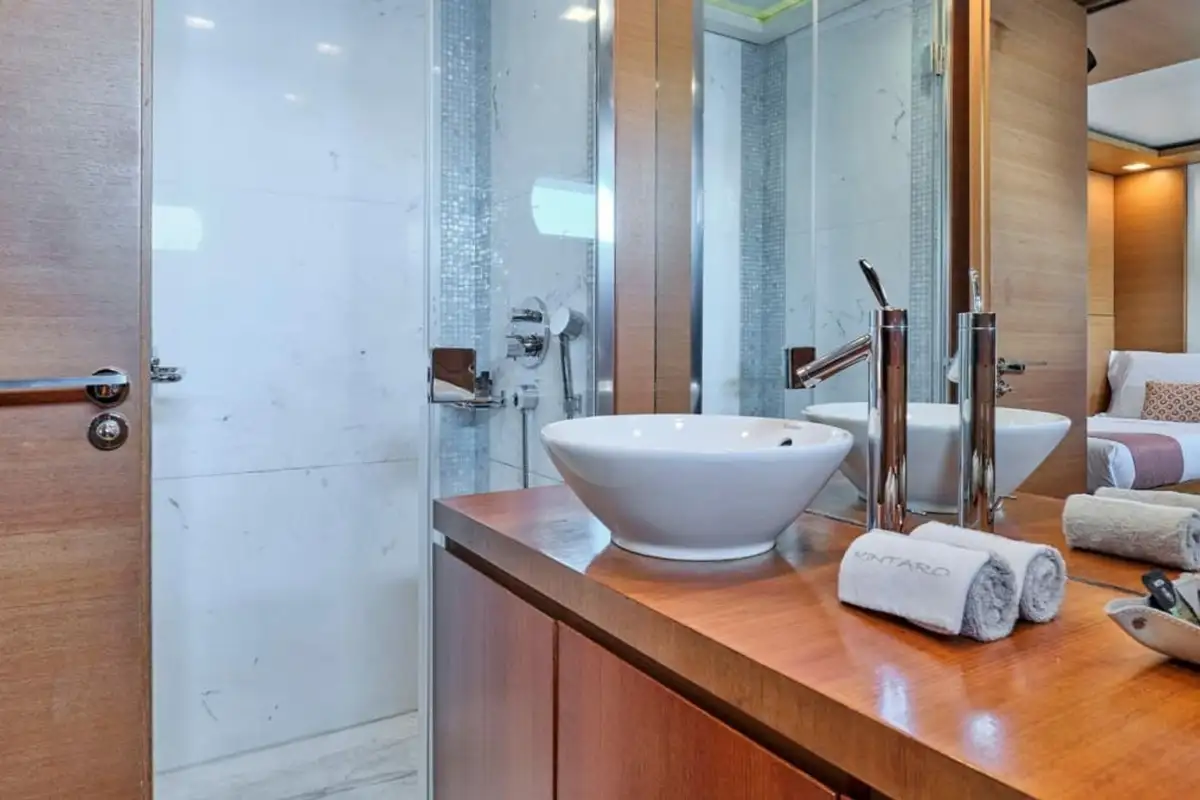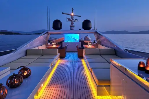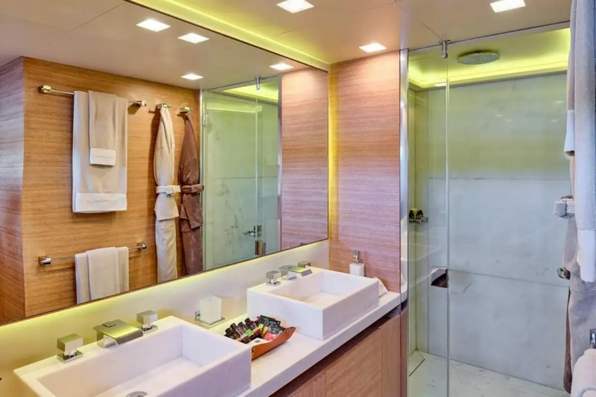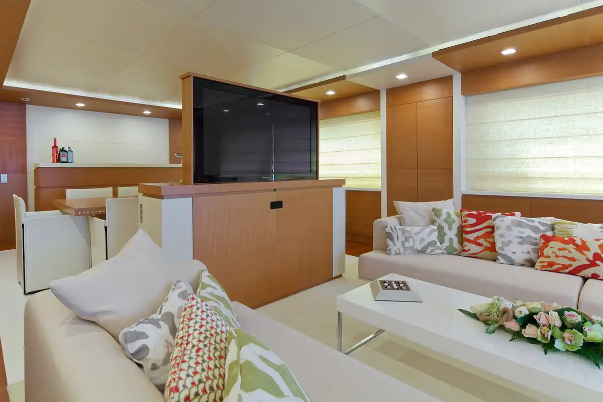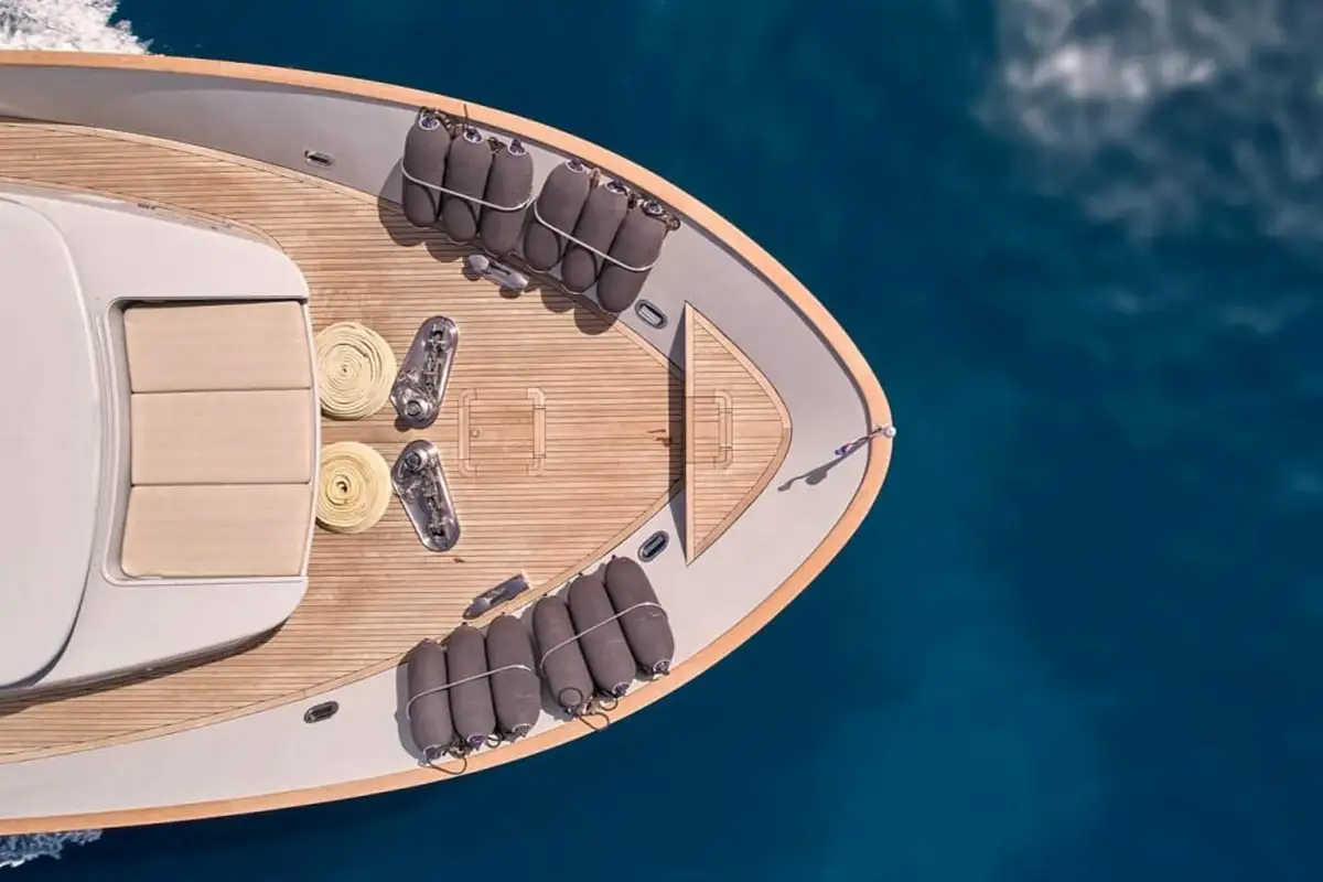 Accommodation on the lower deck includes a full beam master cabin with king size bed, two twin cabins with pullman berths in each (for children) and two double cabins. On the main deck there is one double VIP cabin. Across this flexible layout, a maximum of 12 guests can be accommodated. Overall, her interior is a good example of classic, minimalist Italian design which keeps it bright and fresh.