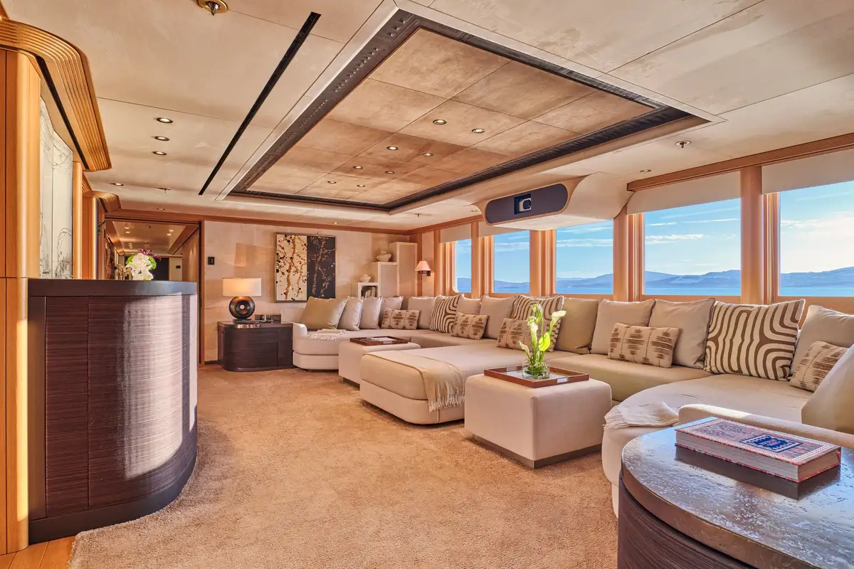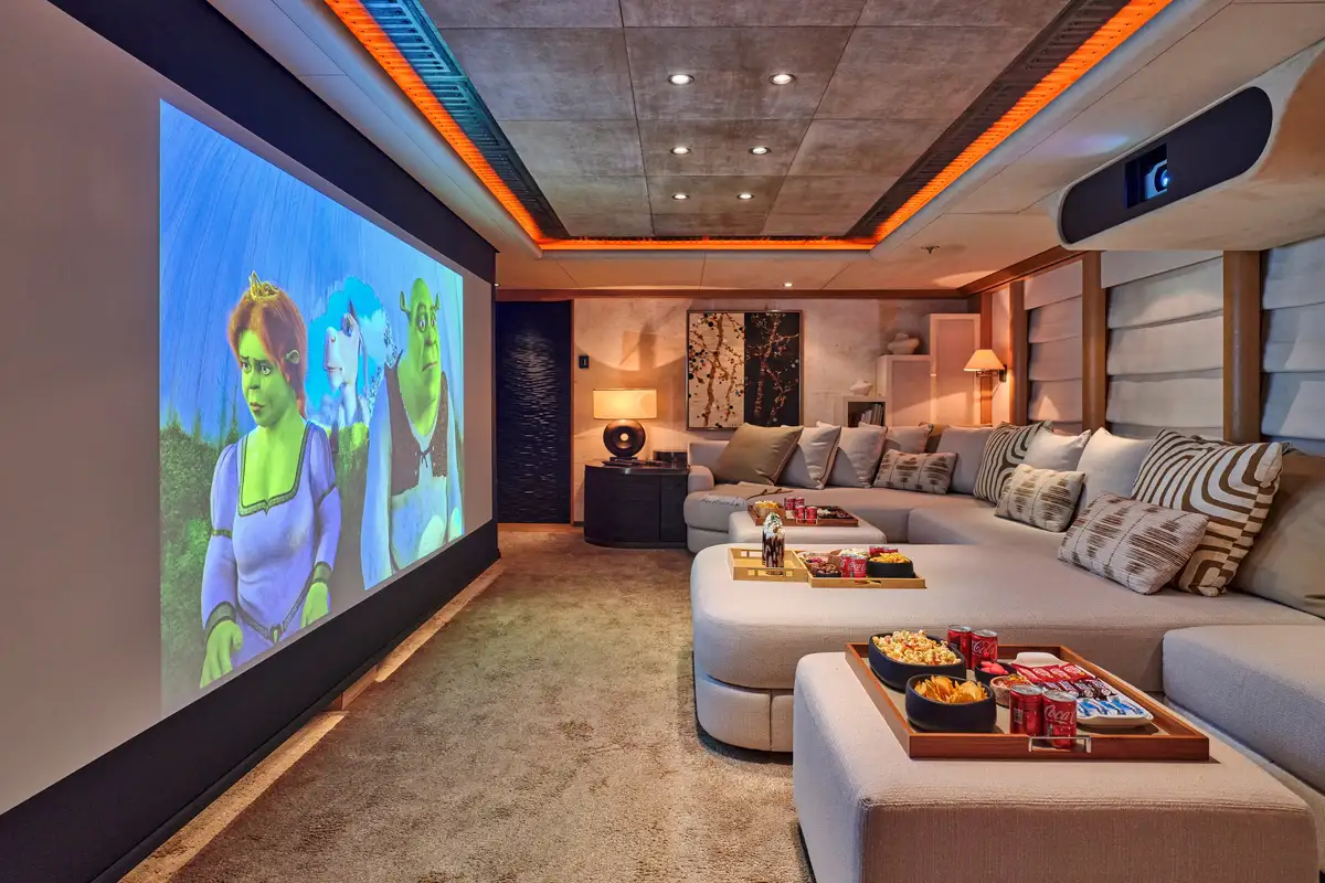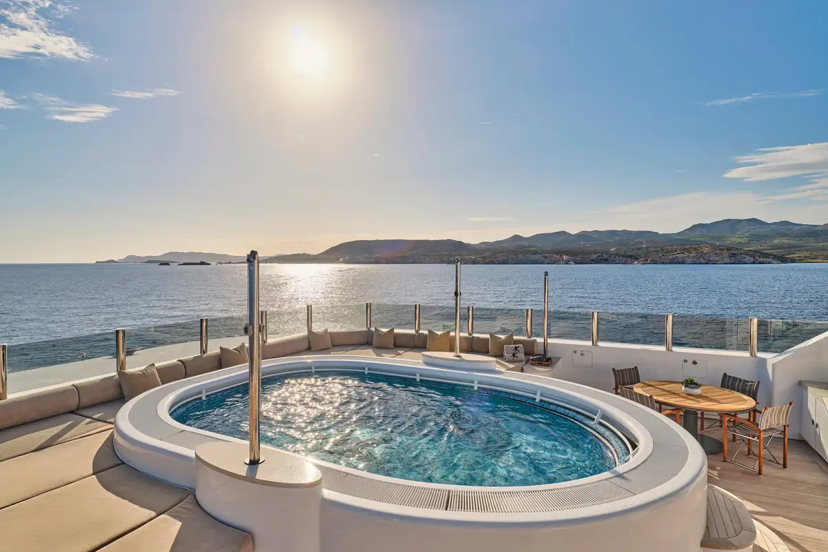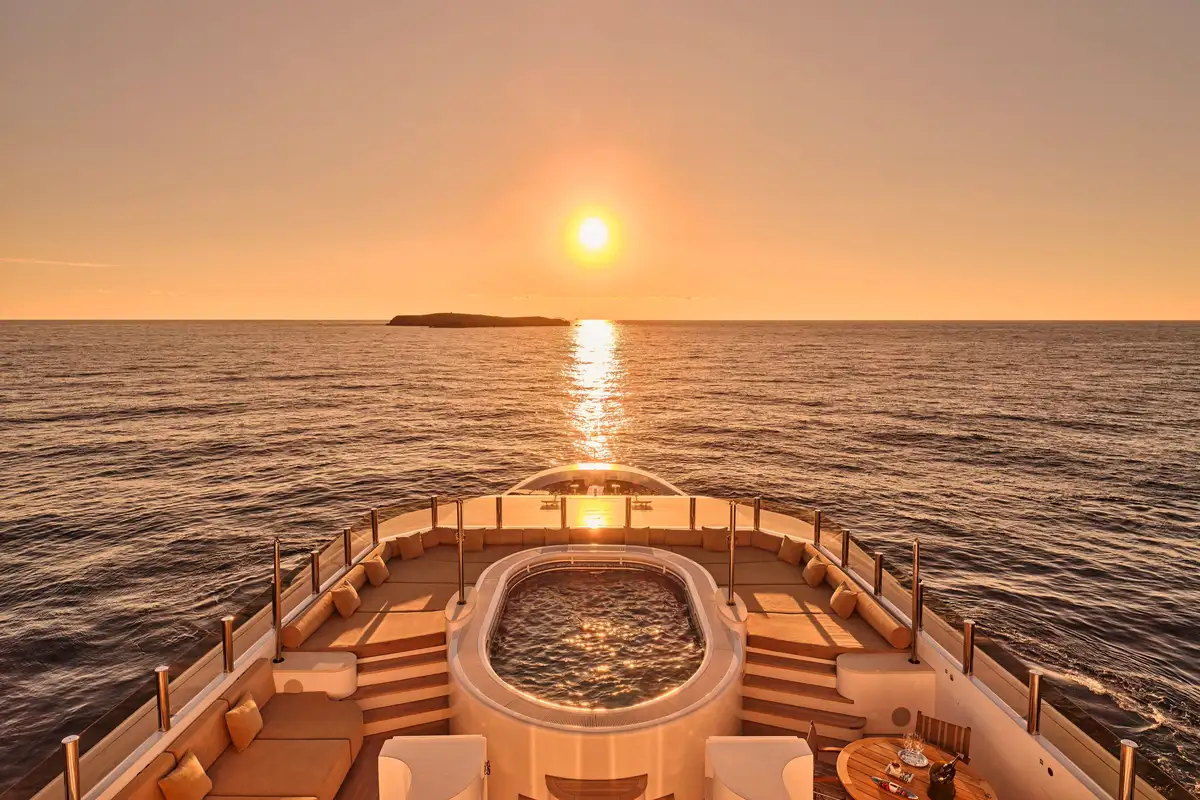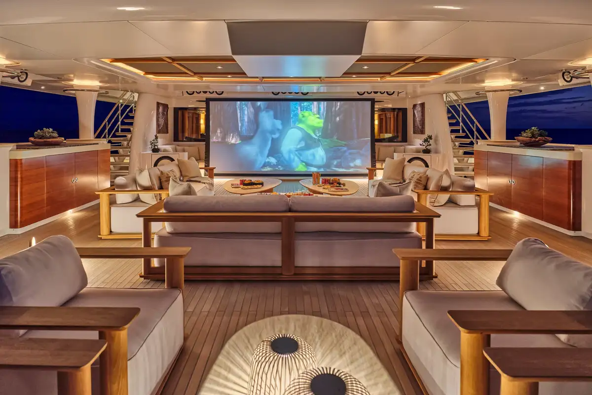Picture yourself unwinding in the sun deck’s expansive jacuzzi, soaking in panoramic views surrounded by plush sun pads. As the sun sets, retreat to the aft deck for an intimate al fresco dinner, prepared by your private chef and served under the stars. The bridge deck offers yet another inviting social space, where you can sip cocktails at the bar, challenge friends to a game, or settle in for an unforgettable open-air movie night with Dolby surround sound.