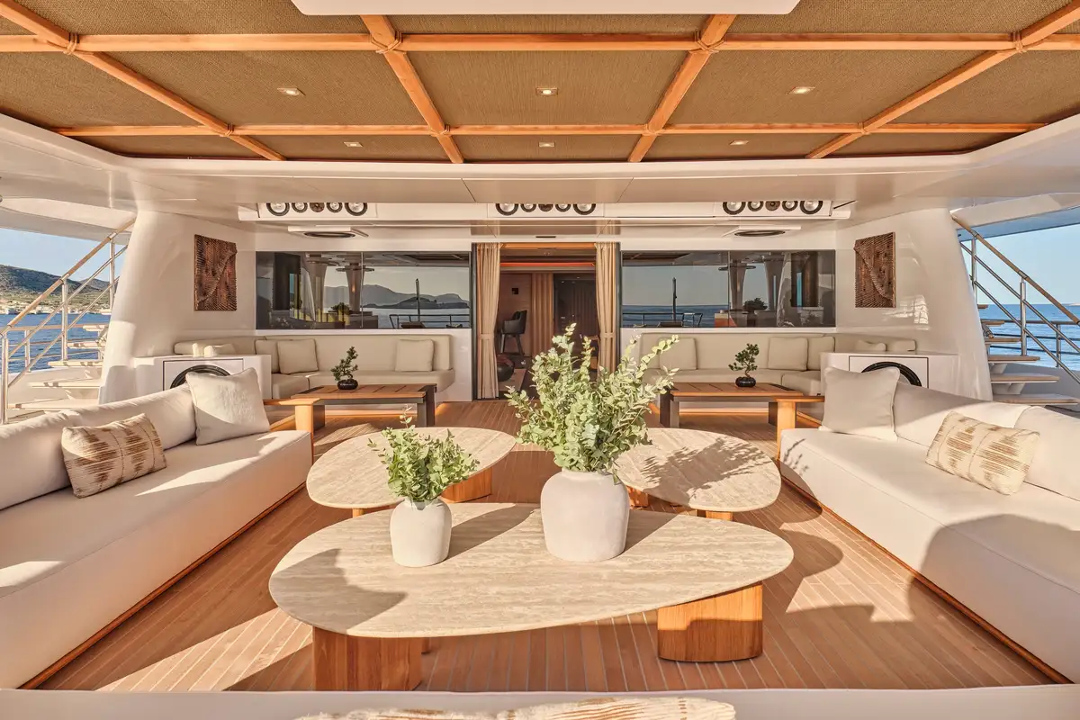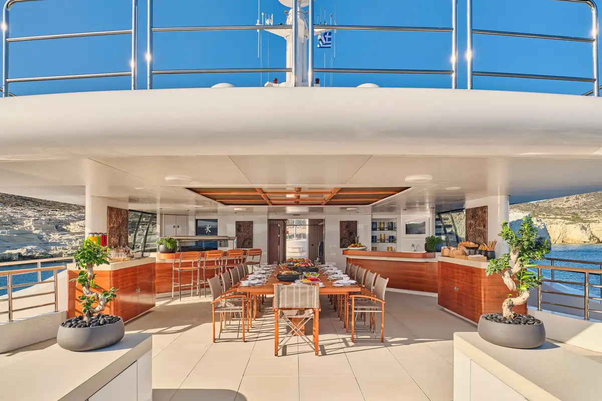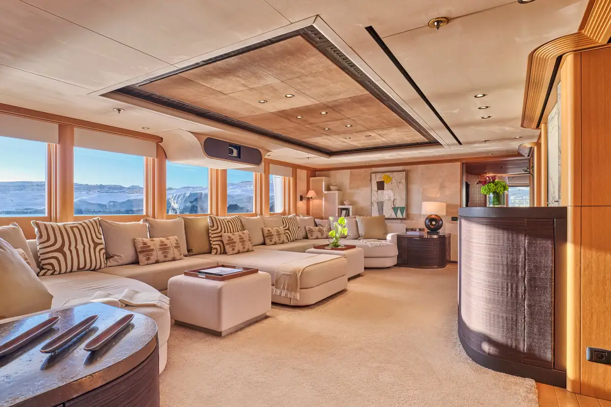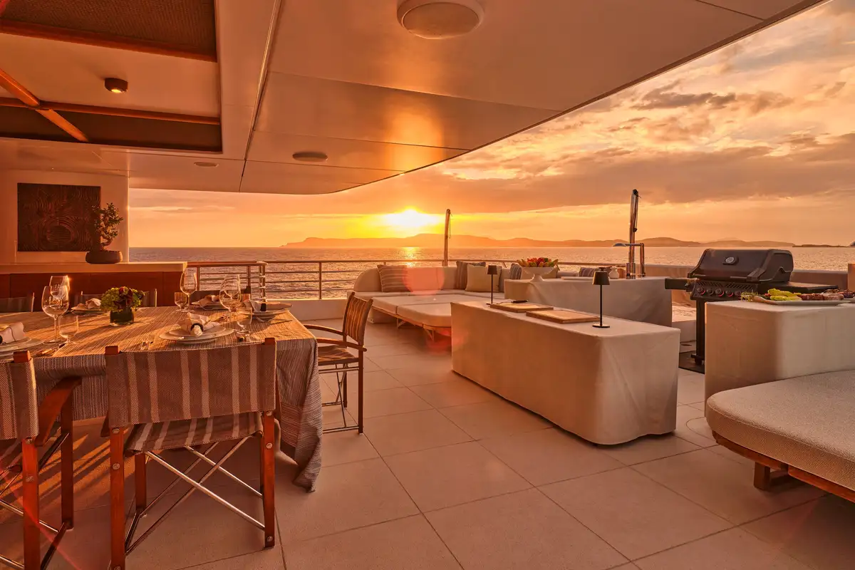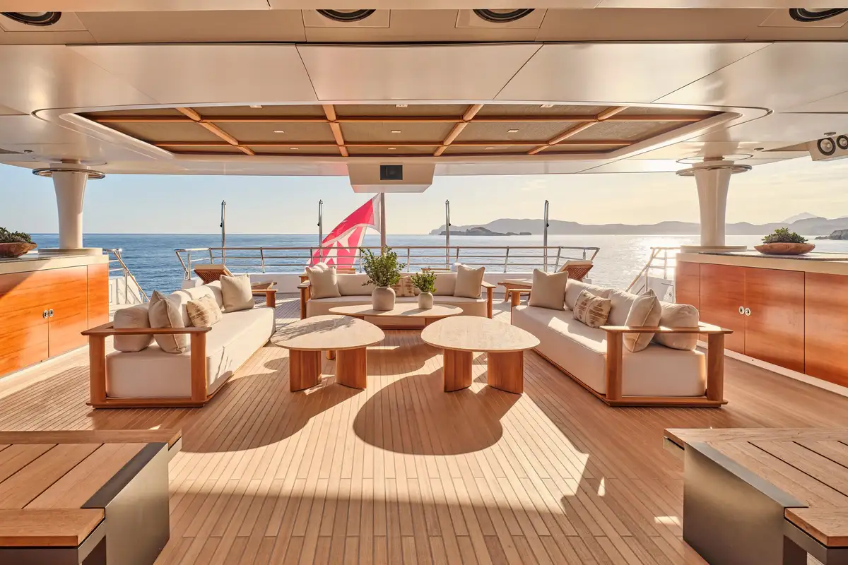 Picture yourself unwinding in the sun deck’s expansive jacuzzi, soaking in panoramic views surrounded by plush sun pads. As the sun sets, retreat to the aft deck for an intimate al fresco dinner, prepared by your private chef and served under the stars. The bridge deck offers yet another inviting social space, where you can sip cocktails at the bar, challenge friends to a game, or settle in for an unforgettable open-air movie night with Dolby surround sound.