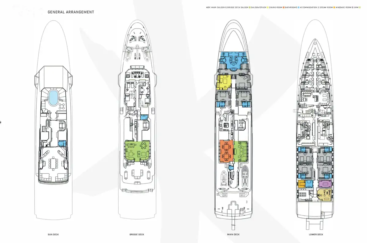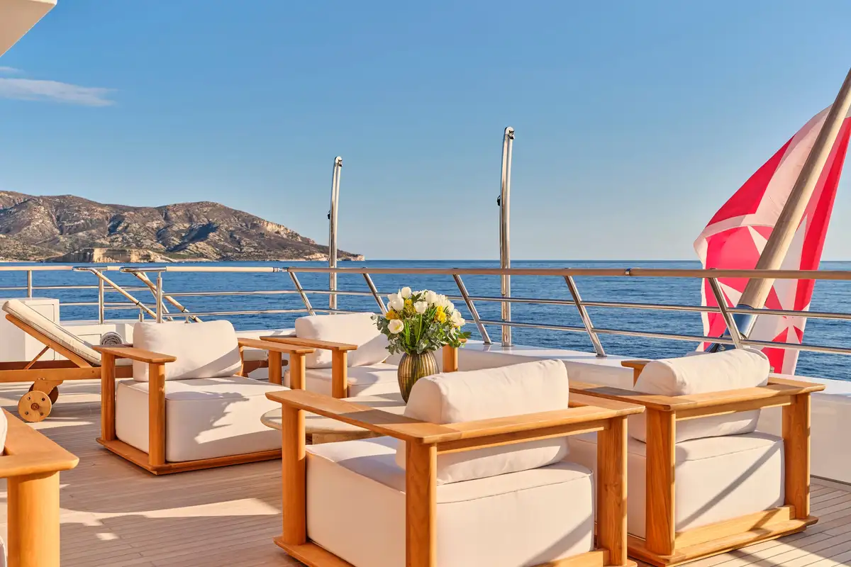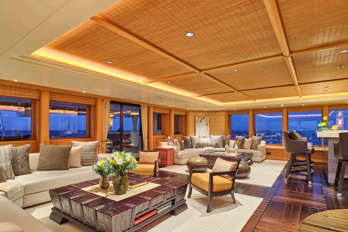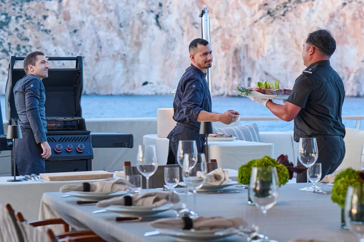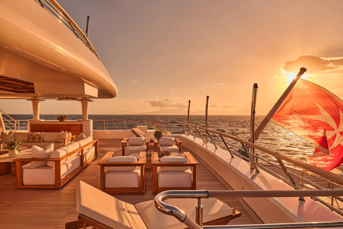 Picture yourself unwinding in the sun deck’s expansive jacuzzi, soaking in panoramic views surrounded by plush sun pads. As the sun sets, retreat to the aft deck for an intimate al fresco dinner, prepared by your private chef and served under the stars. The bridge deck offers yet another inviting social space, where you can sip cocktails at the bar, challenge friends to a game, or settle in for an unforgettable open-air movie night with Dolby surround sound.