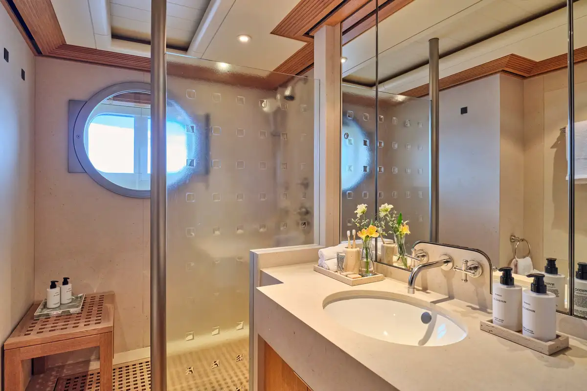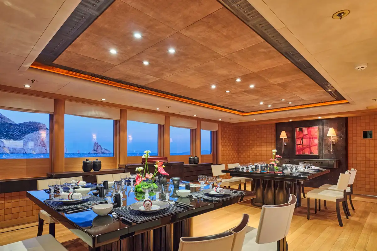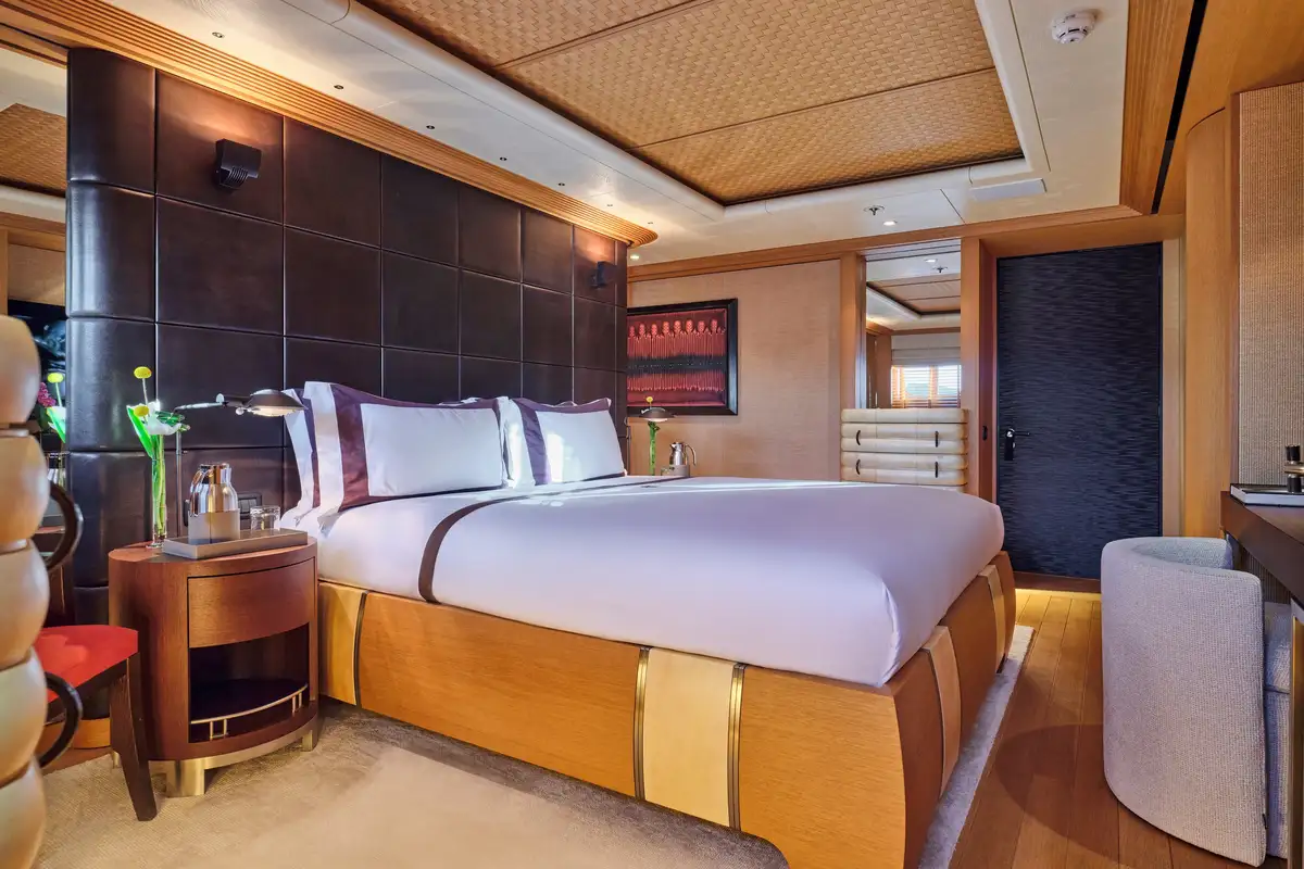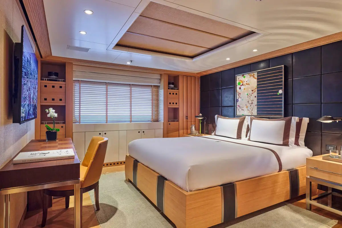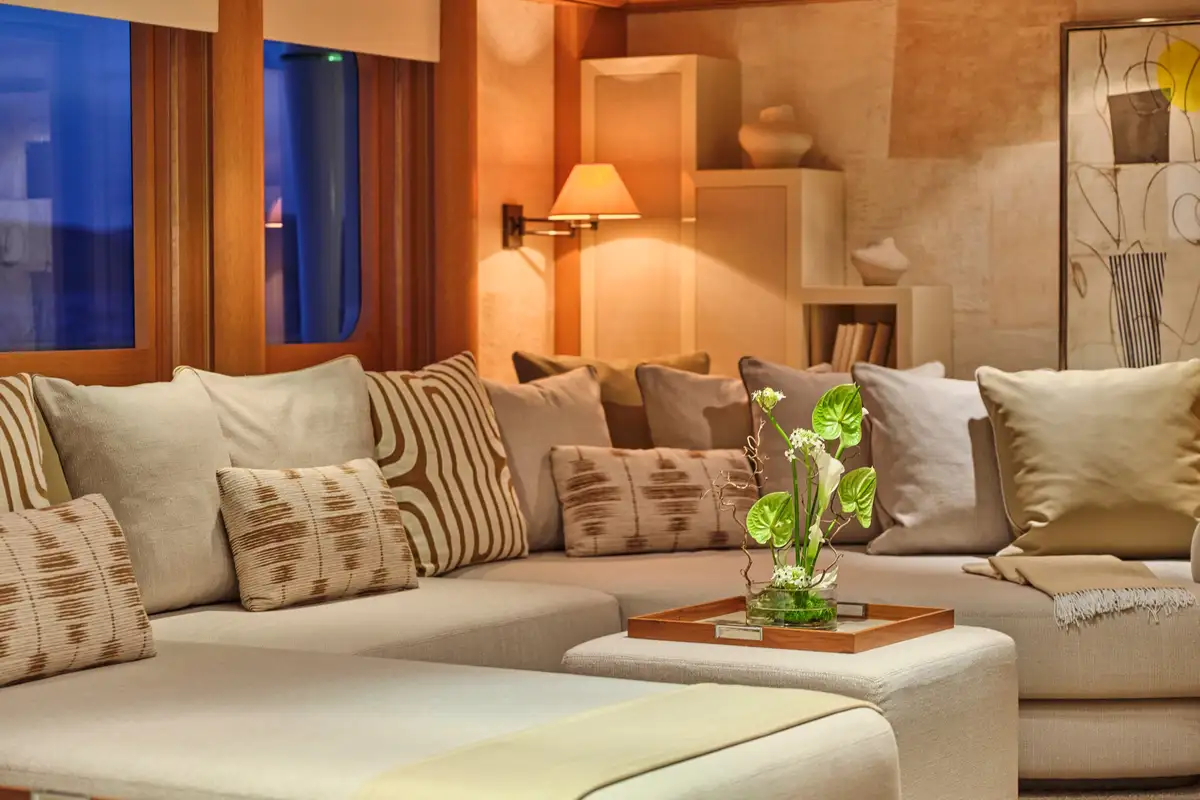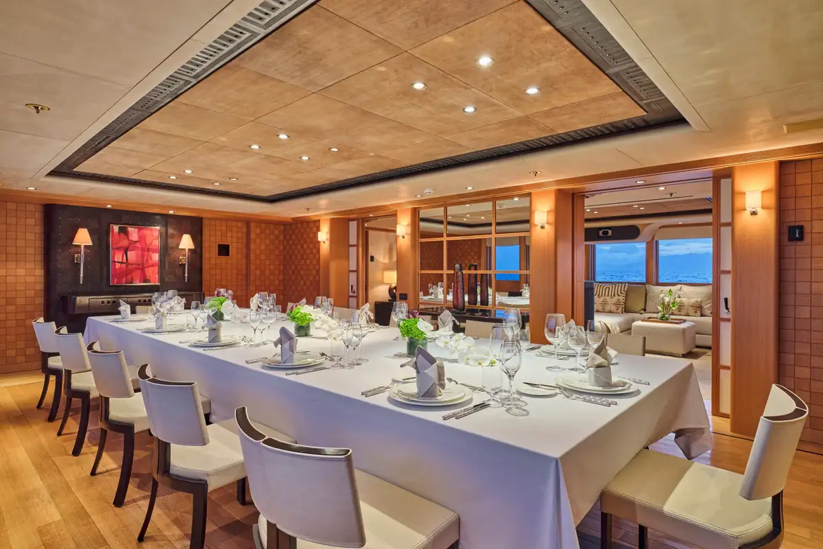 The primary charter guest will enjoy find respite in the opulent master suite – a vast, light-filled sanctuary complete with a private lounge and study area, his-and-hers walk-in wardrobes, and en suite bathroom. Guests will enjoy equal comfort in KOGO’s six beautifully appointed cabins – two double cabins on the main deck, and two further double cabins and two twin cabins on the lower deck – ensuring that every moment of rest is as indulgent as the days spent exploring.