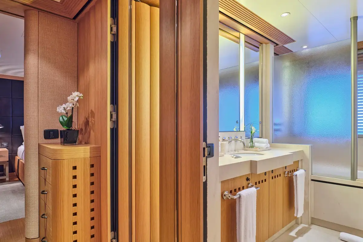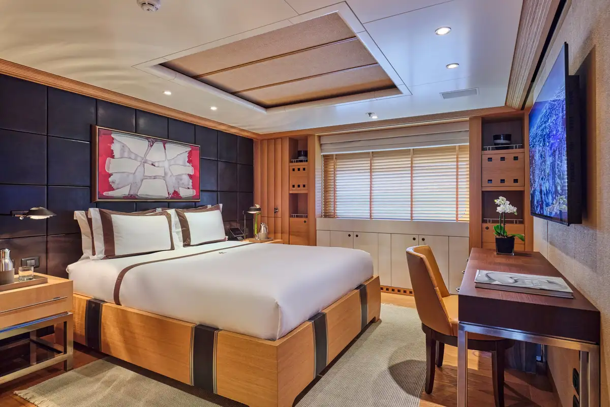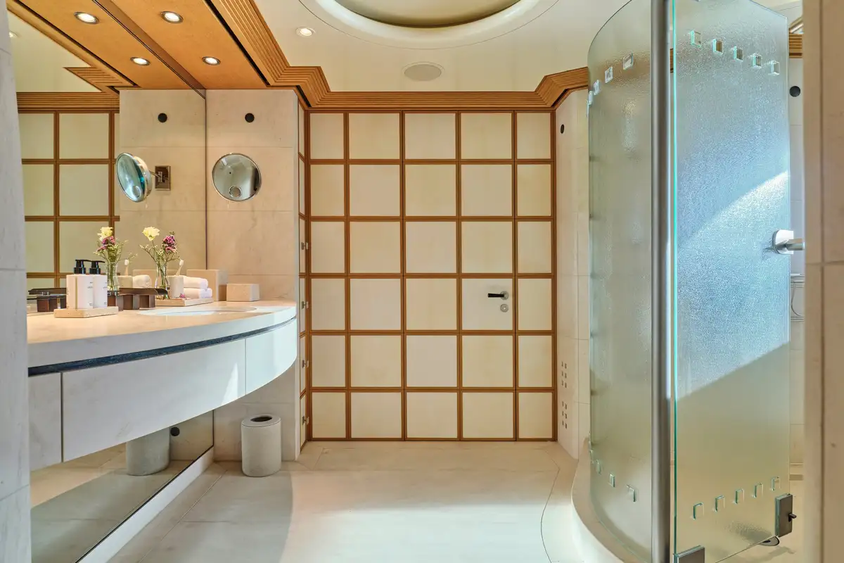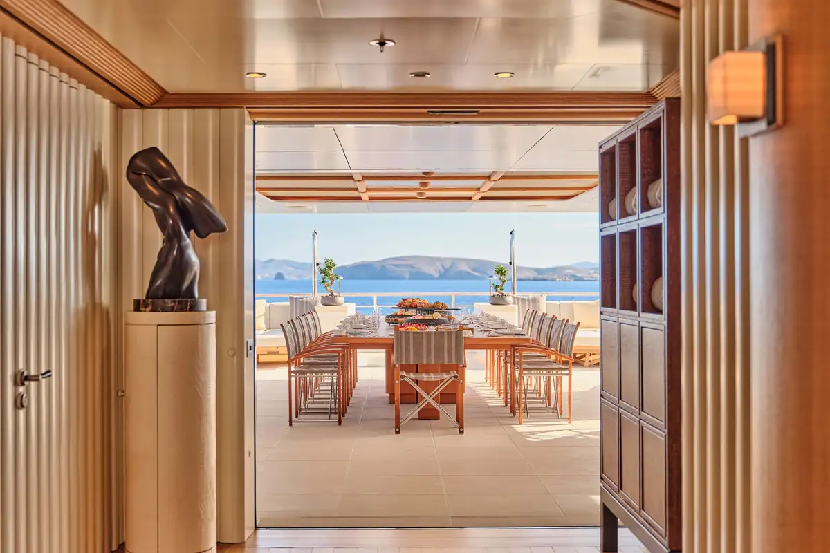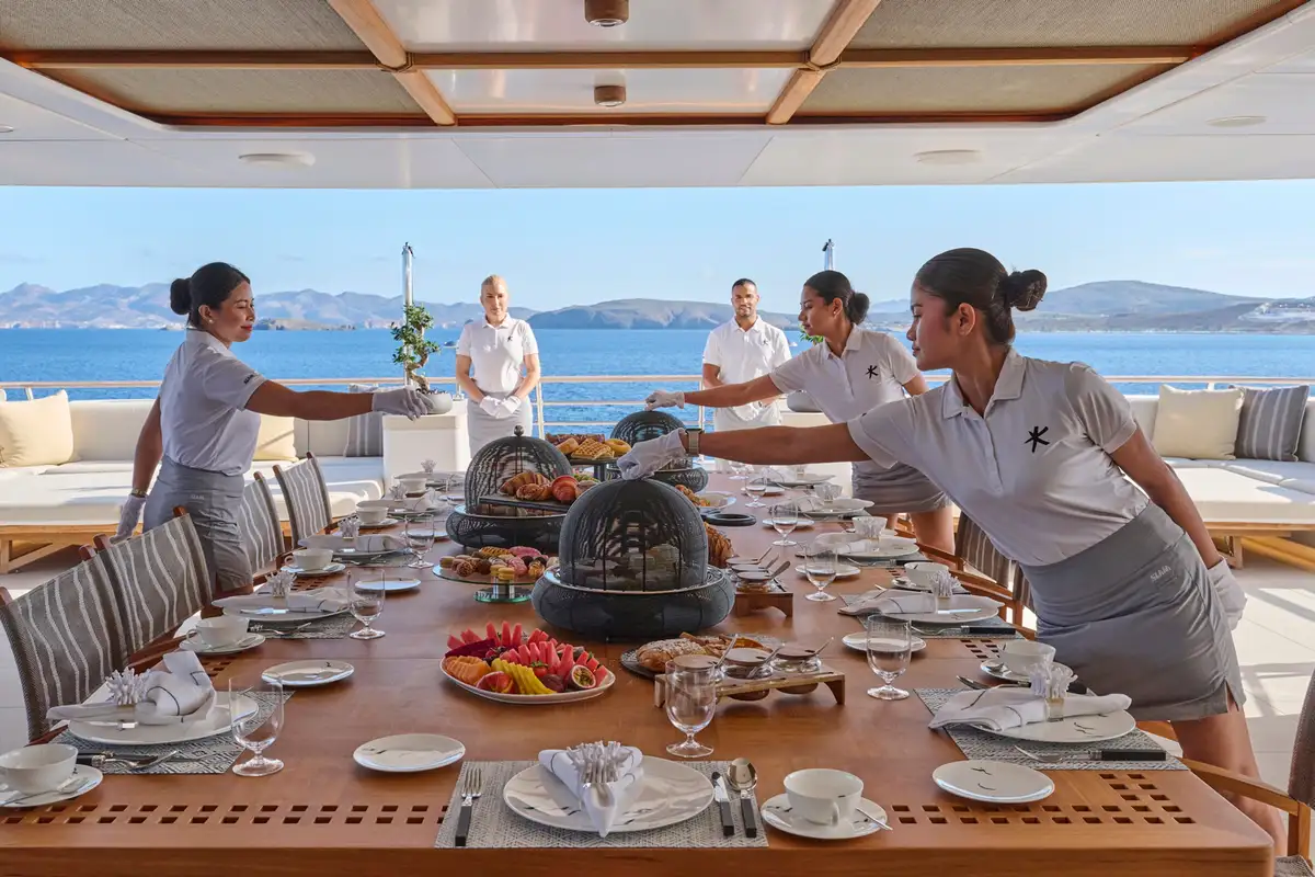 The primary charter guest will enjoy find respite in the opulent master suite – a vast, light-filled sanctuary complete with a private lounge and study area, his-and-hers walk-in wardrobes, and en suite bathroom. Guests will enjoy equal comfort in KOGO’s six beautifully appointed cabins – two double cabins on the main deck, and two further double cabins and two twin cabins on the lower deck – ensuring that every moment of rest is as indulgent as the days spent exploring.