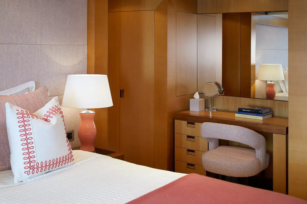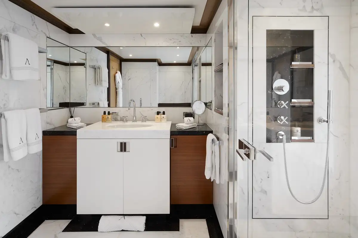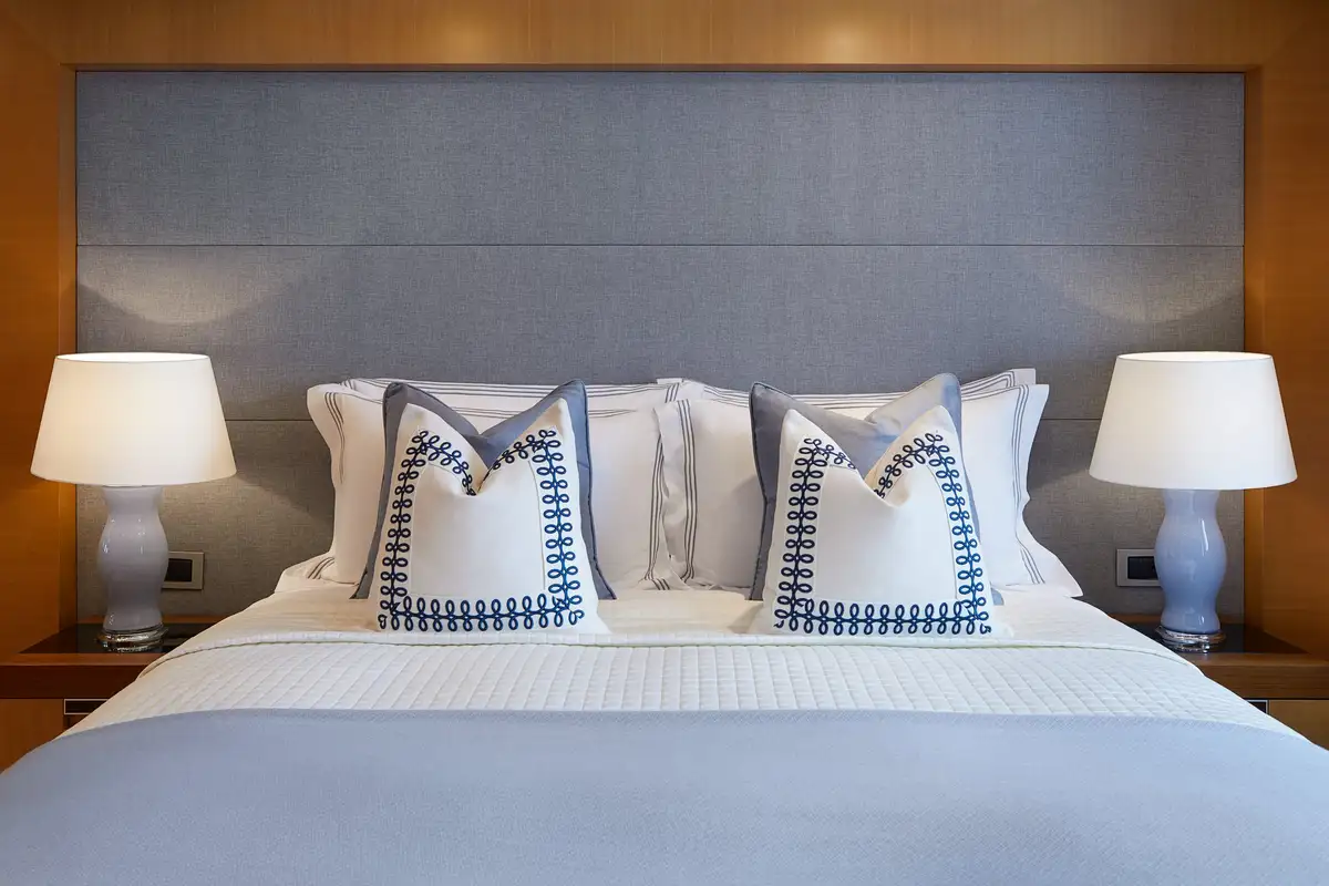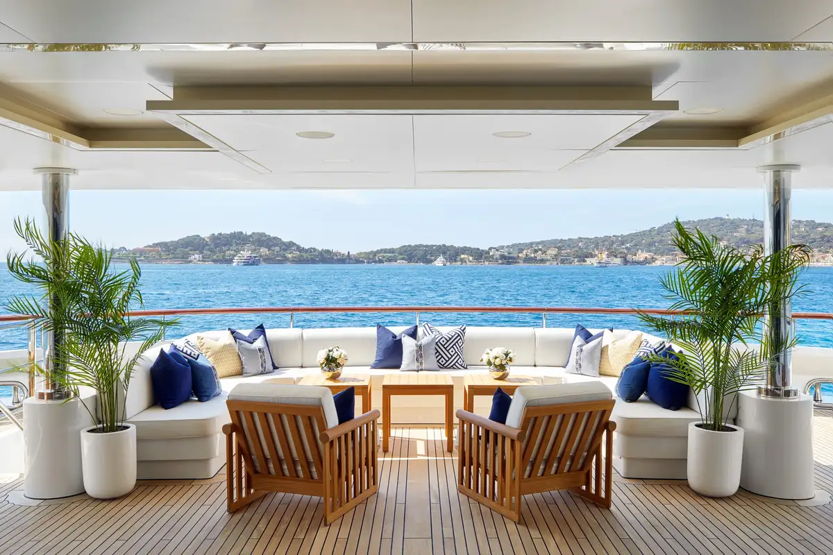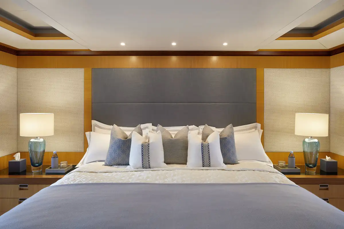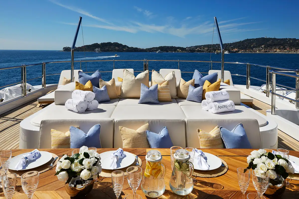 There's a full-beam master cabin on the main deck, a VIP double/twin on the upper deck while two twin cabins, each with a pullman, and two double cabins on the lower deck, complete adaptable family-friendly accommodation for 12 guests. Up to 15 crew are always on hand to make sure their charter experience is unforgettable.