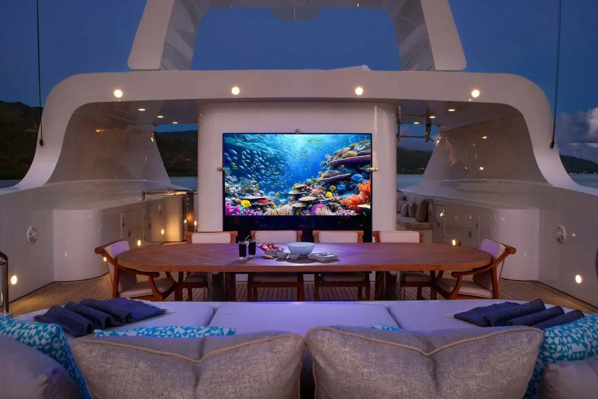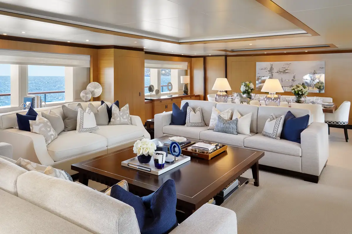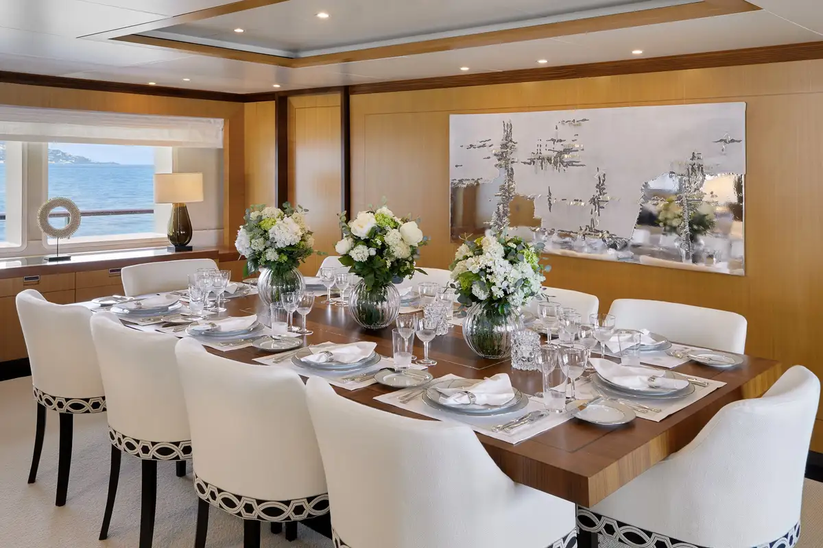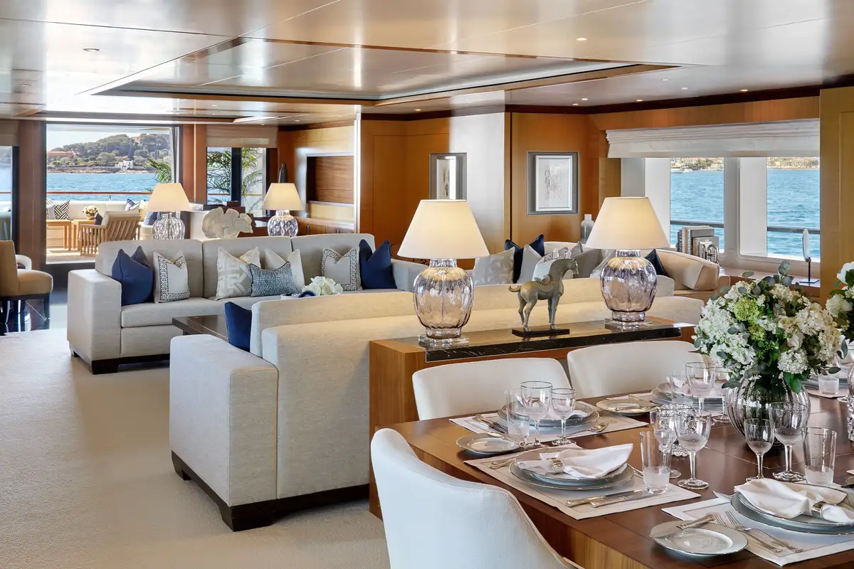 Following a 2019 refurb that included upgrades to AV and IT equipment, LA BLANCA's interiors are pristine, restful and welcoming. Living areas are split into convivial lounges on the main and upper decks, with a 4K home cinema in the main deck lounge complete with a formal dining room. It's all beautifully lit - and spectacular views are delivered - by large picture windows throughout.