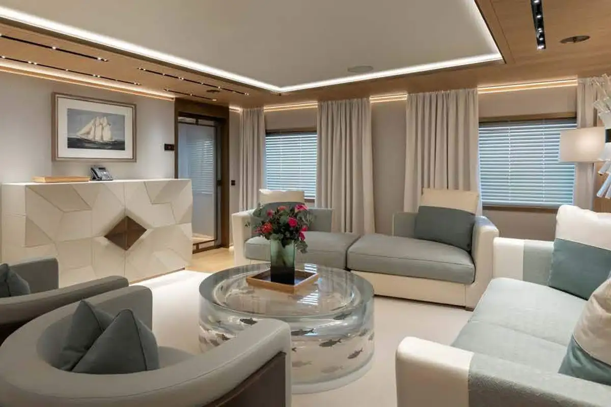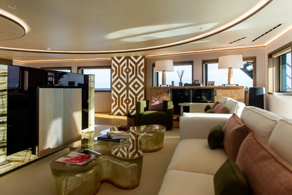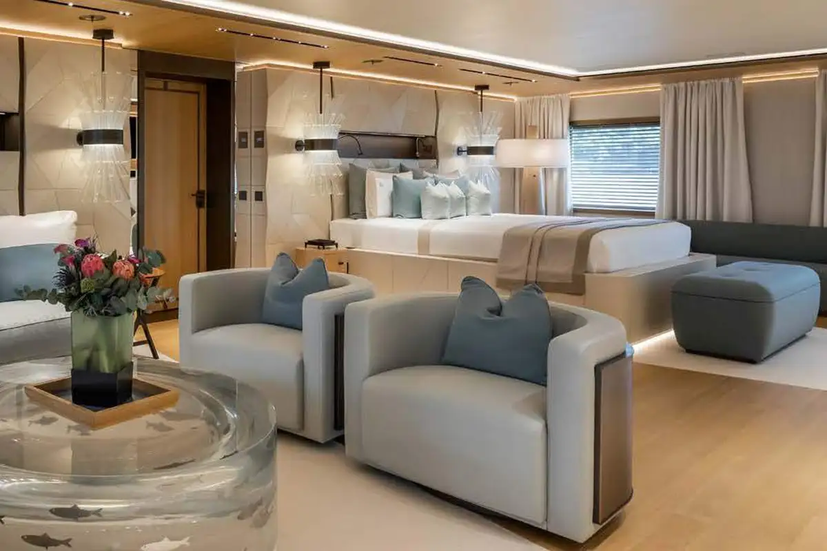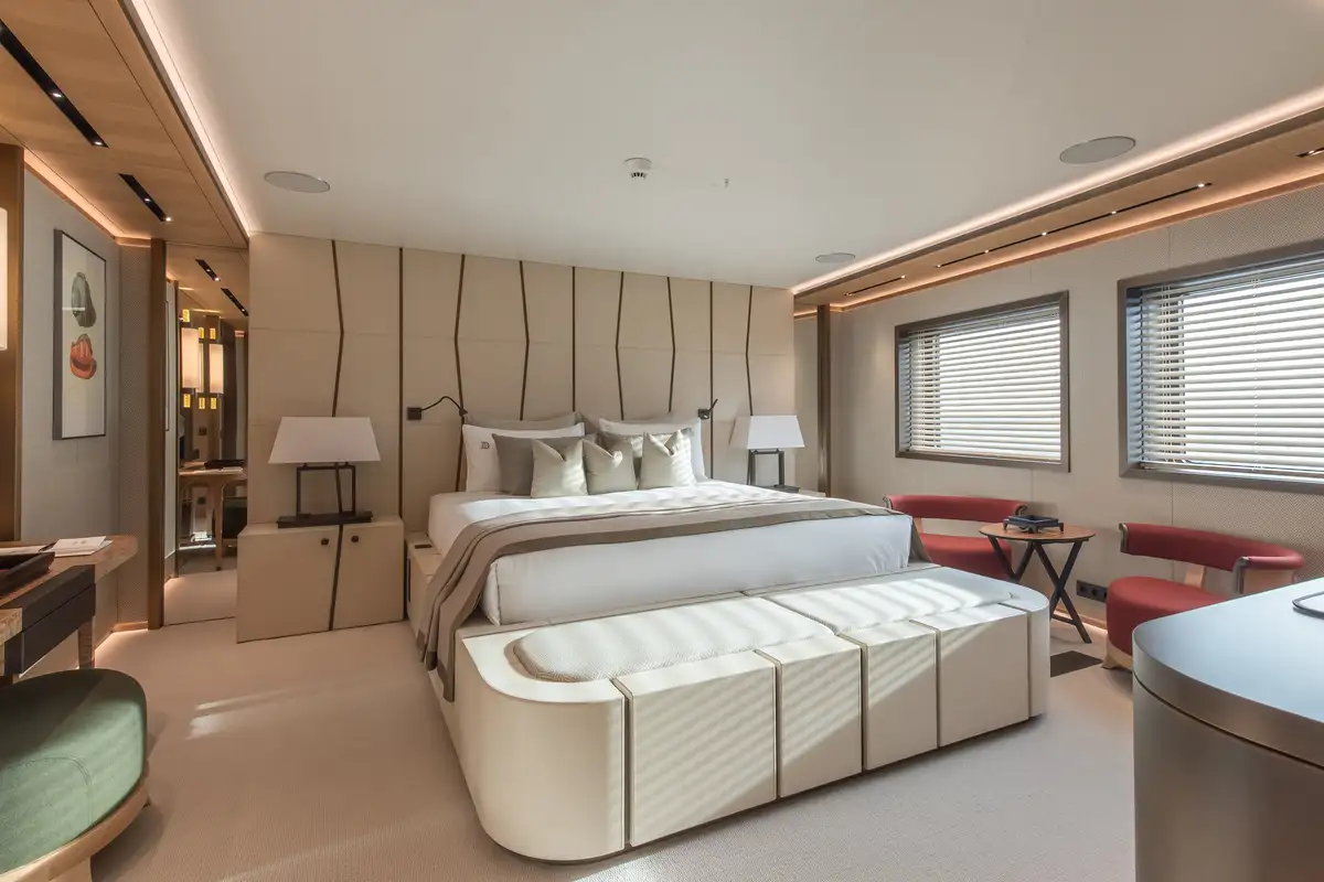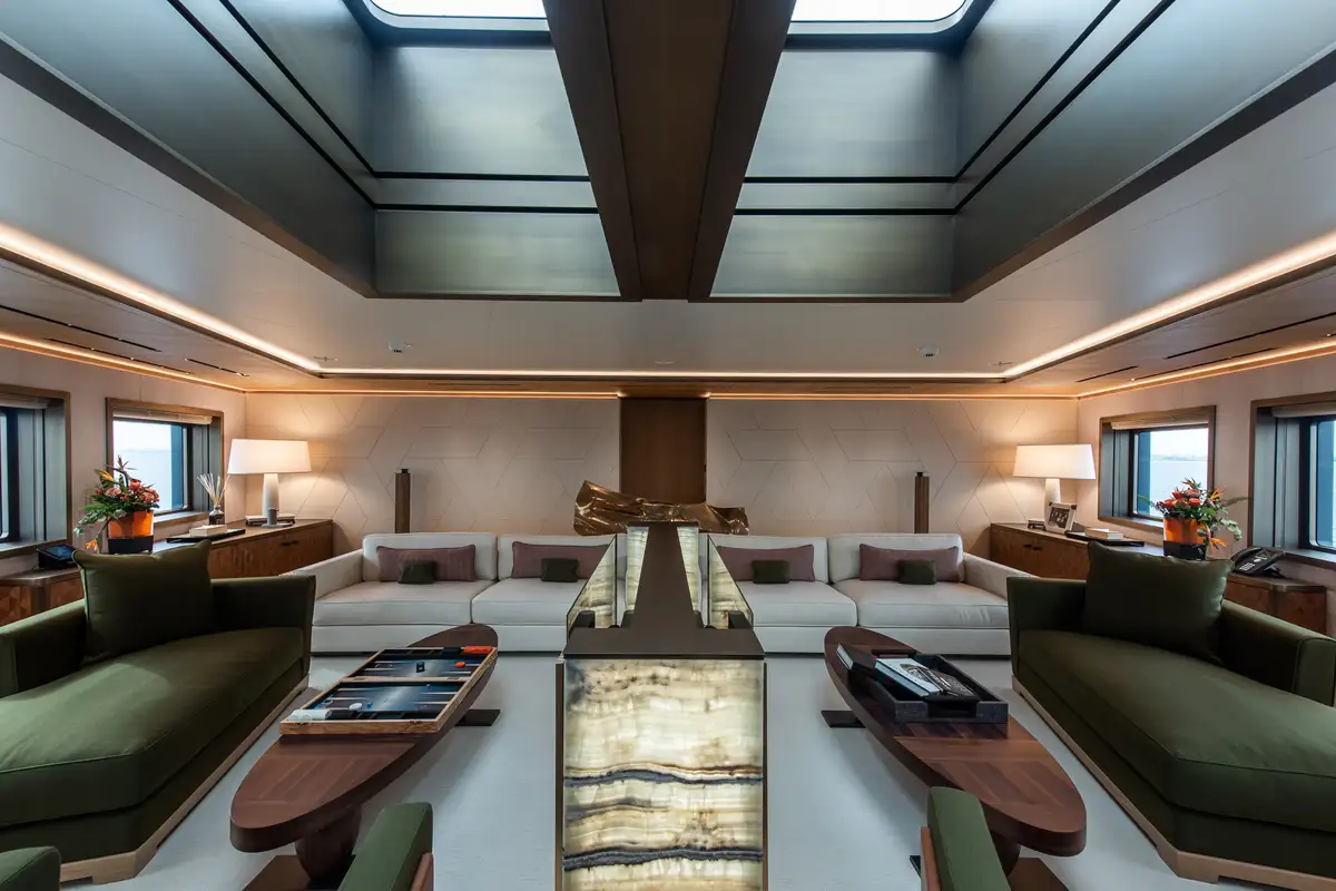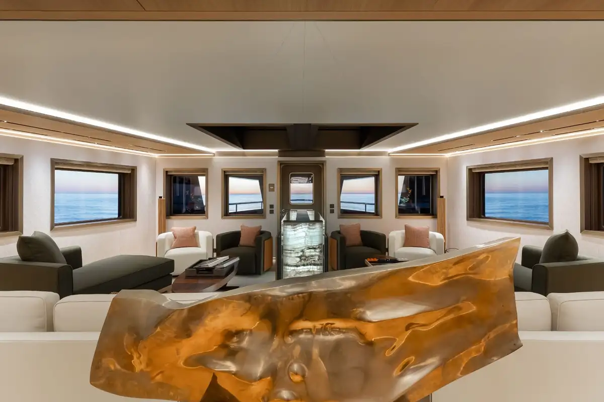 LA DATCHA accommodates up to 12 guests in two spacious master suites, a VIP suite and three double cabins. Her interior creates a relaxed, refined ambiance using muted tones and natural materials like backlit stone alongside striking abstract sculptures.
