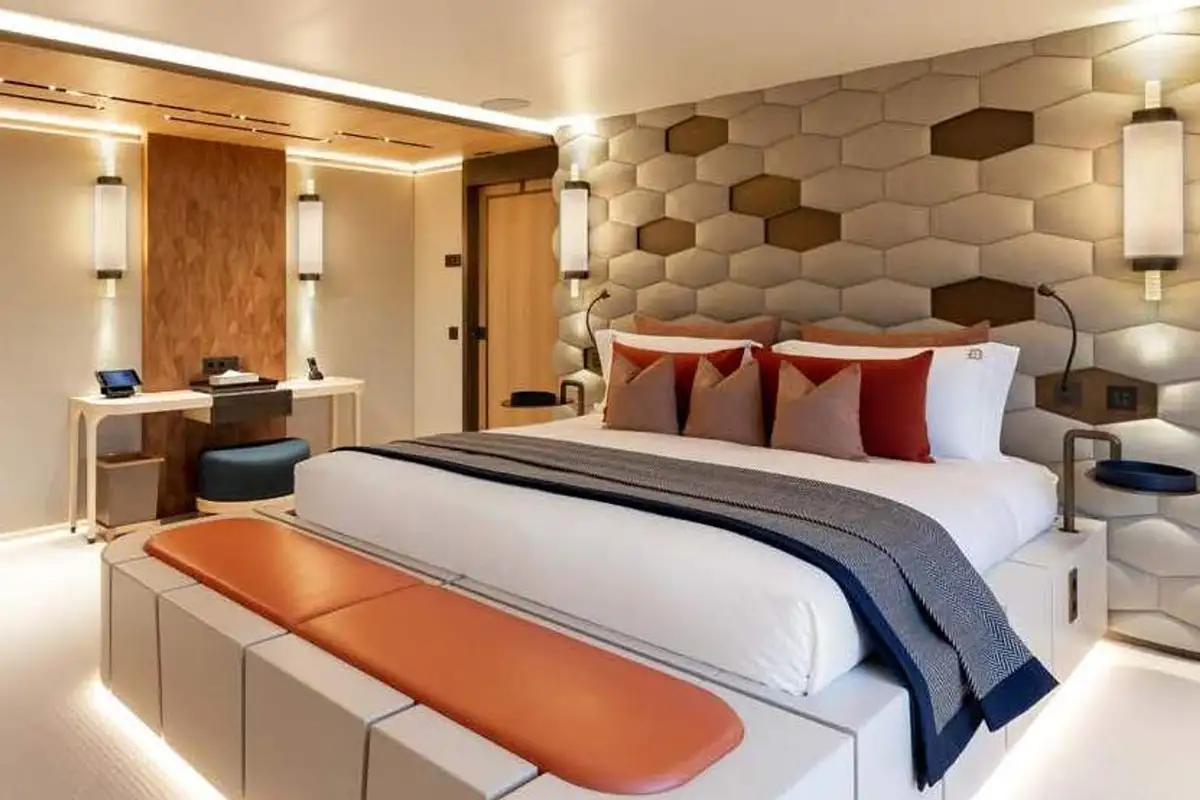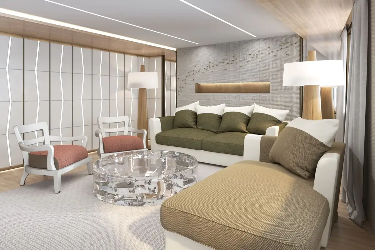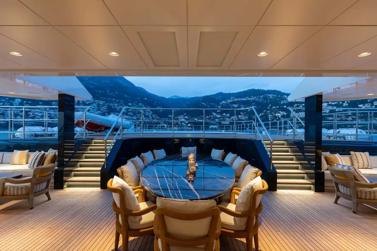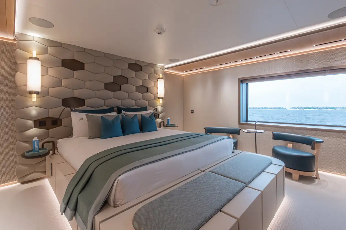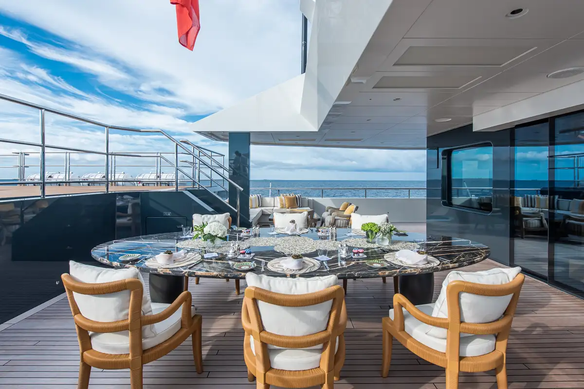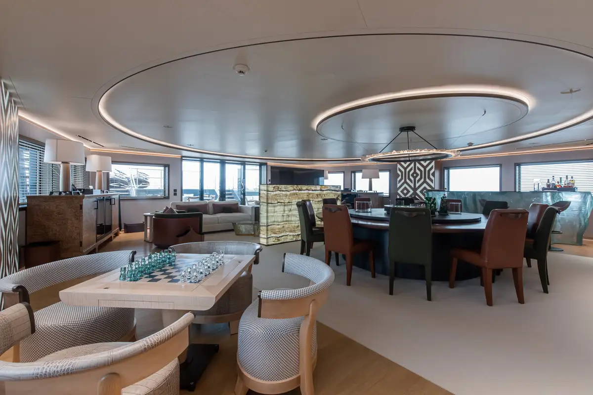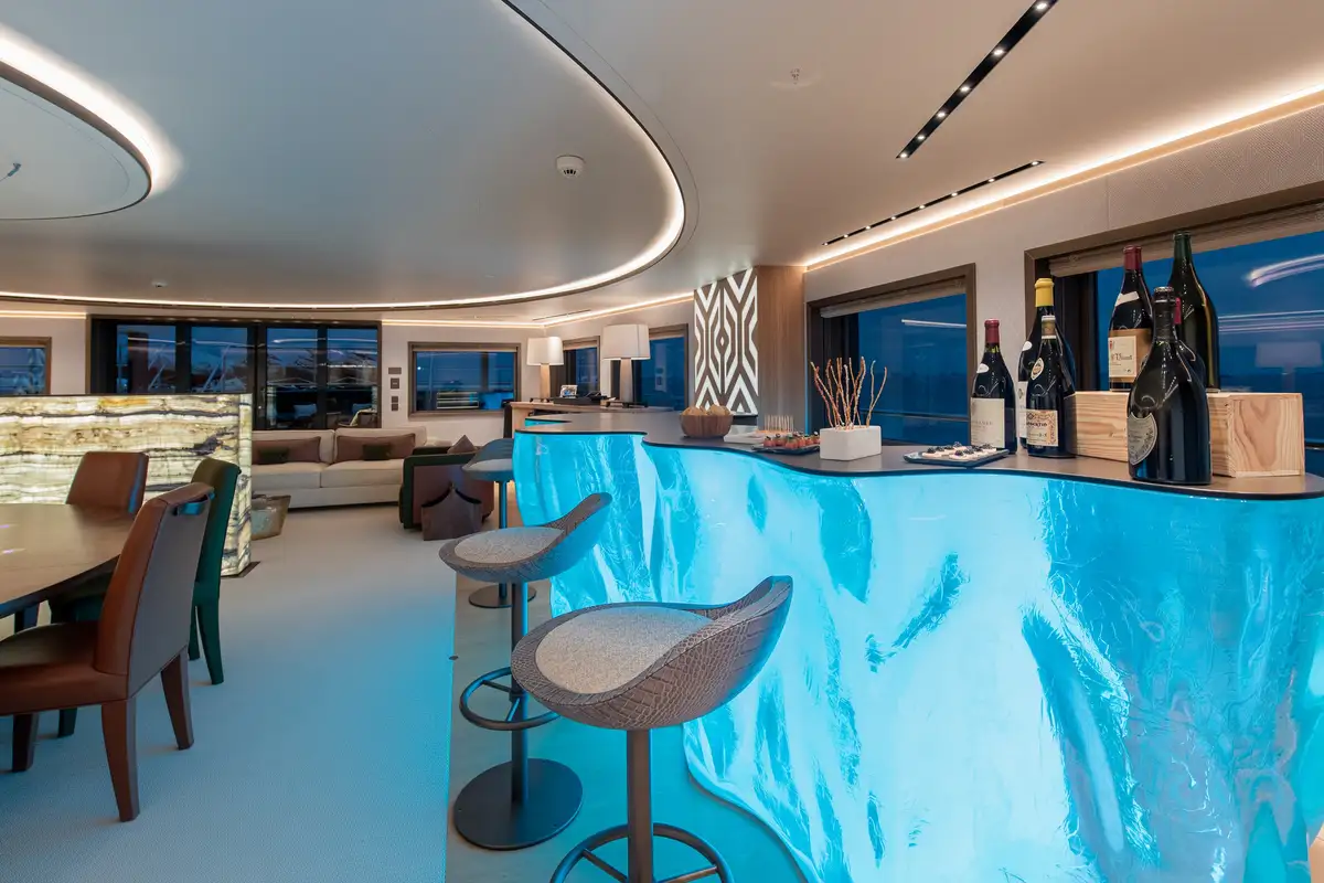 LA DATCHA accommodates up to 12 guests in two spacious master suites, a VIP suite and three double cabins. Her interior creates a relaxed, refined ambiance using muted tones and natural materials like backlit stone alongside striking abstract sculptures.