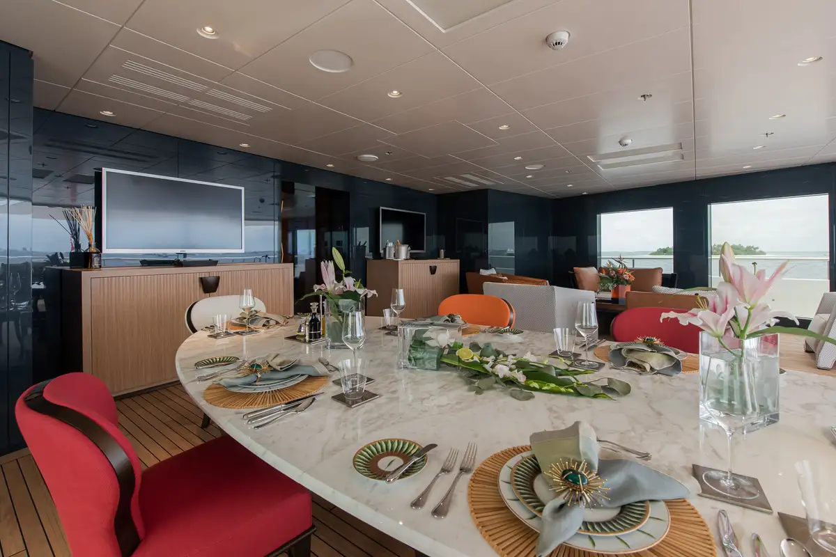 Sundowners are served on the upper deck aft, with the infinite stars gradually appearing as a backdrop. Move inside to enjoy dinner at the main lounge’s dining table, with built-in fire features providing an atmospheric glow, while you discuss the day’s epic adventures and dream up what tomorrow might bring.