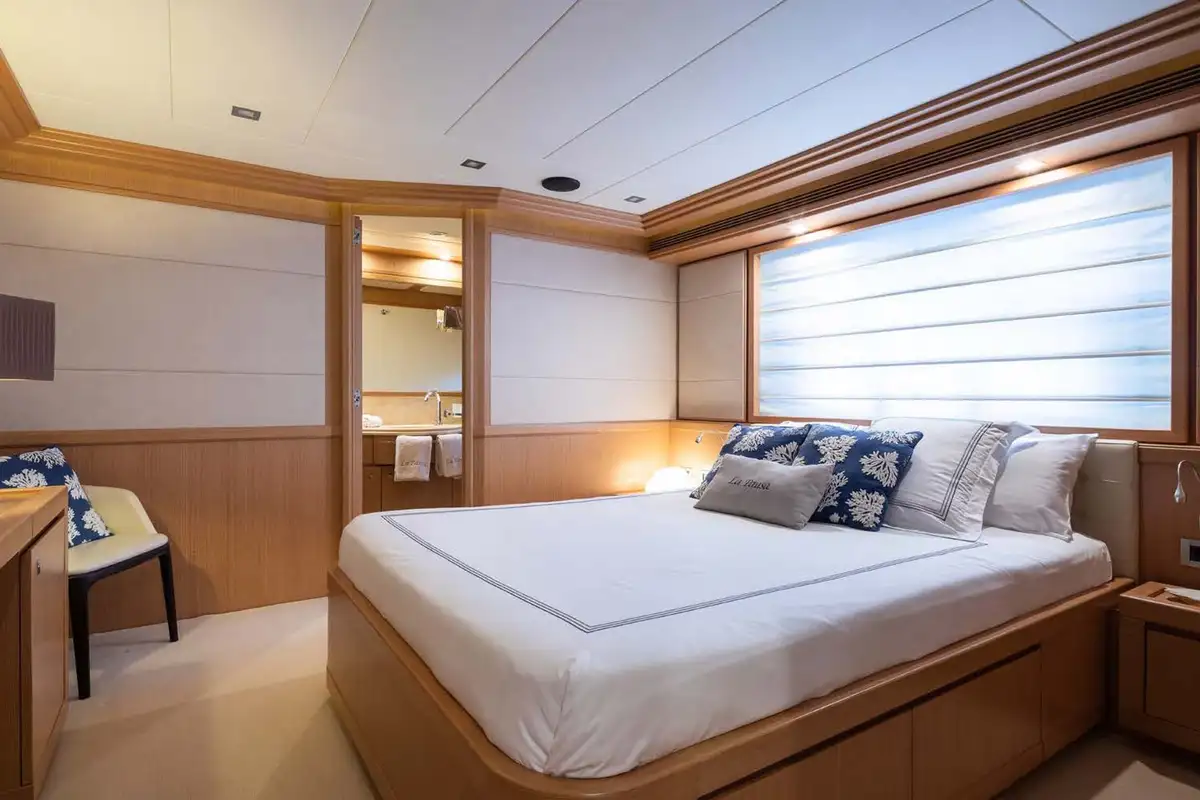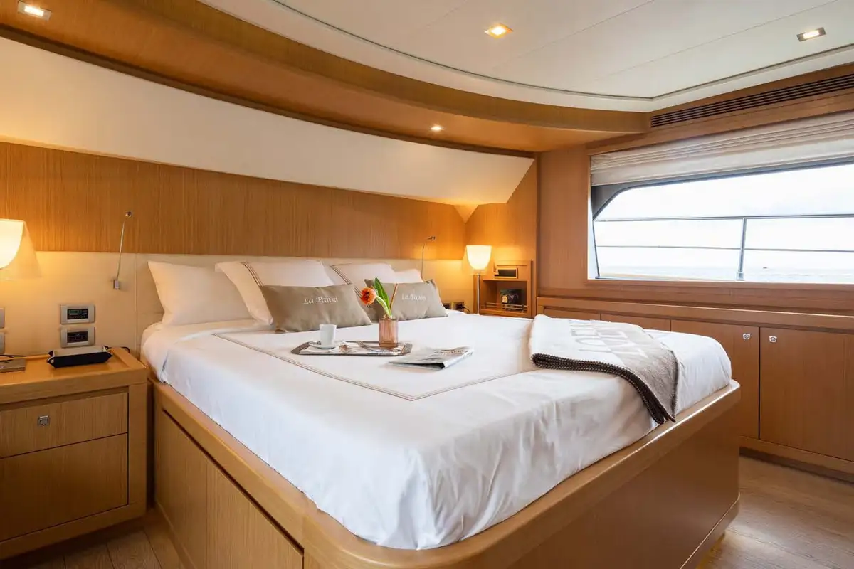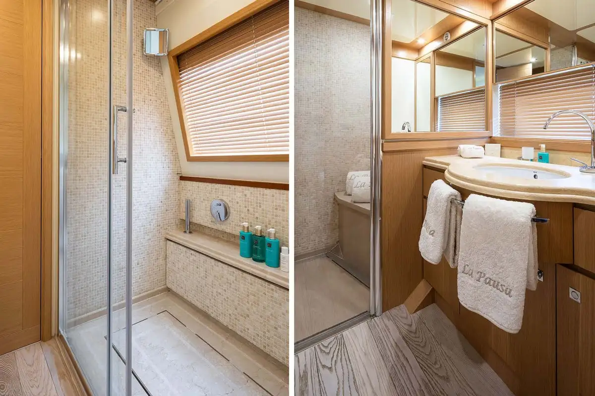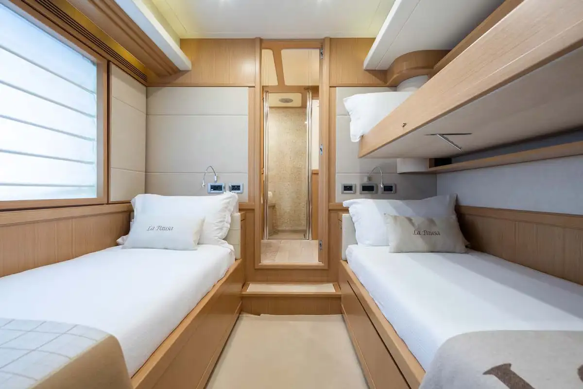 LA PAUSA comfortably accommodates 10 guests and can welcome up to 11 guests in total. The cabin configuration comprises the master suite, which is located on the main deck, a VIP double, and three twin cabins (each with an additional Pullman berth). All the accommodation is extremely spacious, and all cabins are en suite.