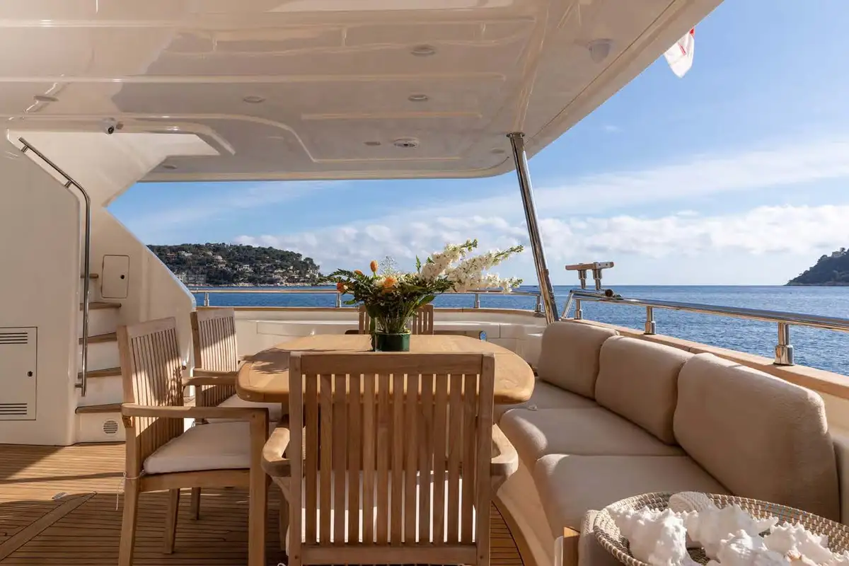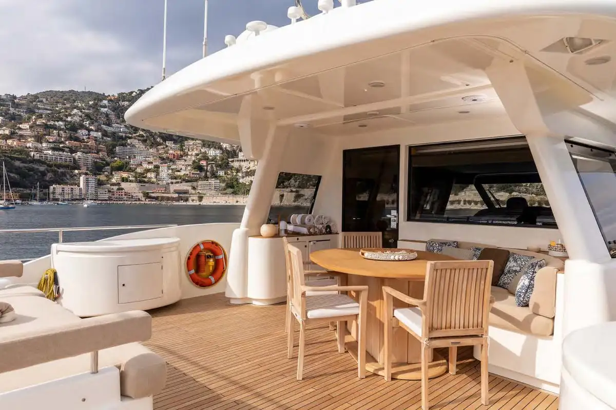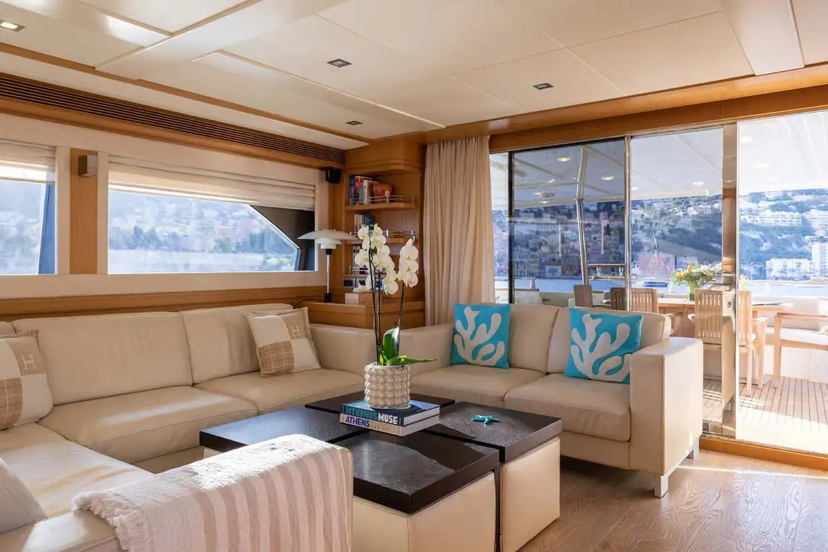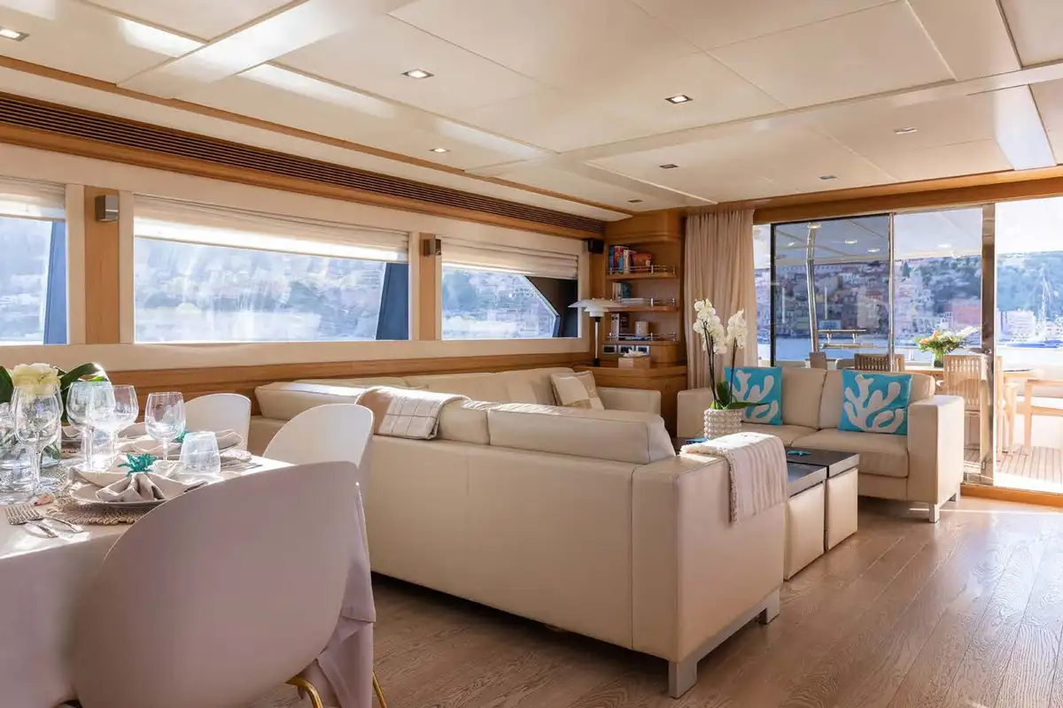 In the main saloon, large L-shaped sofas create an inviting lounge space, and this is open-plan to an interior dining area. Meals can also be enjoyed alfresco on the main deck to aft, or on the sun deck where there is a huge sun pad, which can be converted into another table for extended families.