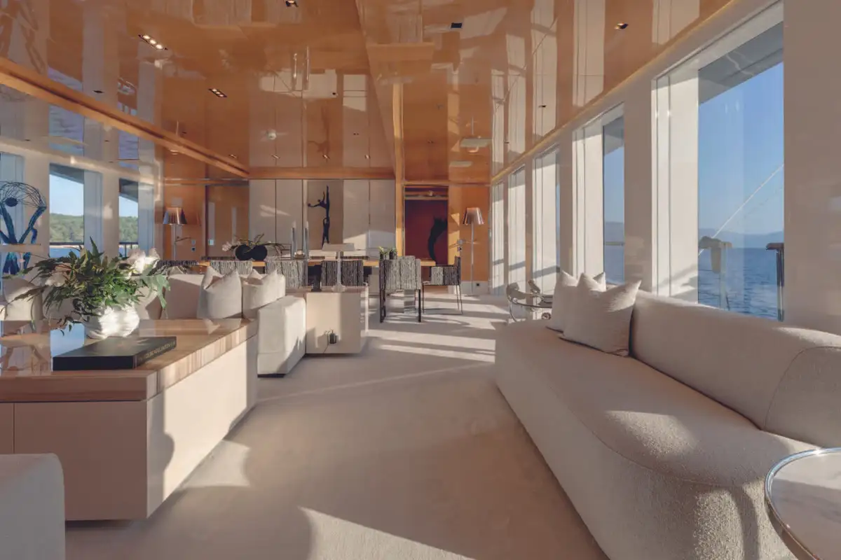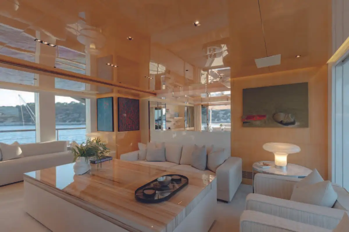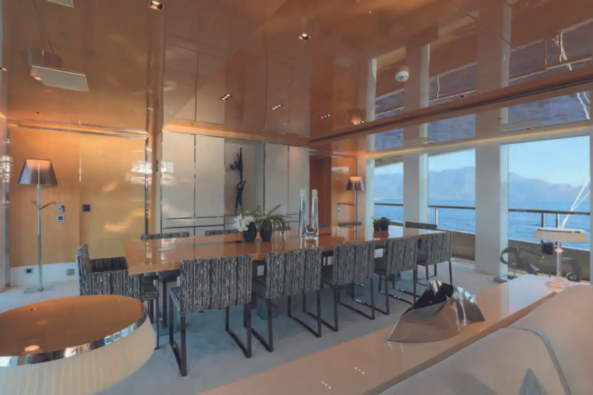 The main saloon itself is a showpiece of modern design; featuring white, chrome and blonde wood combined with low level furniture to create an open plan space. The relaxed dining table here has witnessed many a legendary dinner party.