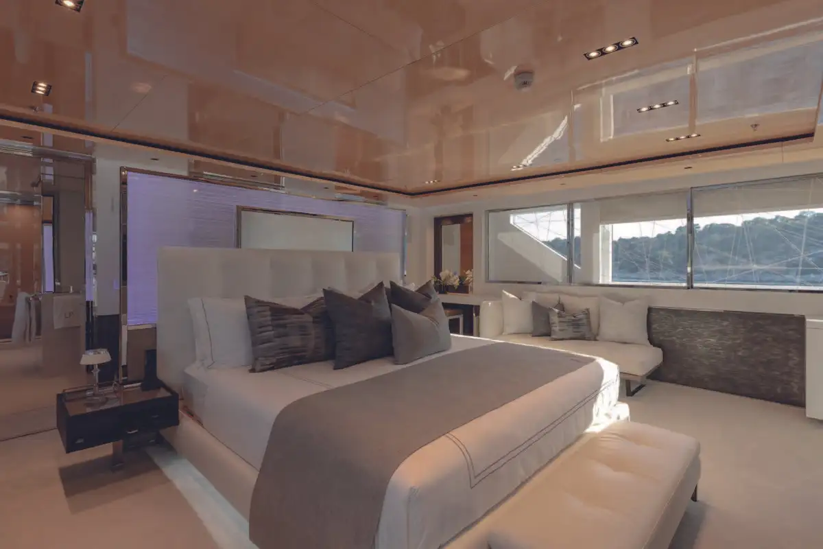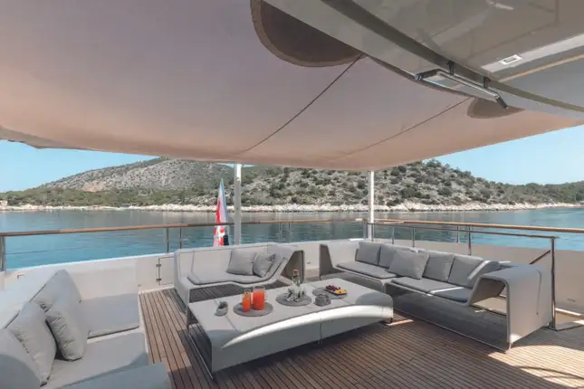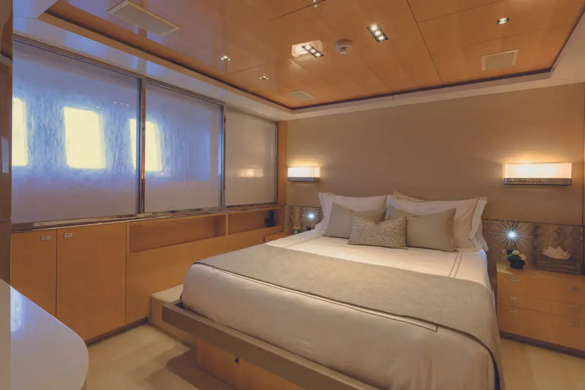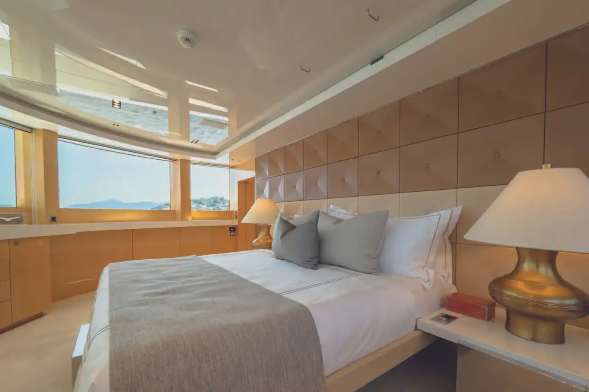 The exterior decks on this yacht offer exceptional outside space, so you will not feel crowded. The guest cabins will give your party an amazing charter – there’s a VIP suite on the forward main deck with 180-degree views forward and further cabins on the lower deck. All filled with natural light and the same modern décor.