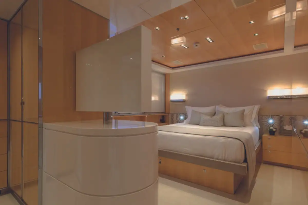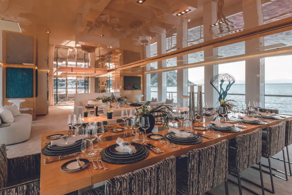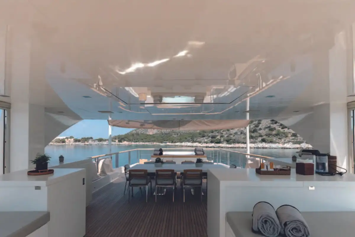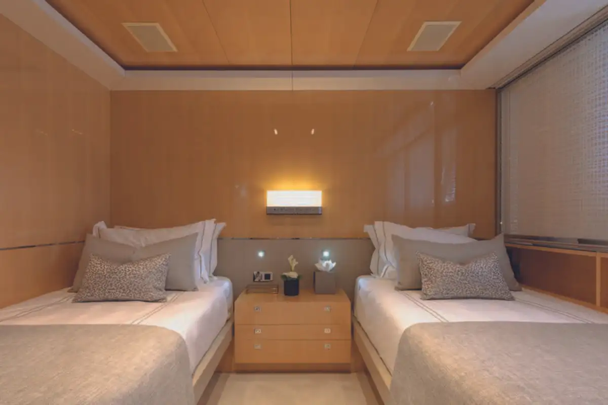 The exterior decks on this yacht offer exceptional outside space, so you will not feel crowded. The guest cabins will give your party an amazing charter – there’s a VIP suite on the forward main deck with 180-degree views forward and further cabins on the lower deck. All filled with natural light and the same modern décor.