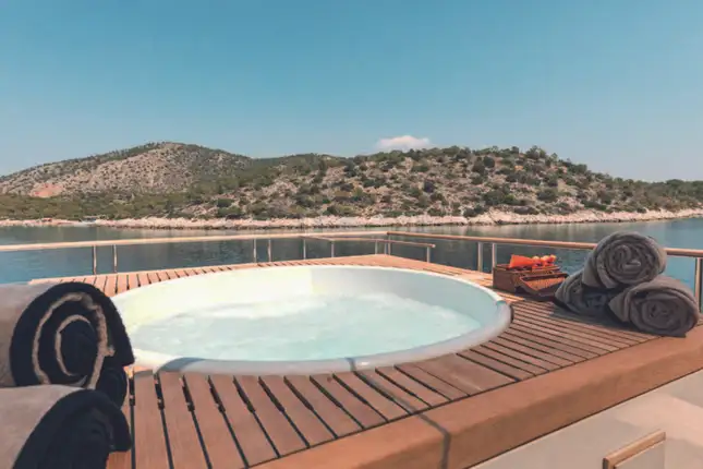 Sun worshippers will want to head to the top deck for the sunloungers and jacuzzi. Up here a central table next to the wet bar becomes the social hub to congregate over lunch. On the foredeck another table and banquette seating make a cosy nook to read or write.
