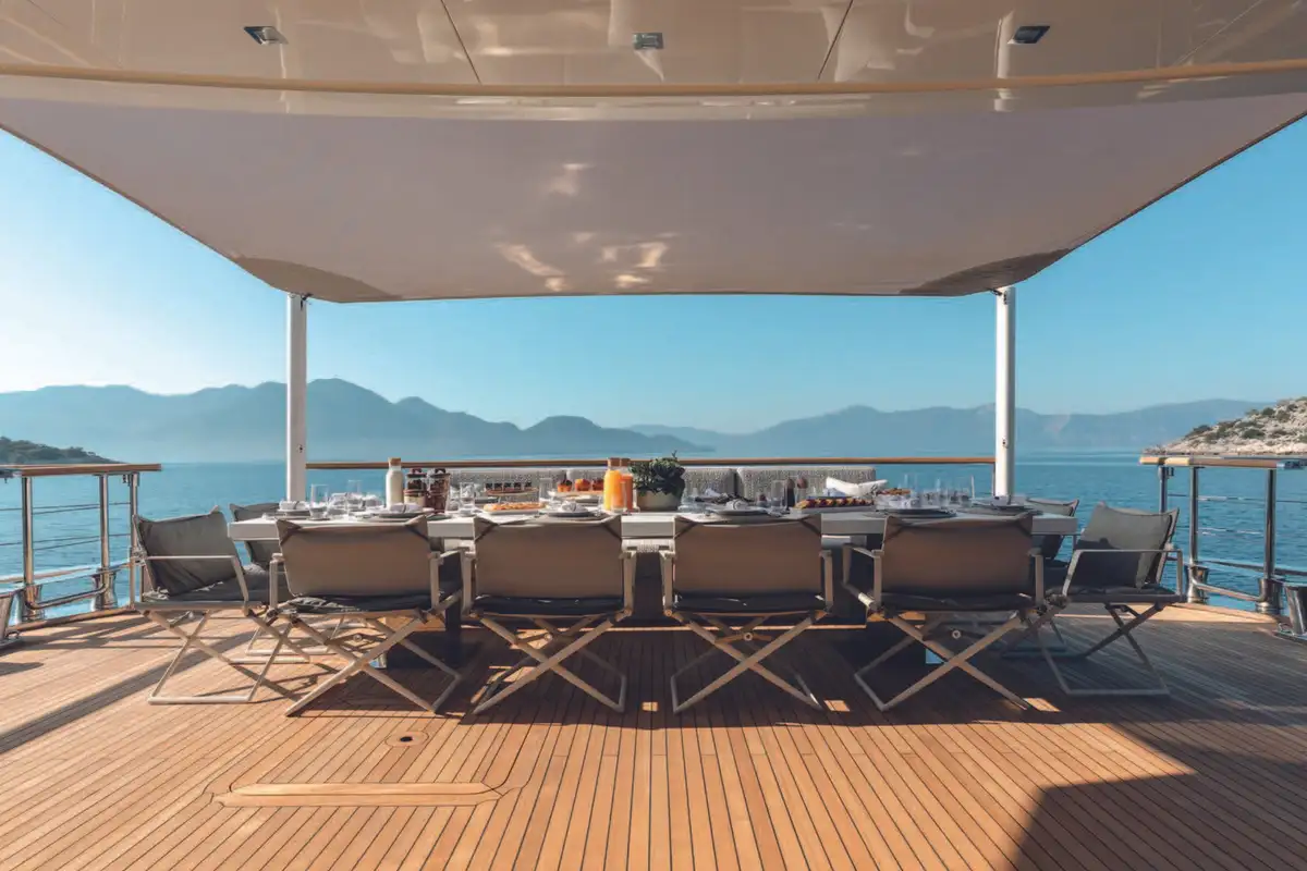Step down to breakfast under the shady awning on the aft main deck. Eleven crew, all with Silver Star training, are on hand during your charter – and chef is ready to get your day started right, whether that is Eggs Florentine, freshly-squeezed fruit juice or piles of fluffy pancakes.